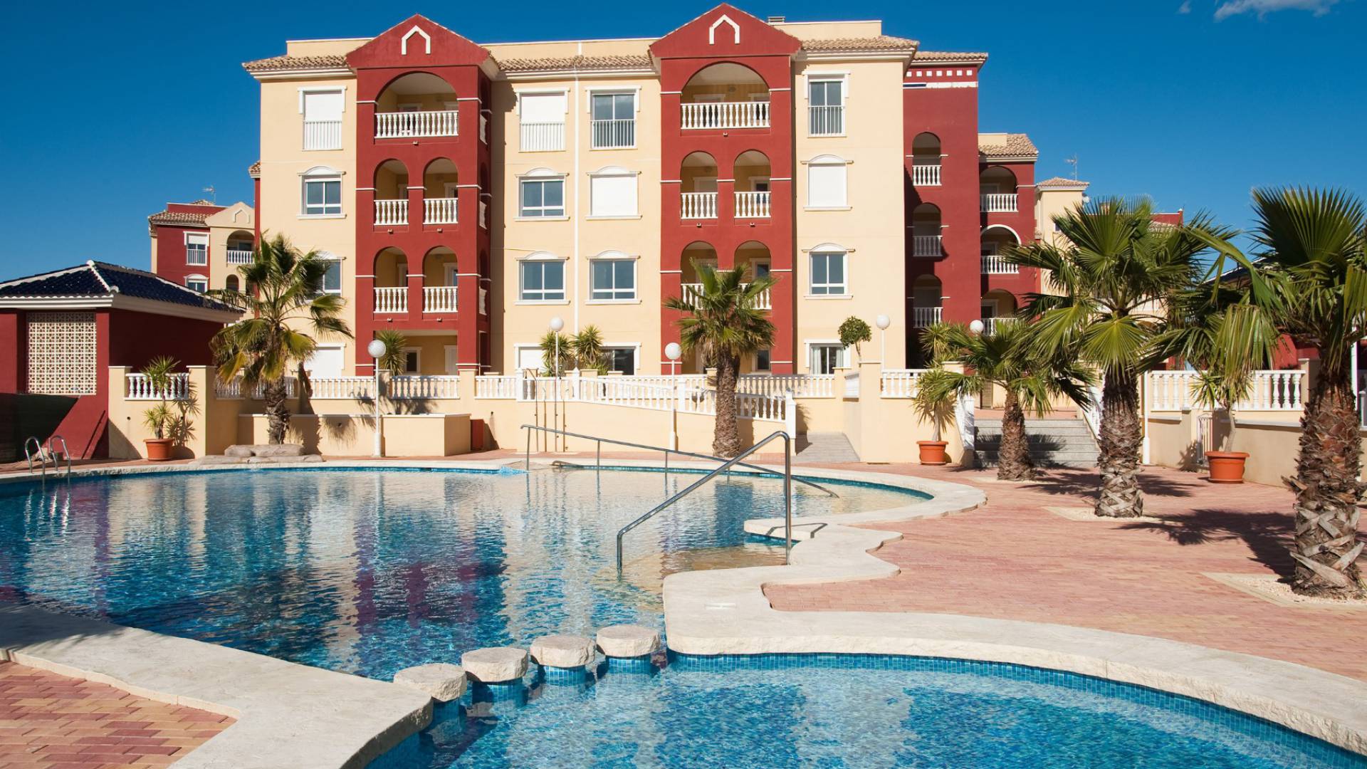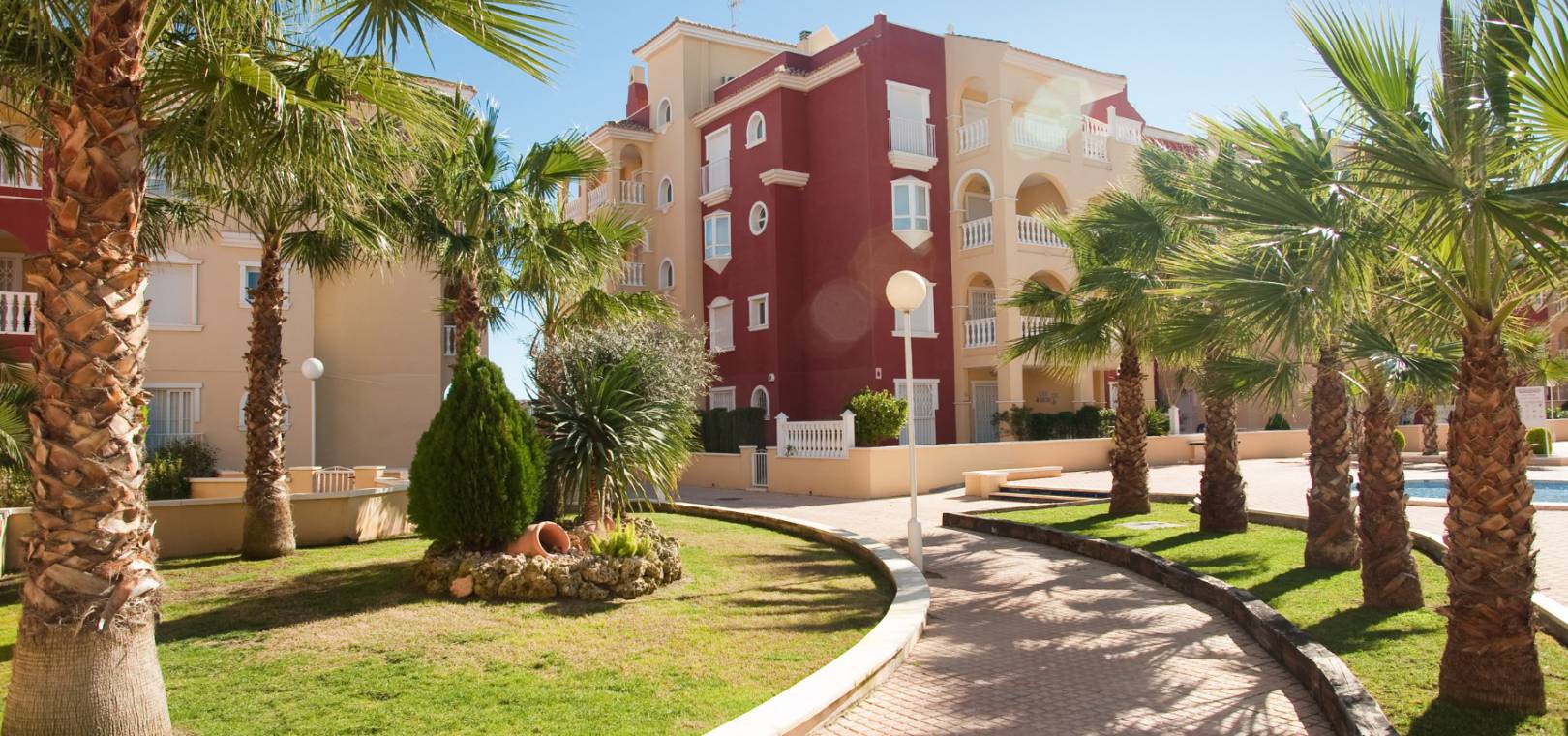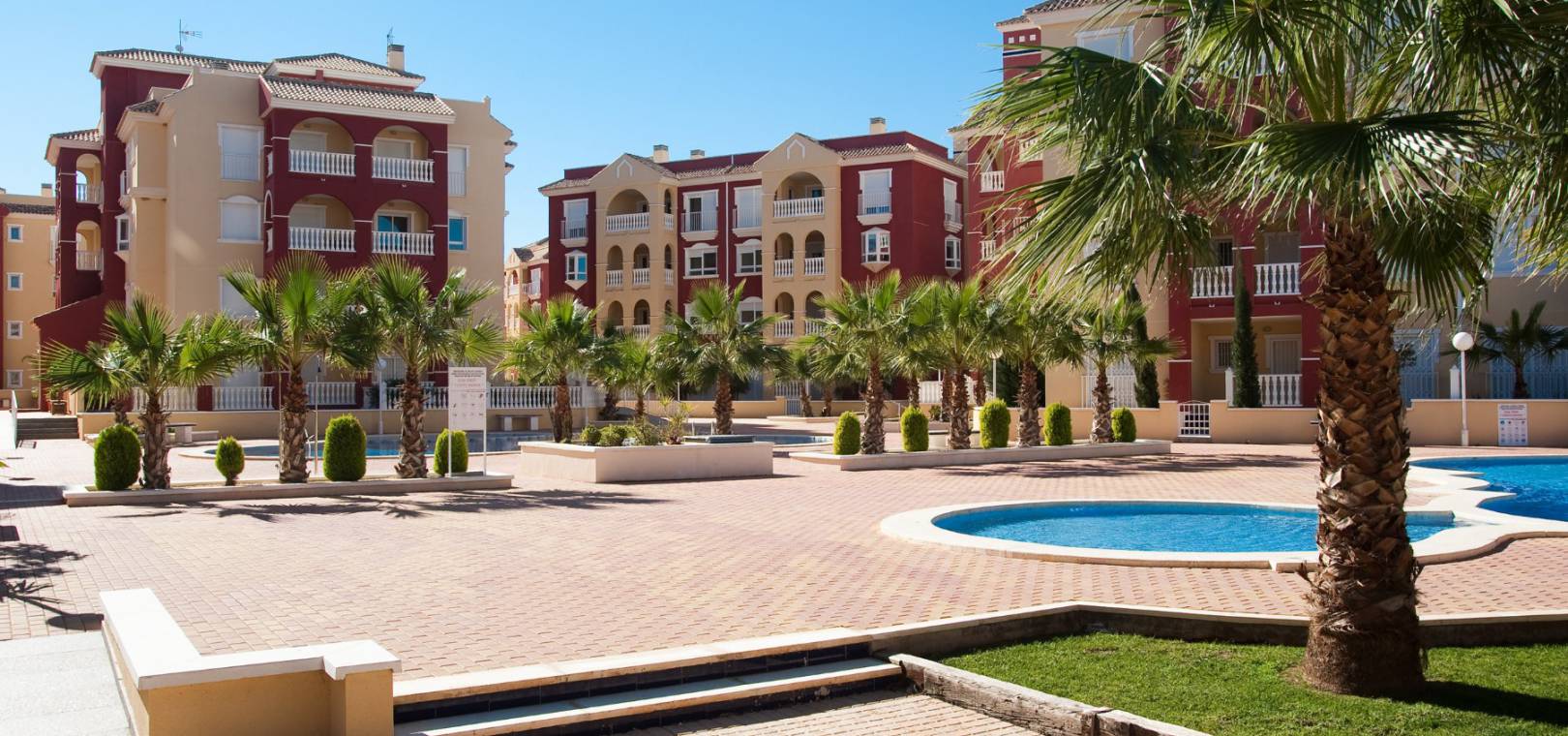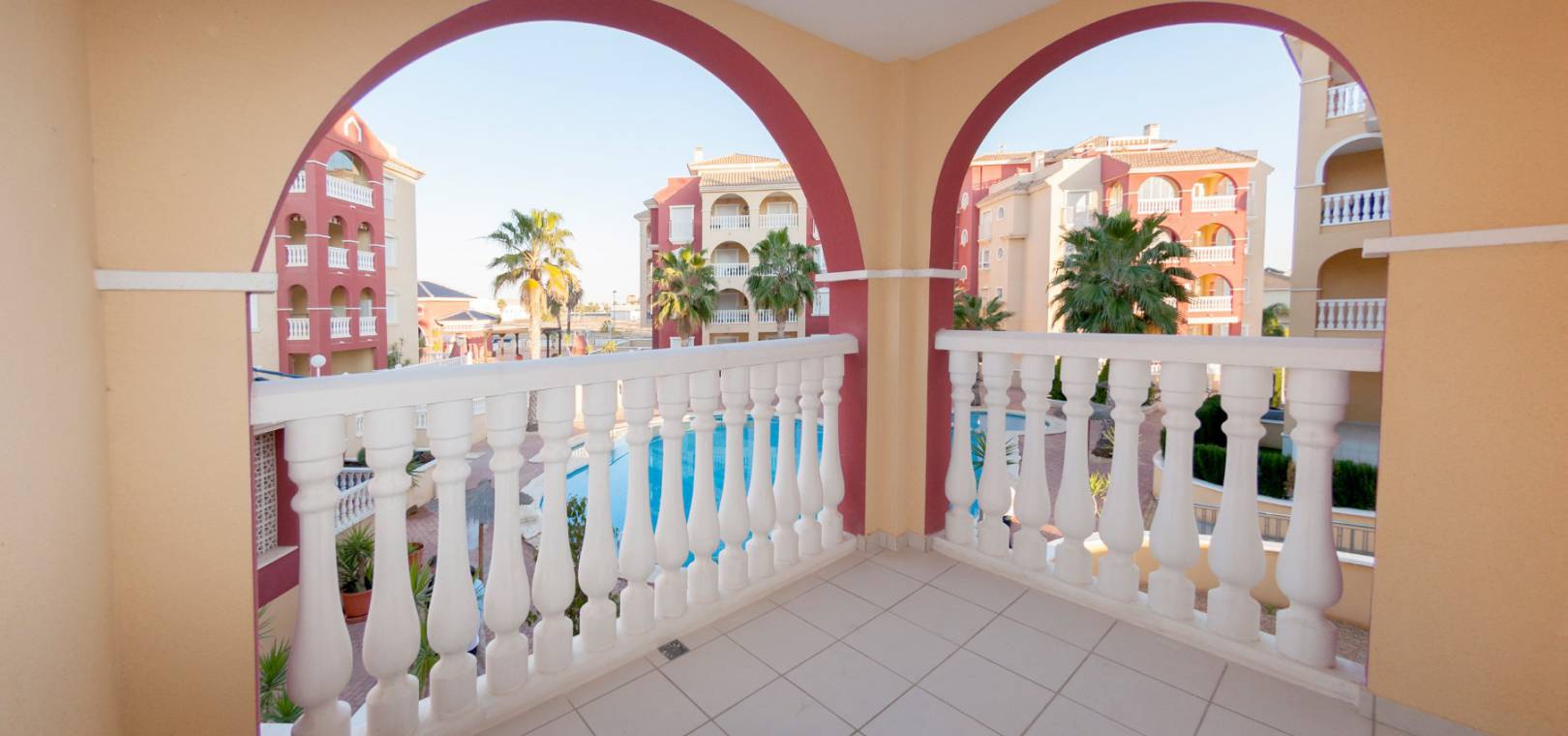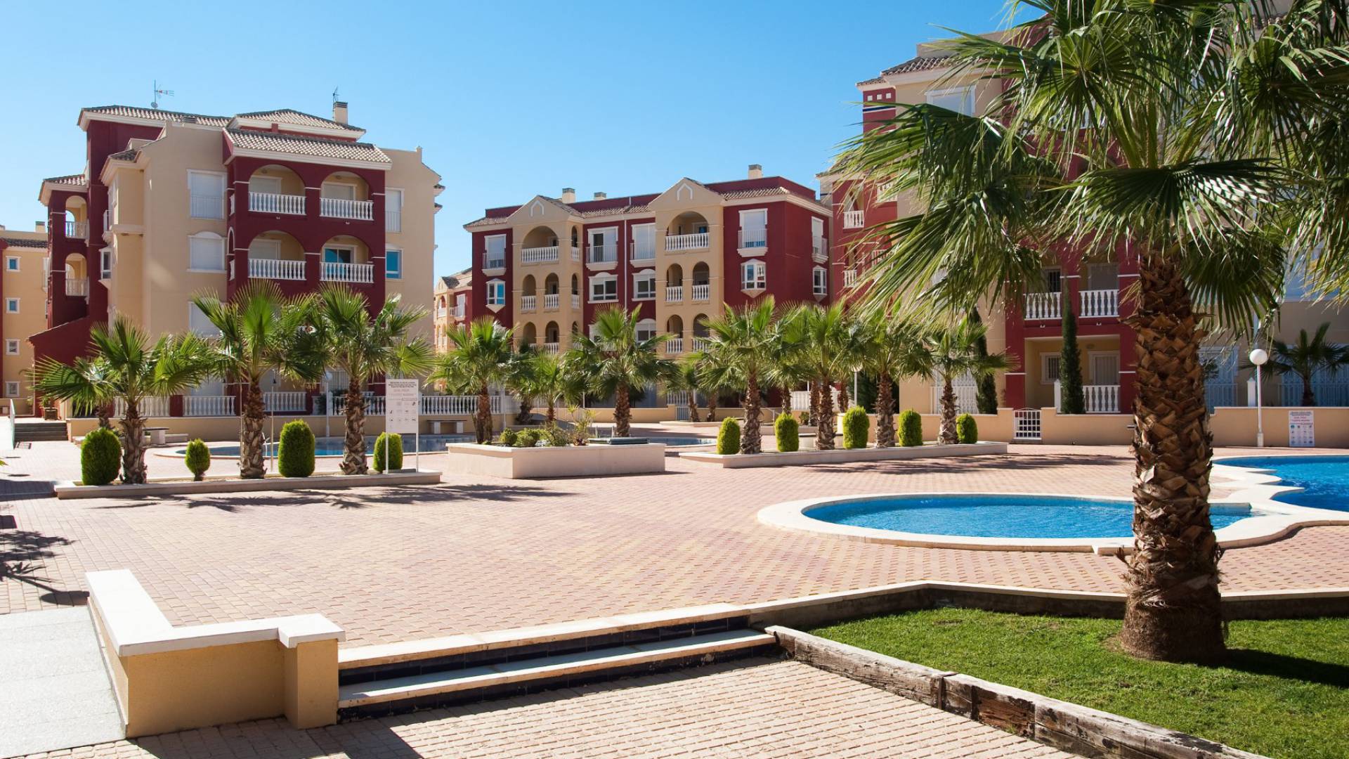 Dieses schlüsselfertige Apartment besteht aus einem offenen Wohnzimmer mit Terrassentüren, die auf die Sonnenterrasse führen, einer offenen Küche mit Einbaugeräten einschließlich Backofen, Kochfeld, Dunstabzugshaube, Kühl-/Gefrierschrank, Geschirrspüler, Waschmaschine und Mikrowelle, zwei Doppelschlafzimmern mit Einbauschränken und einem voll ausgestatteten Badezimmer.