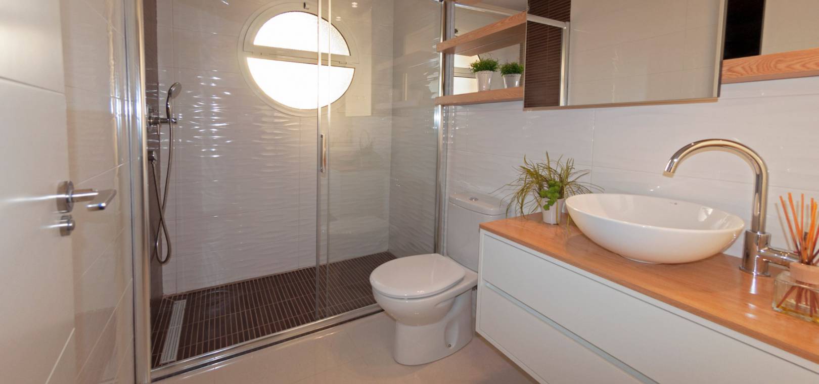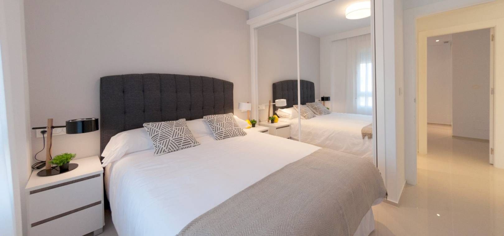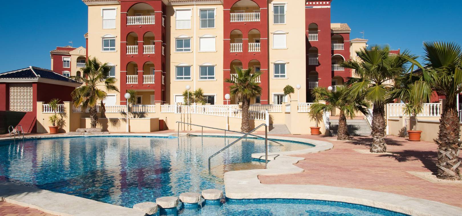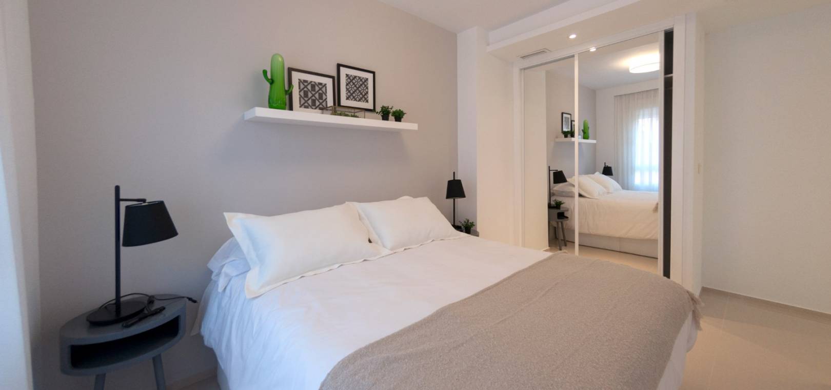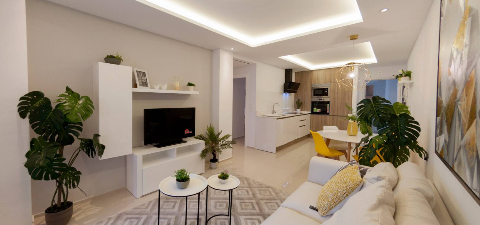 Dieses schlüsselfertige Apartment besteht aus einem offenen Wohnzimmer mit Terrassentüren, die auf die Sonnenterrasse führen, einer offenen Küche mit Einbaugeräten einschließlich Backofen, Kochfeld, Dunstabzugshaube, Kühl-/Gefrierschrank, Geschirrspüler, Waschmaschine und Mikrowelle, zwei Doppelschlafzimmern mit Einbauschränken und einem voll ausgestatteten Badezimmer.
