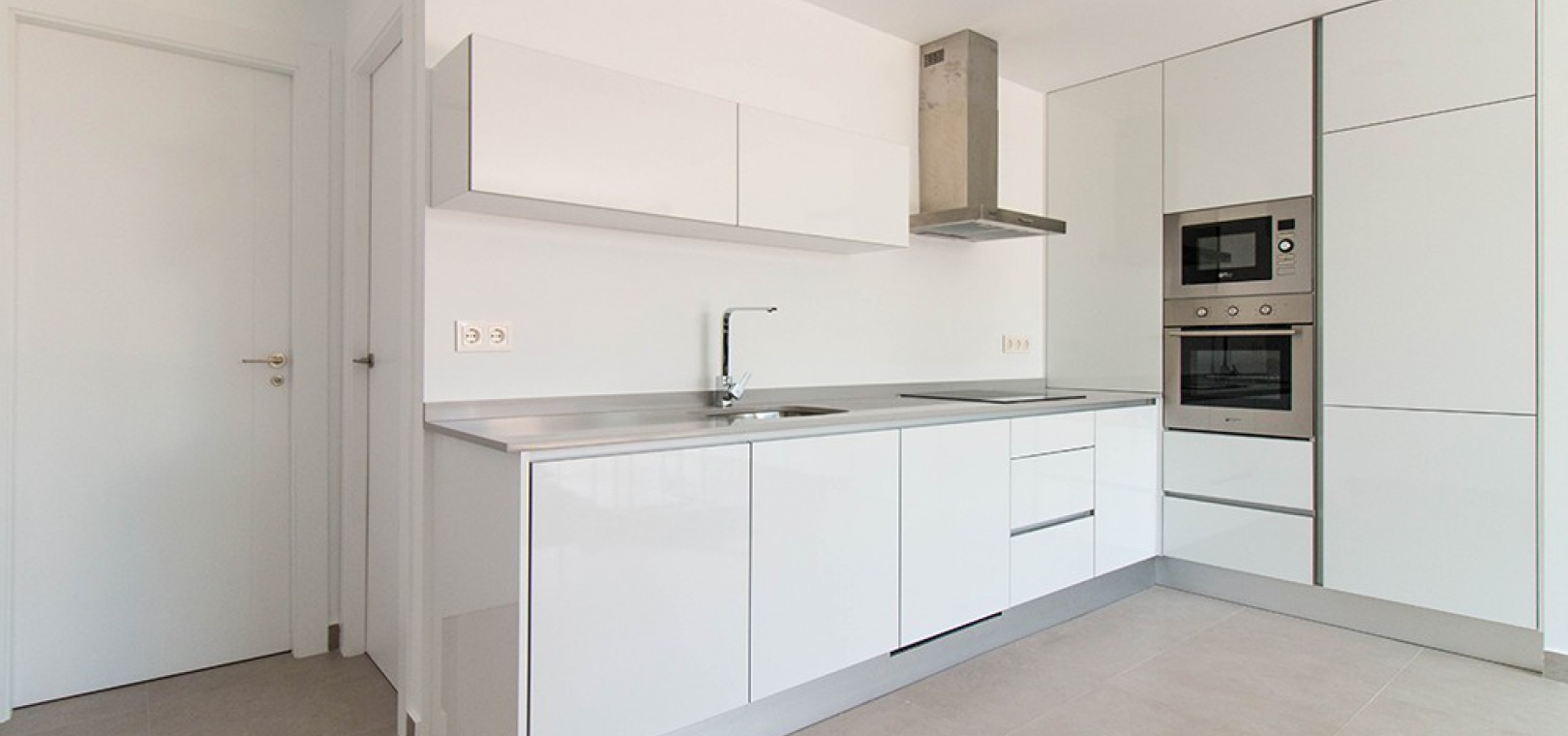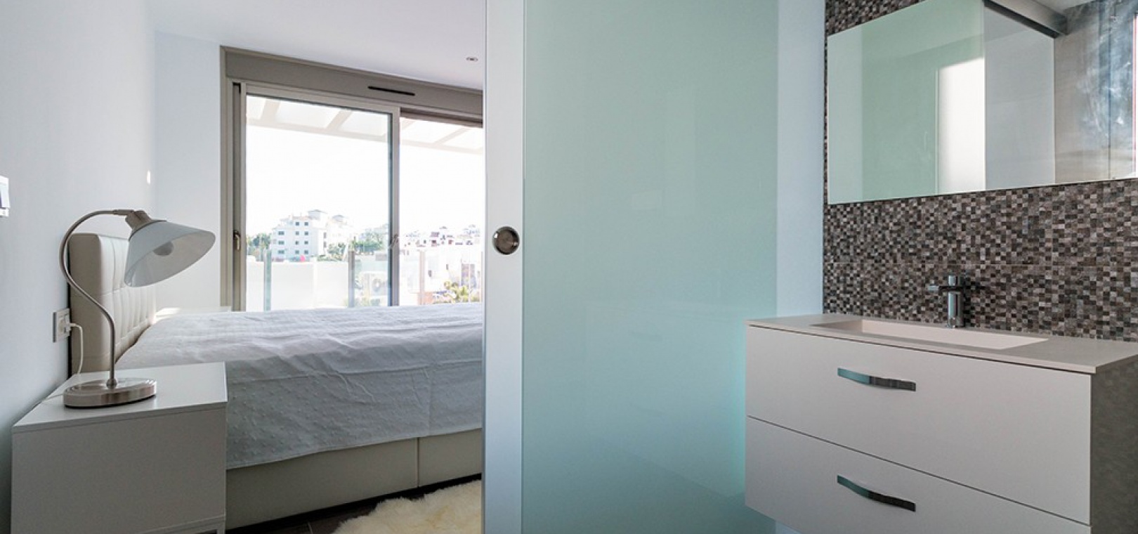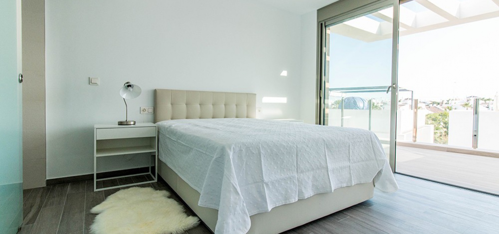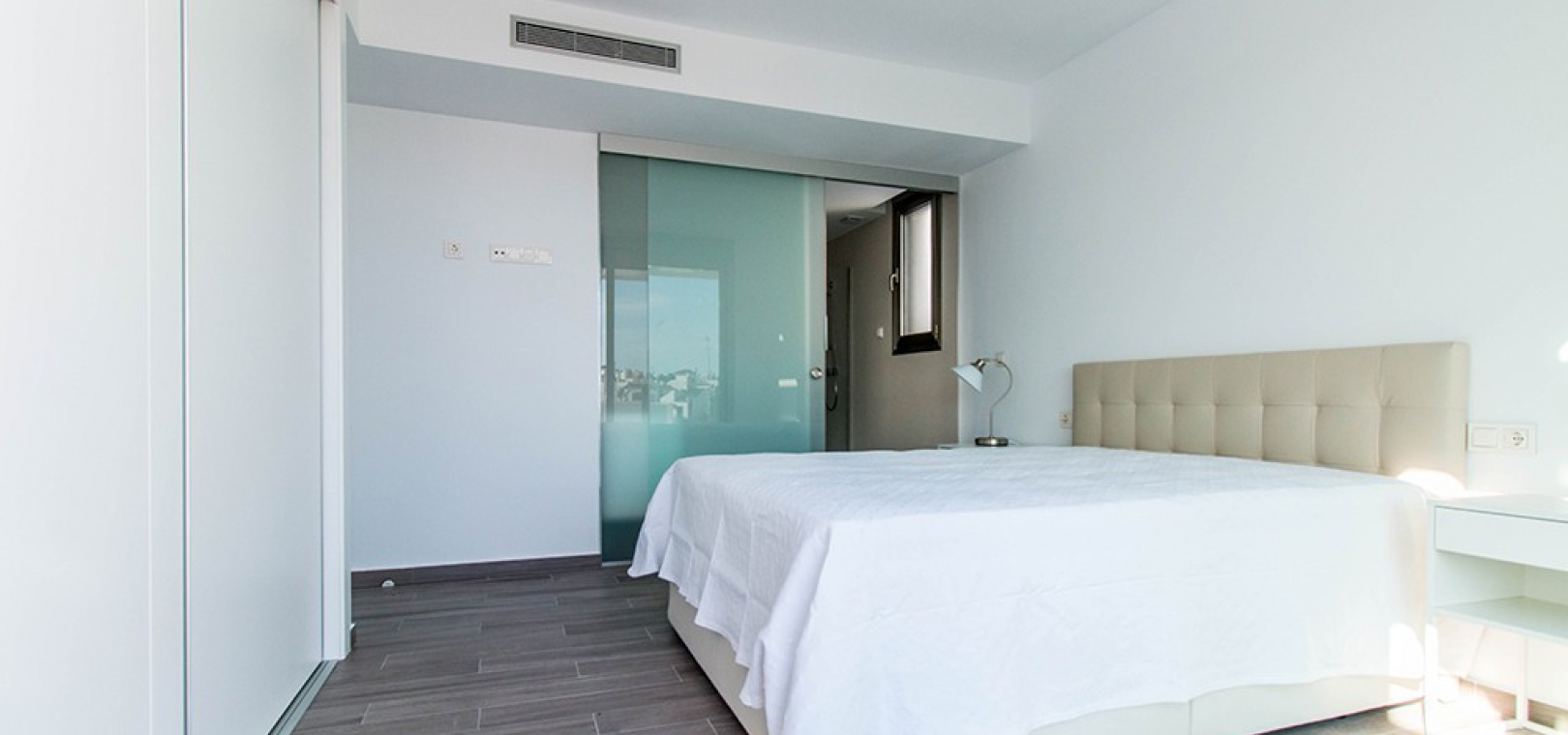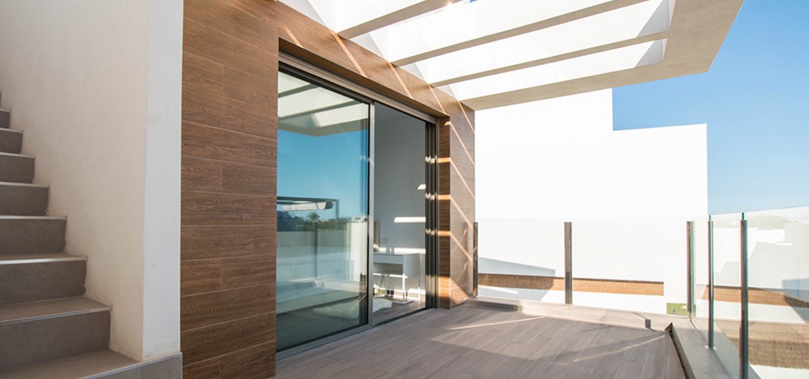 Auf der ersten Etage gibt es ein Hauptschlafzimmer mit Einbauschränken, eigenem Bad und privater Sonnenterrasse, ein weiteres Doppelzimmer mit Einbauschränken und eigenem Bad. Eine Treppe führt hinauf zu einem 45 m² großen Solarium auf dem Dach, von dem aus Sie den Fernblick auf das Meer und den ganzen Tag Sonne genießen können.