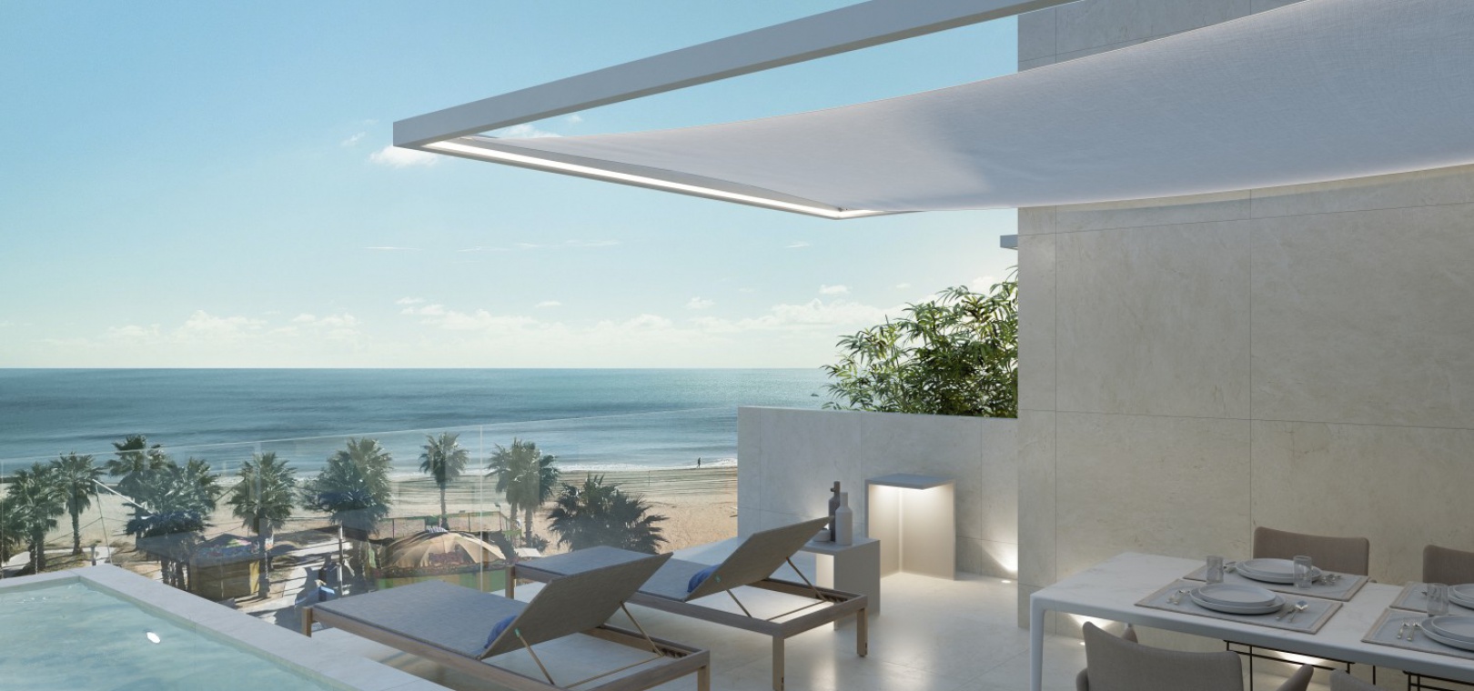 Eine Innentreppe führt hinauf zum privaten Solarium auf dem Dach, komplett mit Whirlpool und Außenküche, wo Sie den offenen Meerblick genießen können.