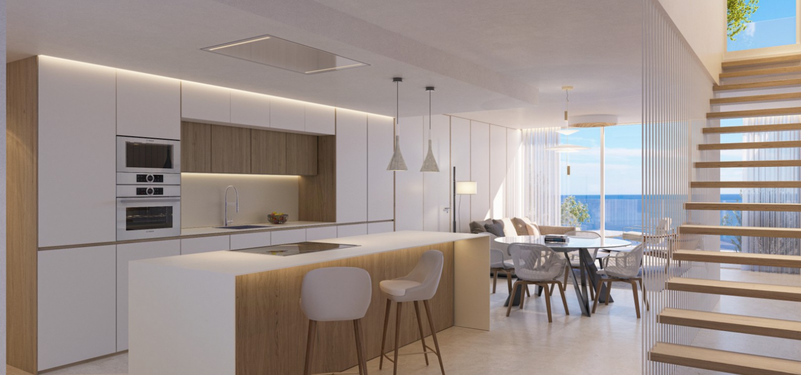 Dieses luxuriöse Penthouse-Apartment besteht aus einem großen offenen Wohnzimmer mit Terrassentüren, die auf die Terrasse mit Aussicht auf den Platz, den Strand und das Meer führen, einer modernen Küche mit Kochinsel und Einbaugeräten einschließlich Backofen, Kochfeld, Dunstabzugshaube, Kühl-/Gefrierschrank, Geschirrspüler, Mikrowelle und Waschmaschine, einem Essbereich, einem Hauptschlafzimmer mit Einbauschränken, eigenem Bad und Zugang zur Sonnenterrasse mit herrlichem Meerblick, zwei weiteren großen Schlafzimmern mit Einbauschränken und einem komplett ausgestatteten Gästebad.
