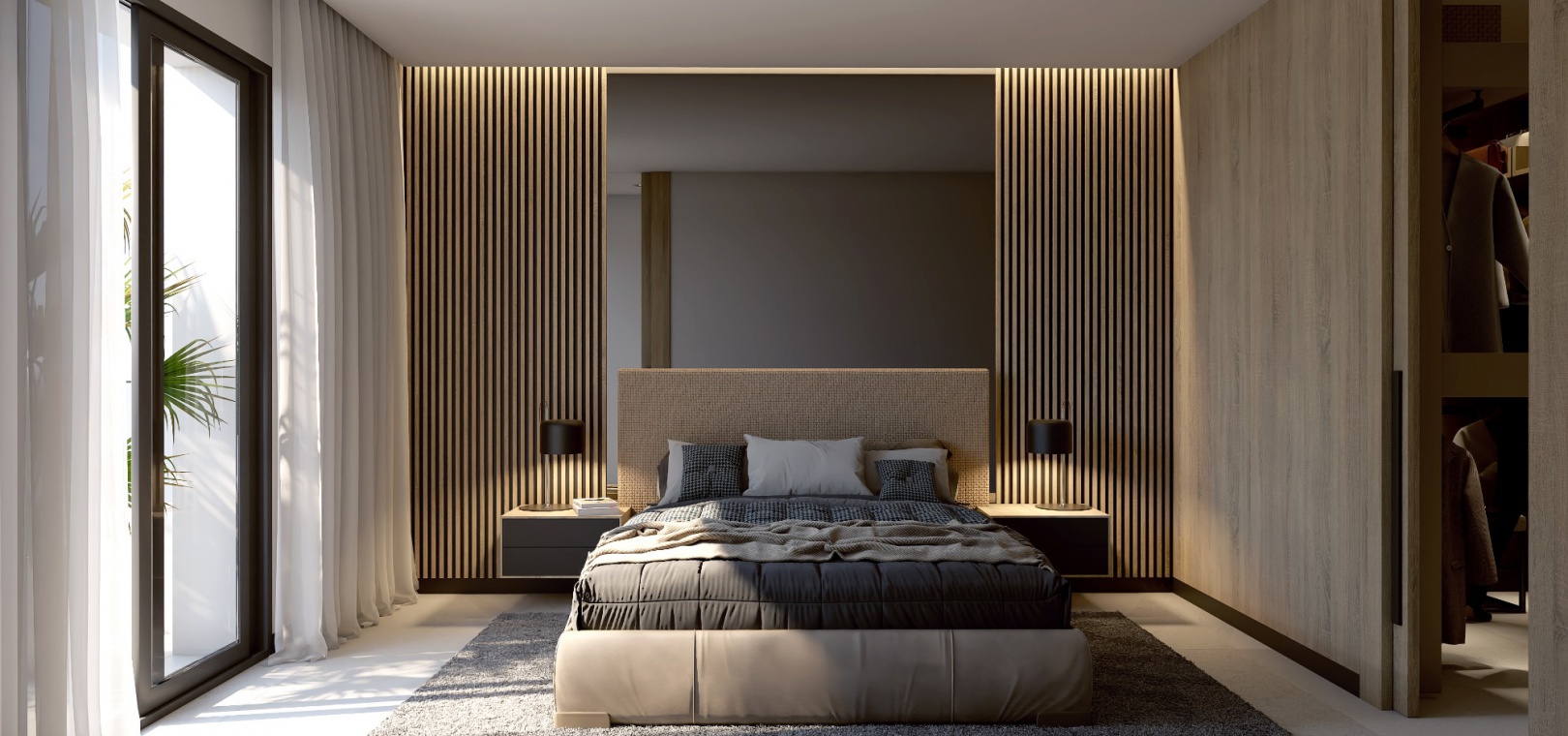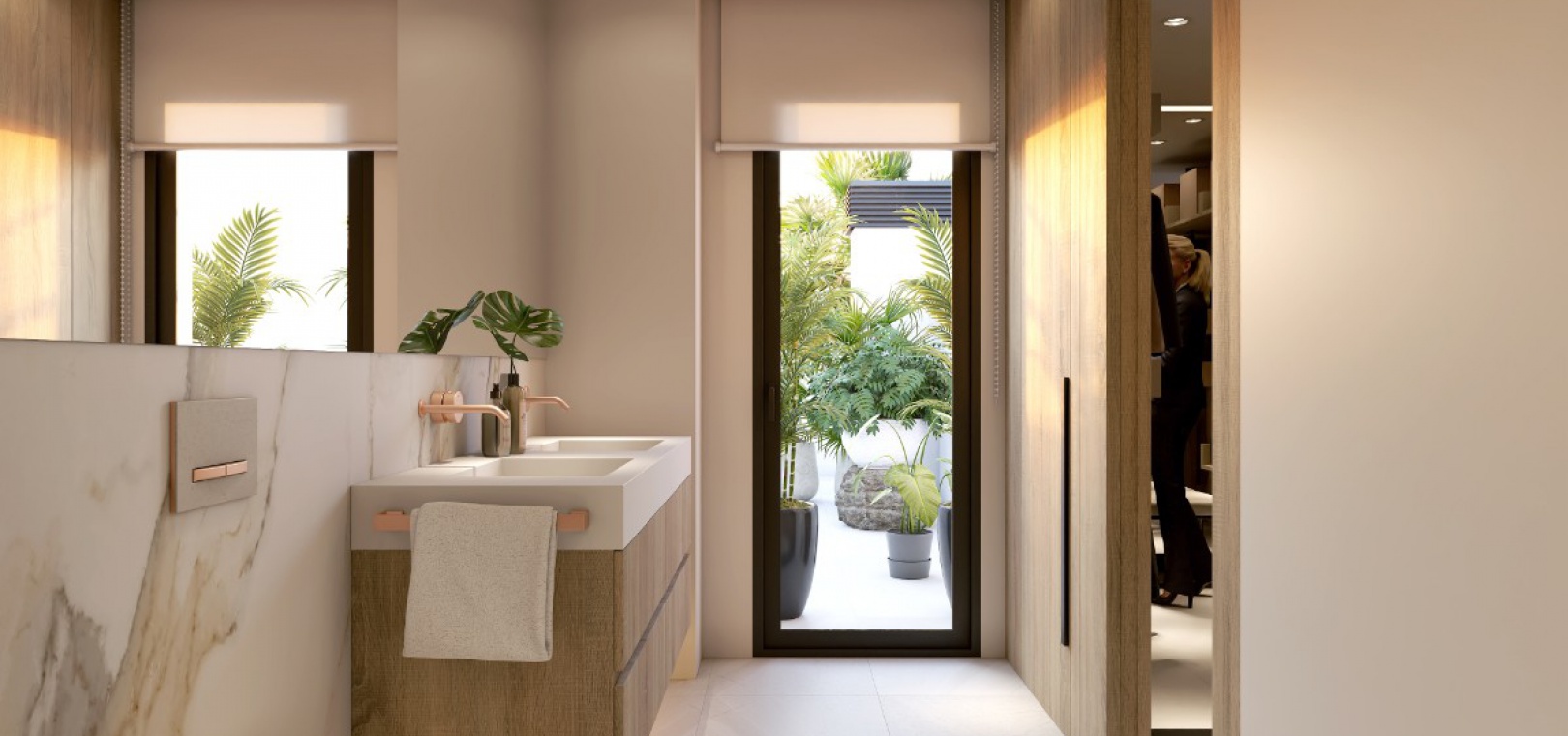 Im Obergeschoss befindet sich die Mastersuite mit Ankleidezimmer, Badezimmer und privater Sonnenterrasse.