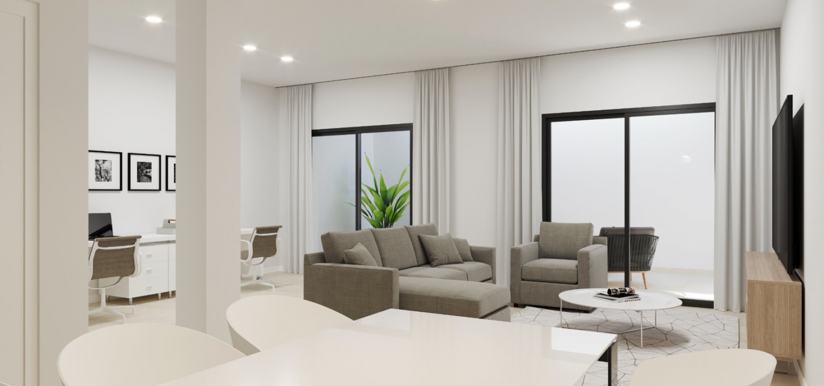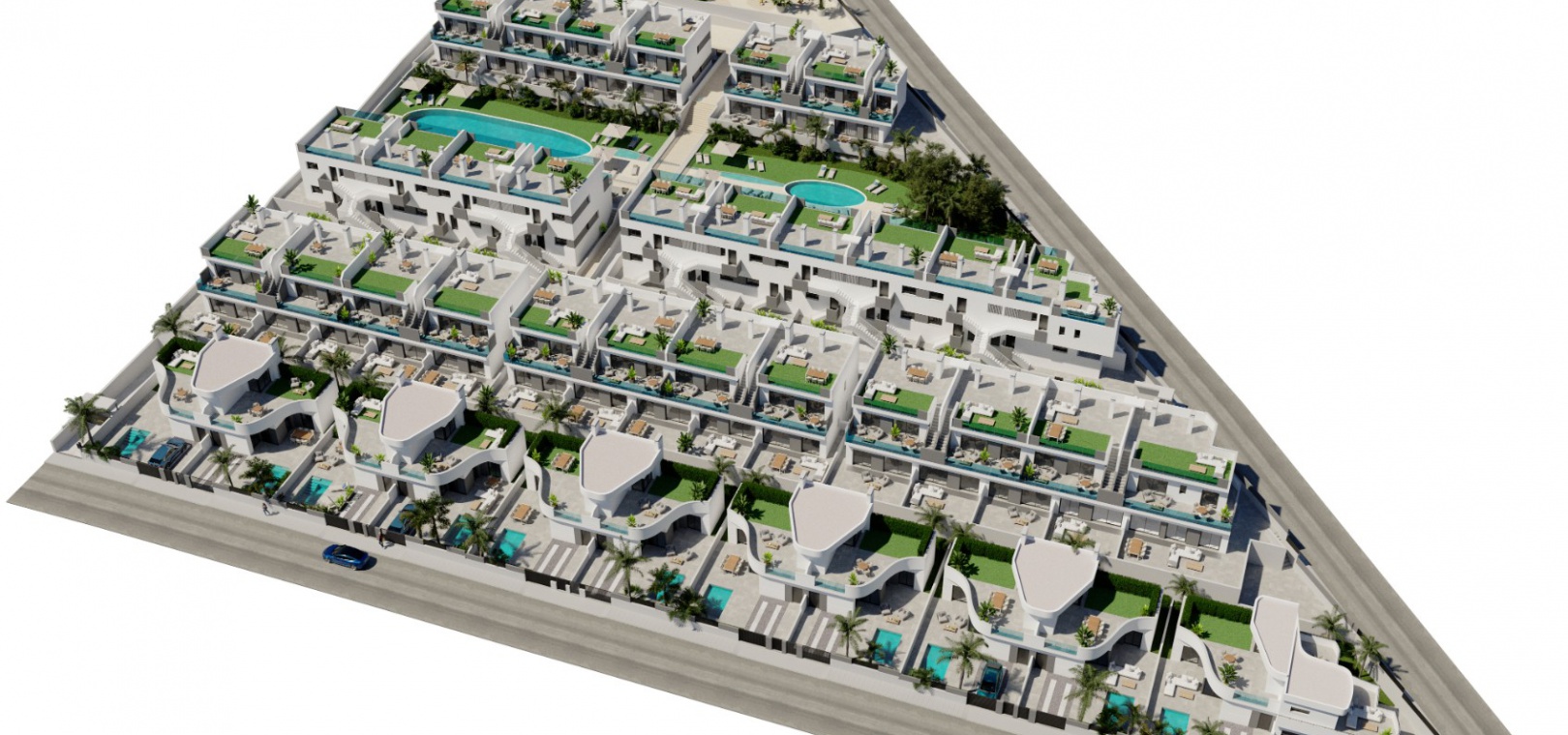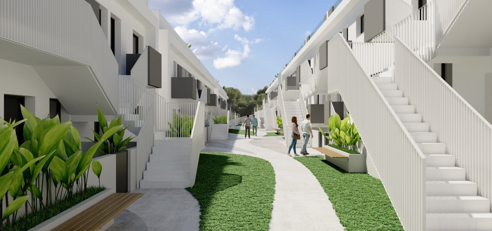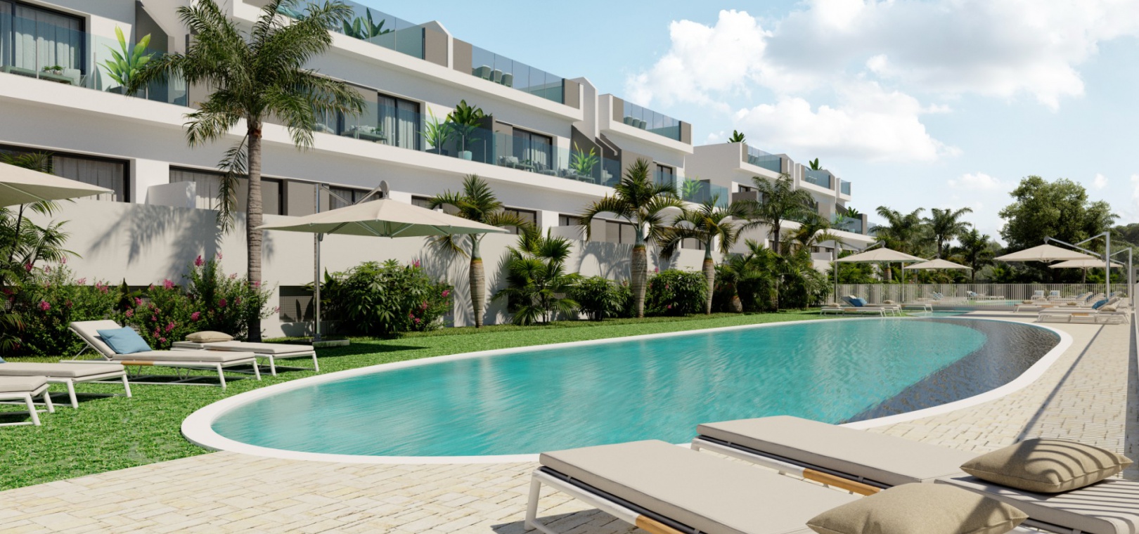 Es gibt schöne Gemeinschaftsgärten mit 2 Pools und jedes Anwesen verfügt über LED-Beleuchtung, Vorinstallation einer Warm-/Kalt-Klimaanlage, eine Einbauküche mit Geräten und einen sicheren unterirdischen Raum mit Lagerraum.
