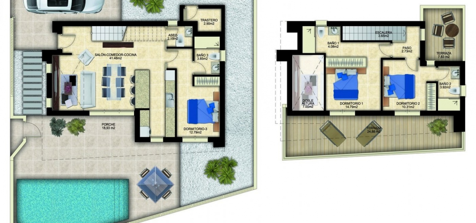 Es ist eine moderne Villa bestehend aus einem geräumigen Wohn-Esszimmer mit offener Küche, 3 Schlafzimmern (eines davon en-suite) und 4 Badezimmern.