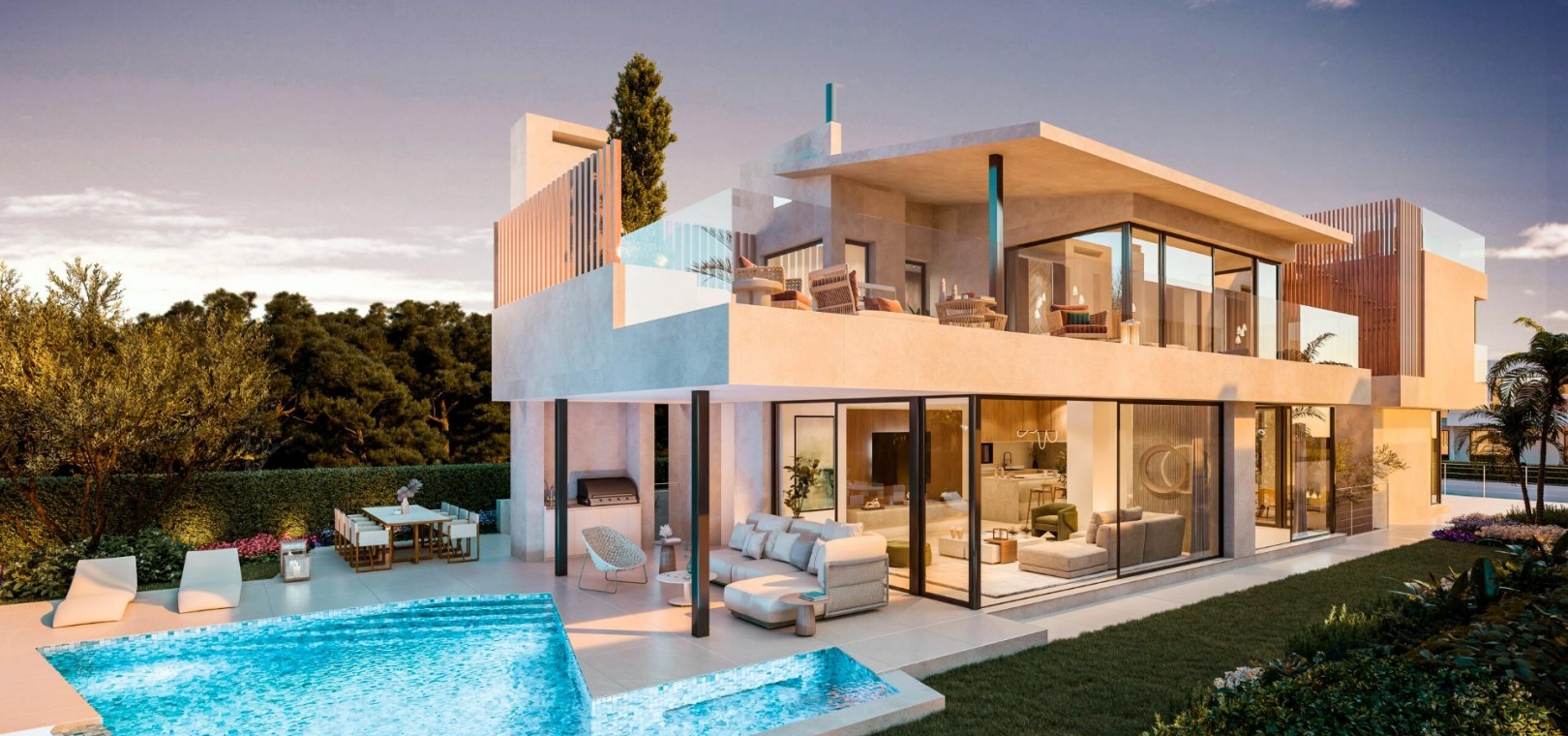 Alle Villen verfügen über einen Swimmingpool im Garten, mit einem respektvollen Klimatisierungssystem, das die Badetage verlängert, bis zu 4 Parkplätze mit Ladestationen für Elektrofahrzeuge und passive Klimatisierungssysteme.