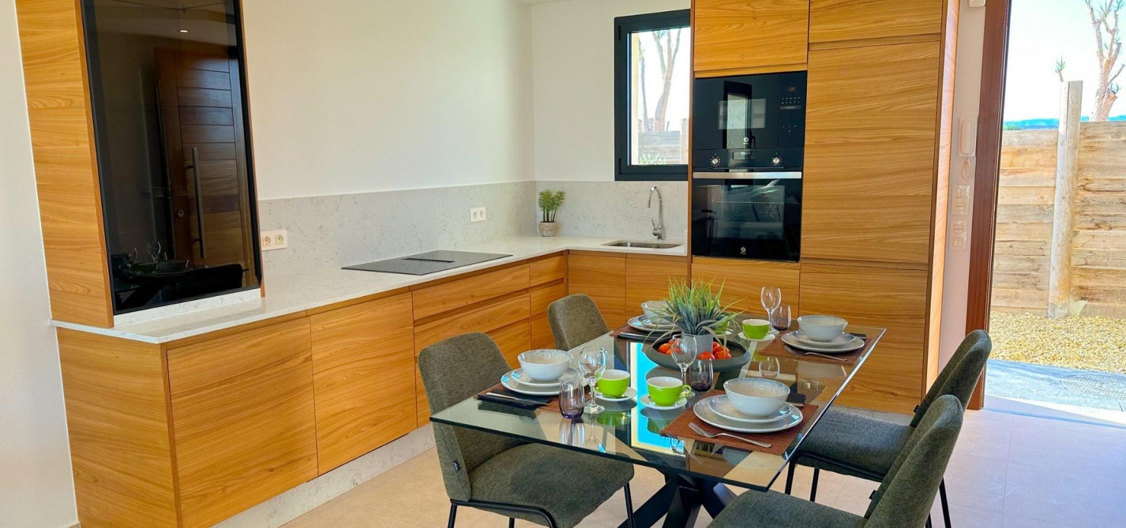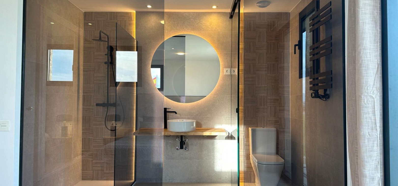 Zu den hochwertigen Ausstattungsmerkmalen gehören ein ansprechend gefliestes Badezimmer und ein Duschraum. Eine offene Küche mit Silestone"-Arbeitsplatten, in deren Schränken Kühl-/Gefrierschrank und Waschmaschine integriert sind. Ein Cerankochfeld, Dunstabzugshaube und Mikrowelle. Klimaanlage, Doppelverglasung, verspiegelte Schränke in den Schlafzimmern mit hochwertigen 'Roca' oder 'Porcelnosa' Sanitärkeramik und Armaturen im ganzen Haus.