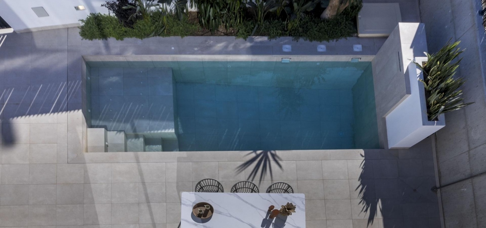 Die Innenraumaufteilung ist darauf ausgelegt, das natürliche Licht optimal zu nutzen und eine nahtlose Verbindung zwischen Innen- und Außenbereich zu schaffen. Offene Wohn- und Essbereiche gehen direkt in die Terrasse und den Pool über und bieten den perfekten Rahmen zum Entspannen oder zum Empfang von Familie und Freunden.