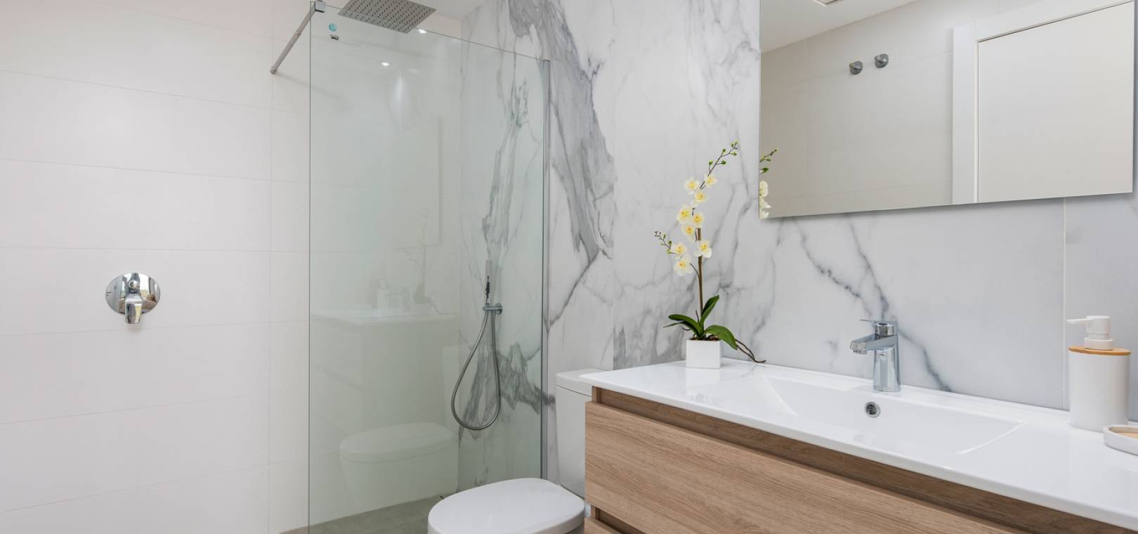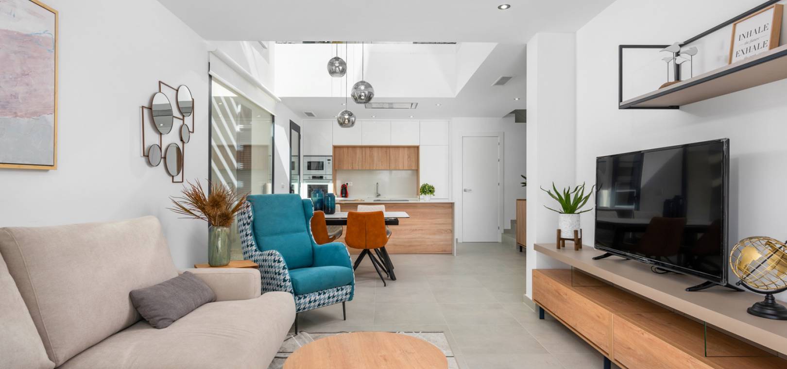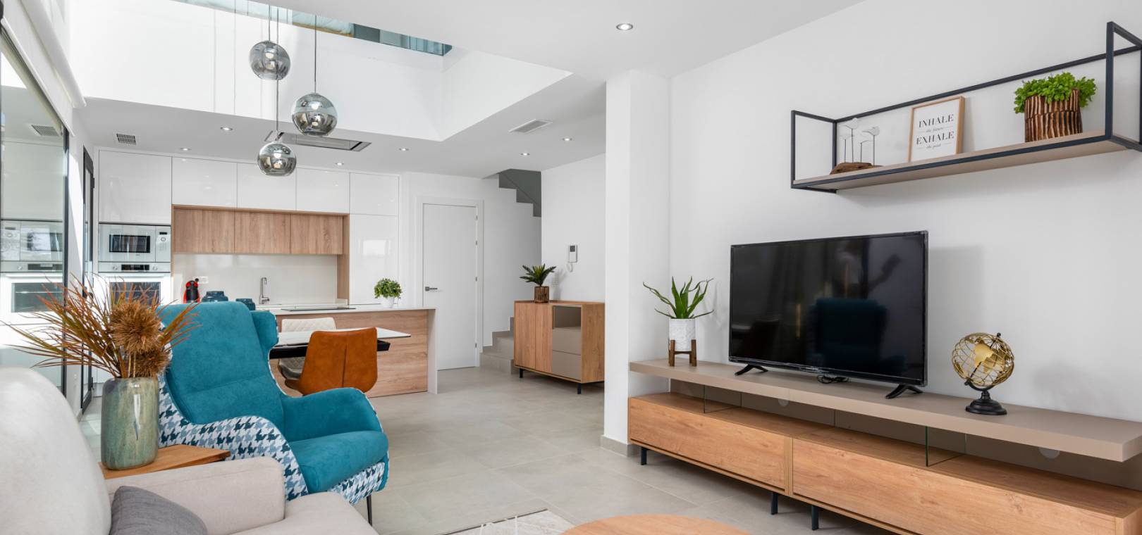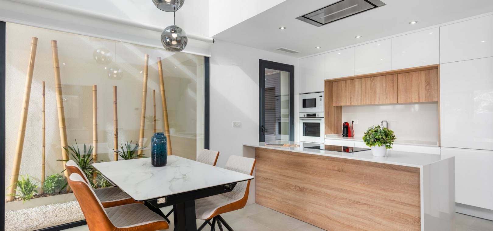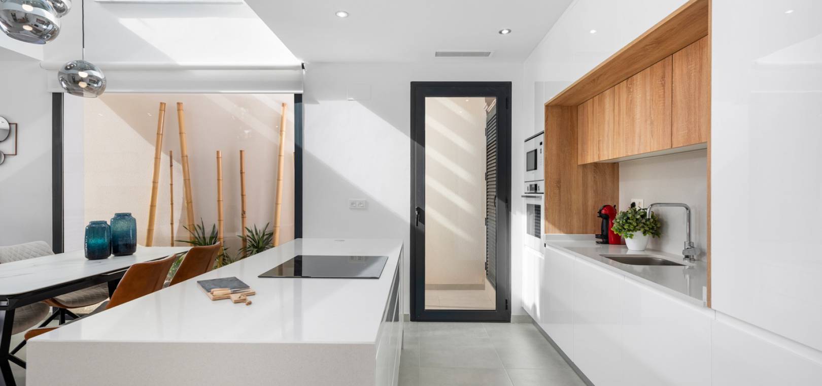 Le rez-de-chaussée de cette propriété se compose d'un salon/salle à manger avec portes-fenêtres menant au jardin privé avec piscine, d'une cuisine ouverte avec appareils électroménagers intégrés dont four, plaque de cuisson, hotte aspirante, réfrigérateur/congélateur, lave-vaisselle, lave-linge et micro-ondes, salle à manger avec plafond ouvert pour une sensation de lumière et d'espace, chambre double et salle de bain pour invités.