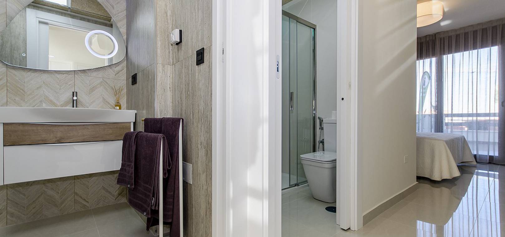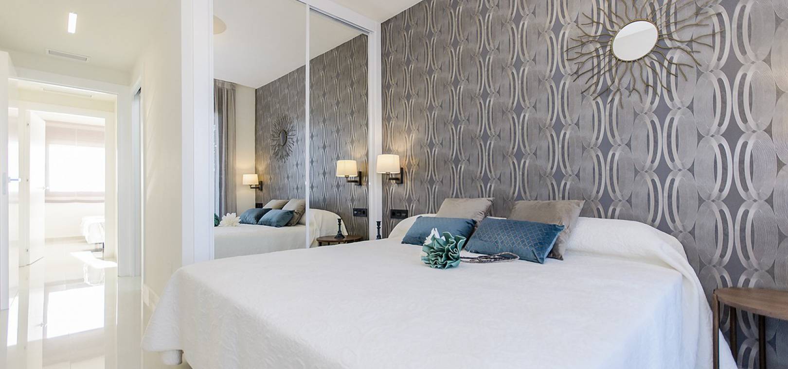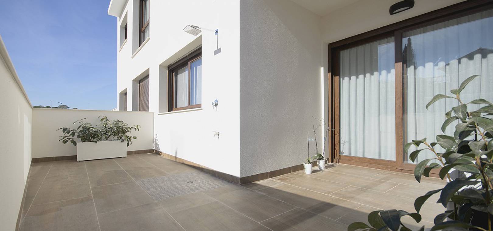Cet appartement au rez-de-chaussée avec 2 chambres se compose d'un séjour ouvert avec portes-fenêtres donnant sur la terrasse et le jardin, d'une cuisine moderne avec des appareils intégrés tels que four, plaque de cuisson, hotte aspirante, réfrigérateur/congélateur, lave-linge, lave-vaisselle et micro-ondes. Buanderie attenante, une chambre principale avec placards et une salle de bain en suite avec accès à la terrasse, une autre chambre double également avec placards et une salle de bain pour invités. Il y a aussi une terrasse arrière accessible depuis la cuisine et la chambre 2.
