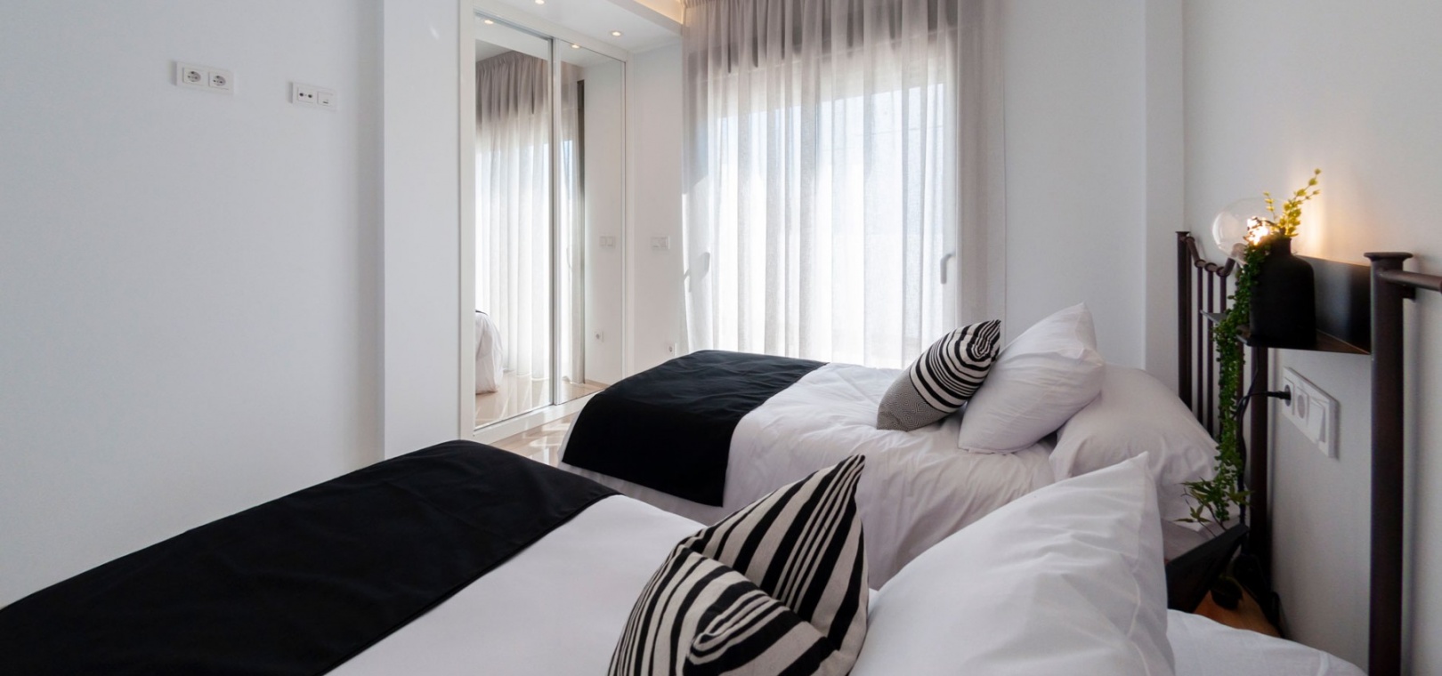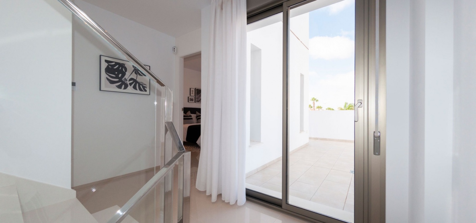 Au premier étage, il y a une chambre principale avec placards, une salle de bains avec accès à la terrasse supérieure, une autre chambre double avec placards et une salle de bains privative.