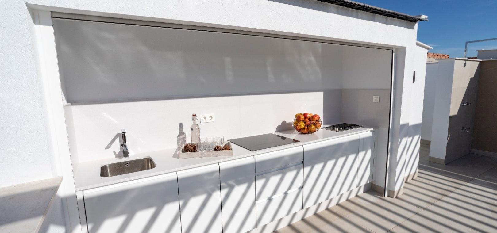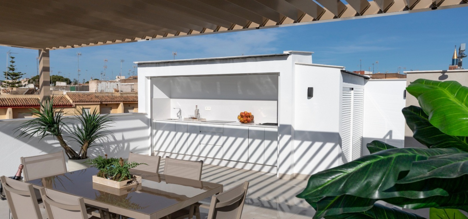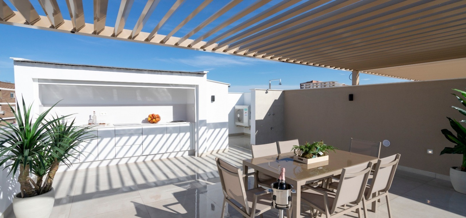 Ce penthouse se compose d'un salon décloisonné avec des portes-fenêtres donnant sur la terrasse, une cuisine moderne avec des appareils tels qu'un four, une plaque de cuisson, une hotte, un réfrigérateur/congélateur et un lave-vaisselle, une chambre principale avec placards et une salle de bains privative. , deux autres chambres avec placards et une salle de bain invités. Des escaliers mènent à un solarium privé sur le toit où vous pourrez profiter du soleil de la Costa Blanca toute la journée.