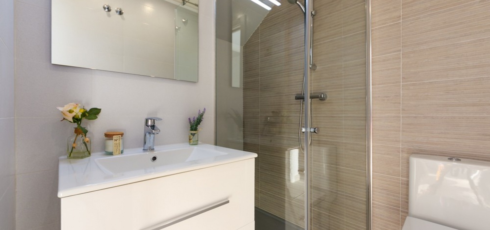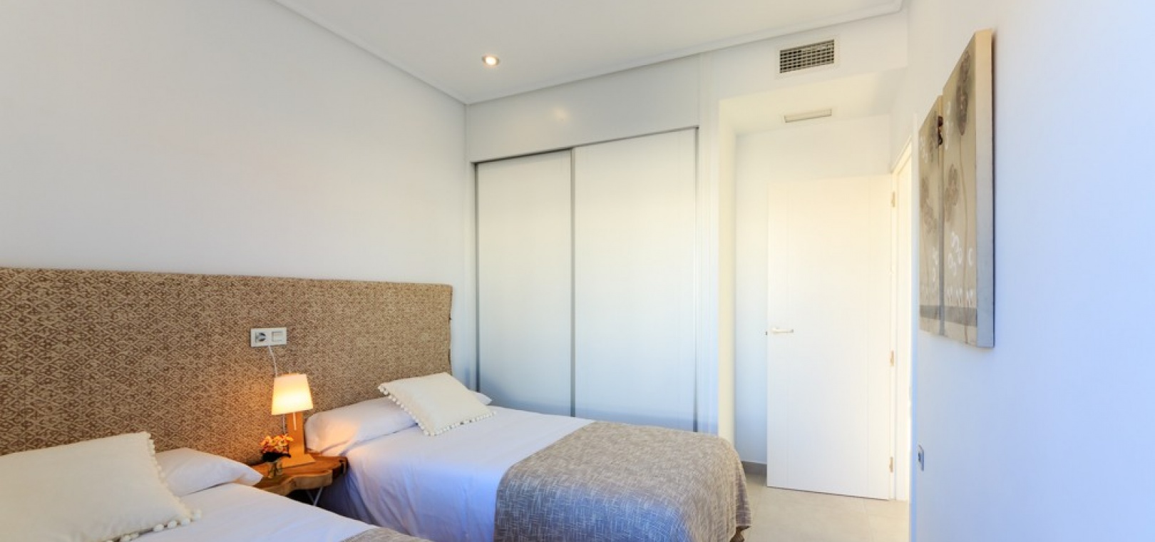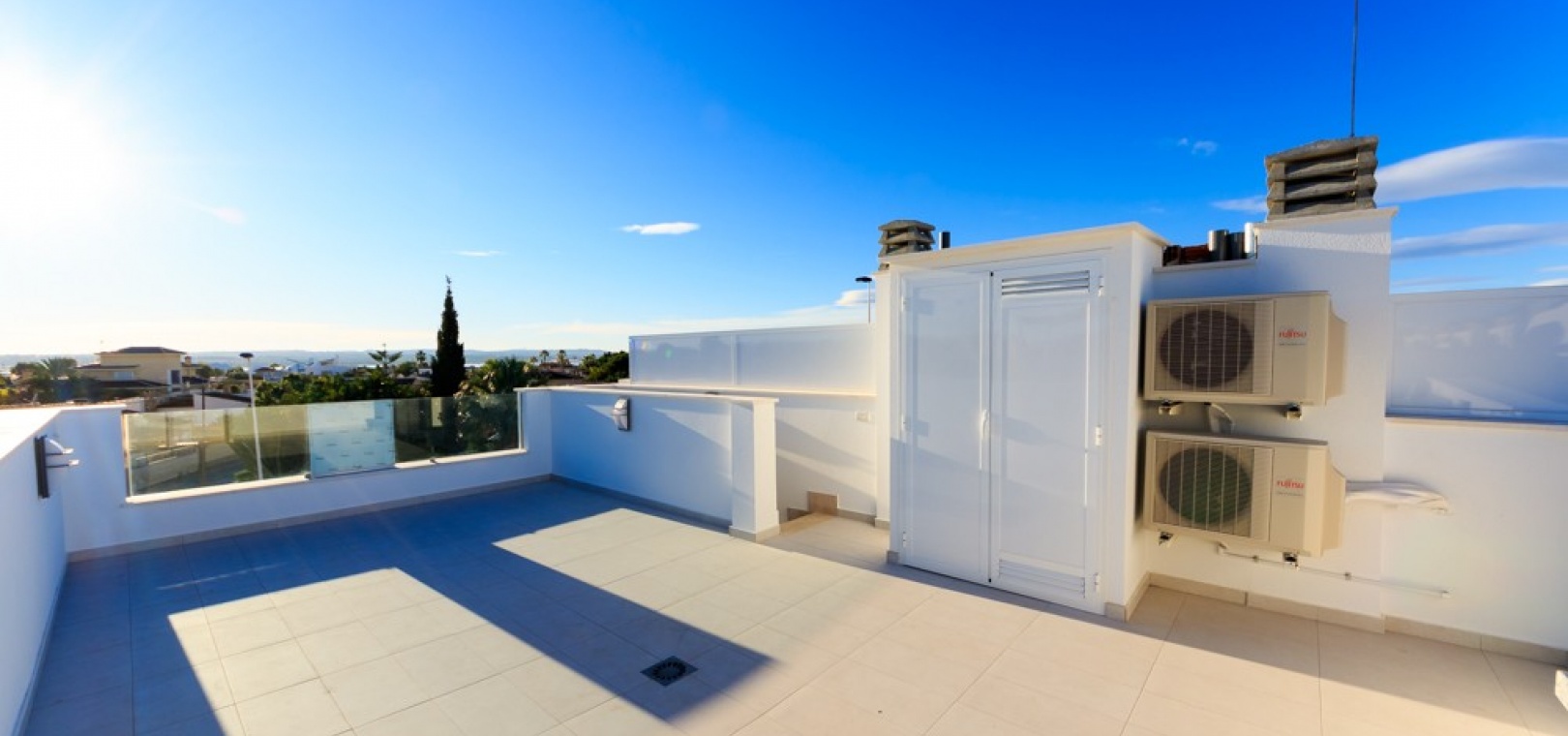 Au premier étage se trouve la chambre principale avec placards et terrasse privée, une autre chambre avec placards et une autre salle de bain complète. Il y a un escalier menant à un solarium privé de 41 m² sur le toit, où vous pourrez profiter d'une vue imprenable et du soleil toute la journée.
