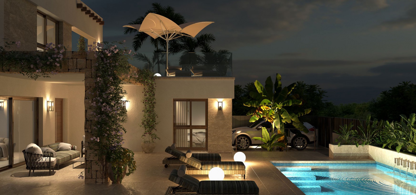 Cette villa est construite selon les normes les plus élevées et dispose d'une piscine privée, de tous les appareils de cuisine, de la climatisation chaud/froid, du chauffage au sol dans les salles de bains, d'un solarium sur le toit et d'un parking privé.