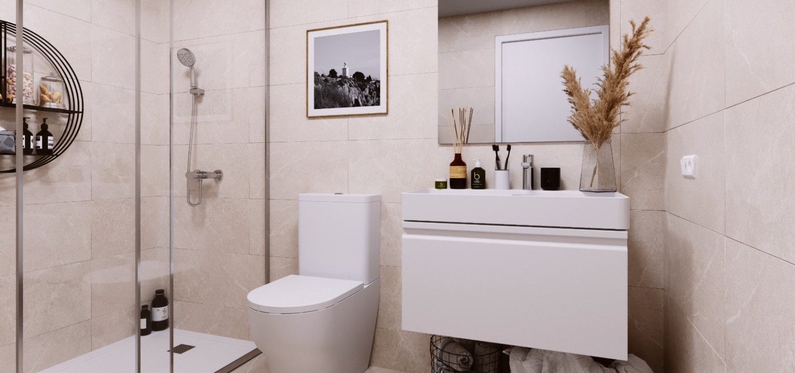 Cet appartement de luxe de 2 chambres se compose d'un salon avec des portes ouvrant sur la terrasse donnant sur la piscine commune, une cuisine ouverte avec four, plaque de cuisson, hotte aspirante et micro-ondes, coin repas, une chambre principale avec placards et salle de bains, une autre chambre double chambre et une salle de bain invité.
