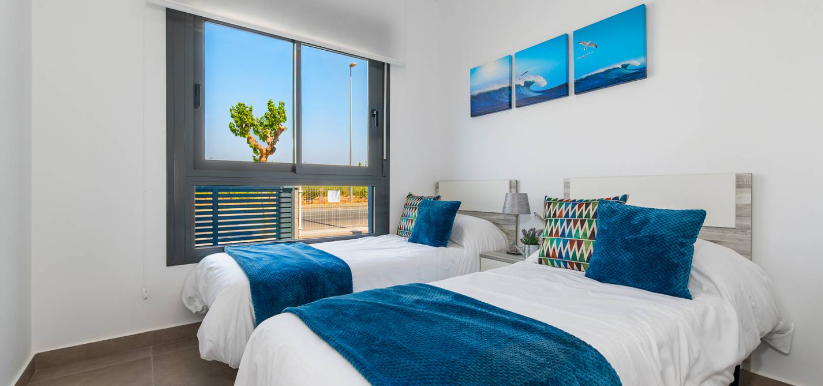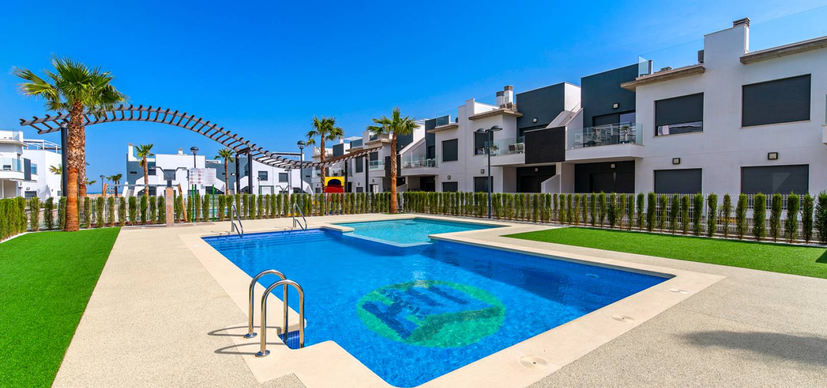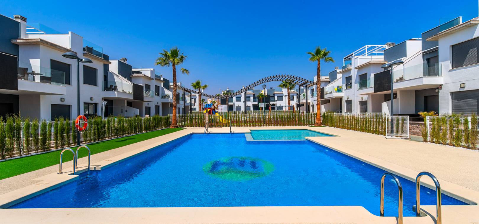 Pilar de la Horadada CLÉ PRÊT / COMPLÈTE Appartement neuf de 2 chambres et 2 salles de bains ... Offre TOUT INCLUS pour un prix fantastique de seulement 159000 € ... Appartements de style bungalow moderne de haute qualité avec deux piscines communes, des espaces verts et un parking hors rue. ... Proche de la ville et des superbes plages de Torre de la Horadada.