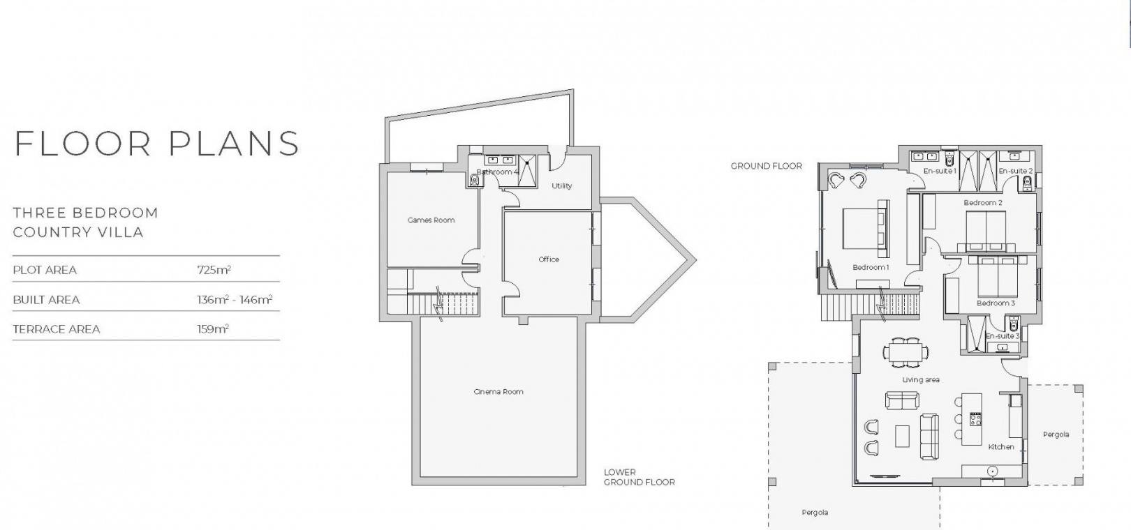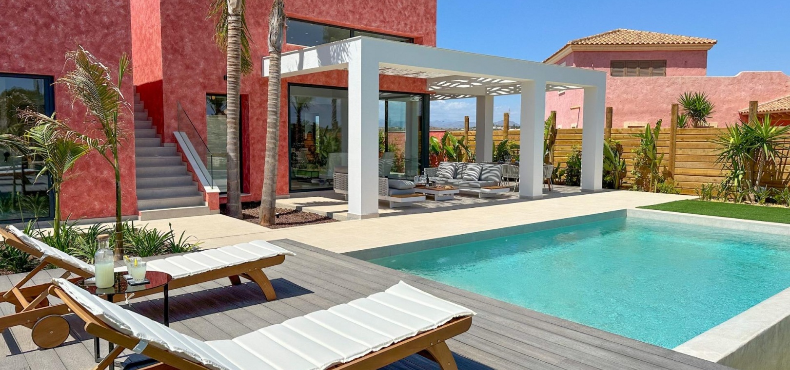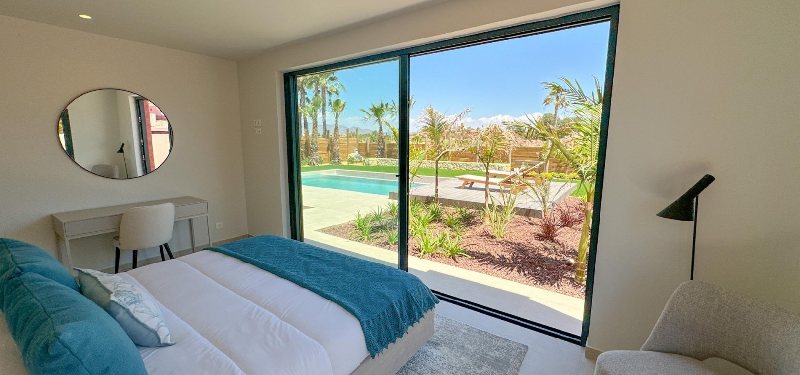 La chambre principale, avec salle de bains, a un accès direct à la vaste véranda et à la piscine. Il y a deux autres chambres, toutes deux avec salle de bains en-suite et vestiaire.