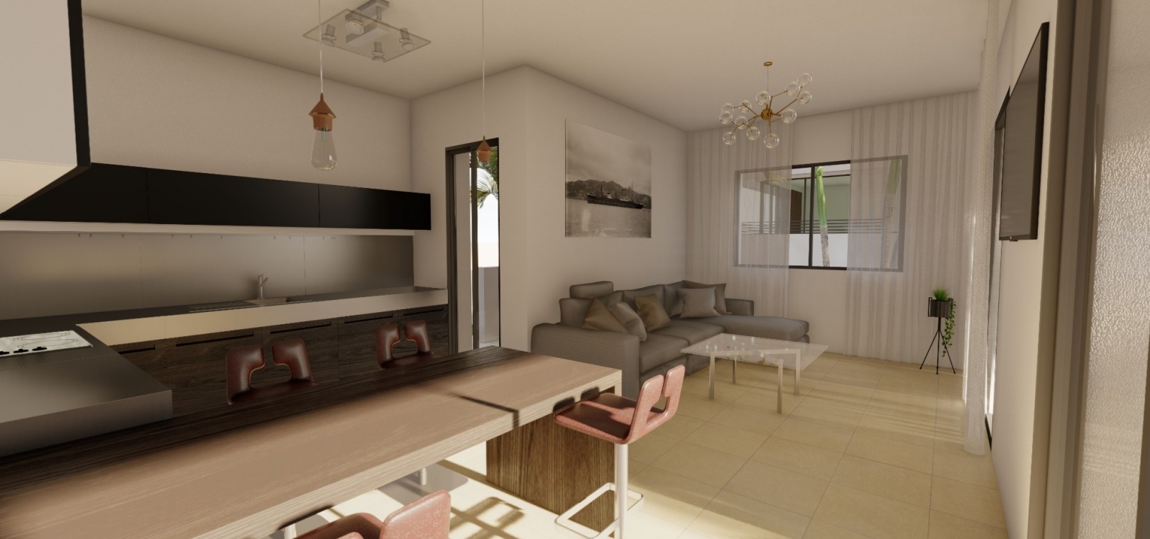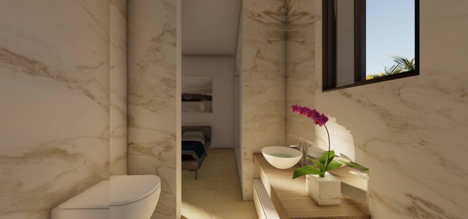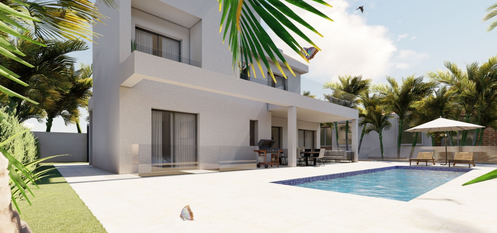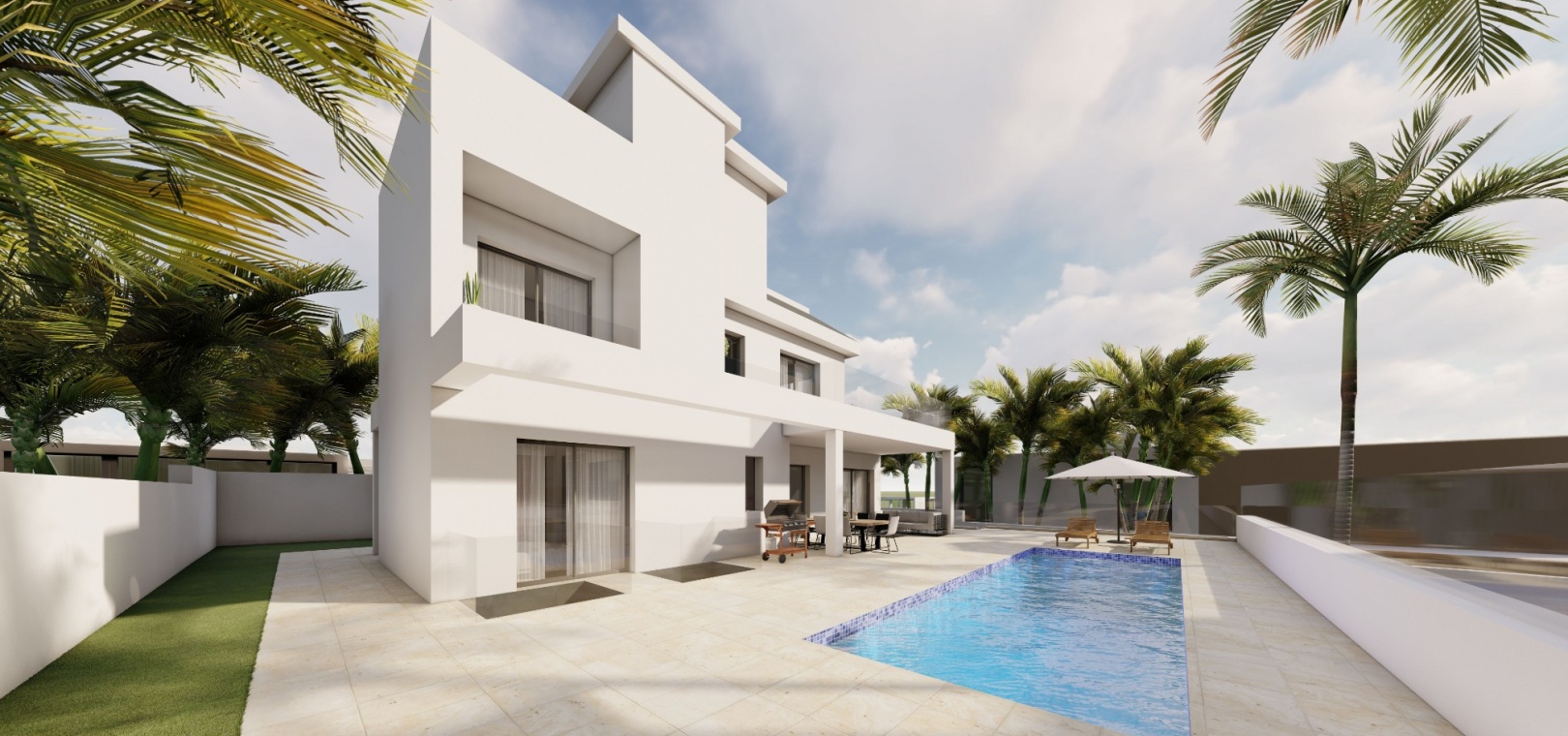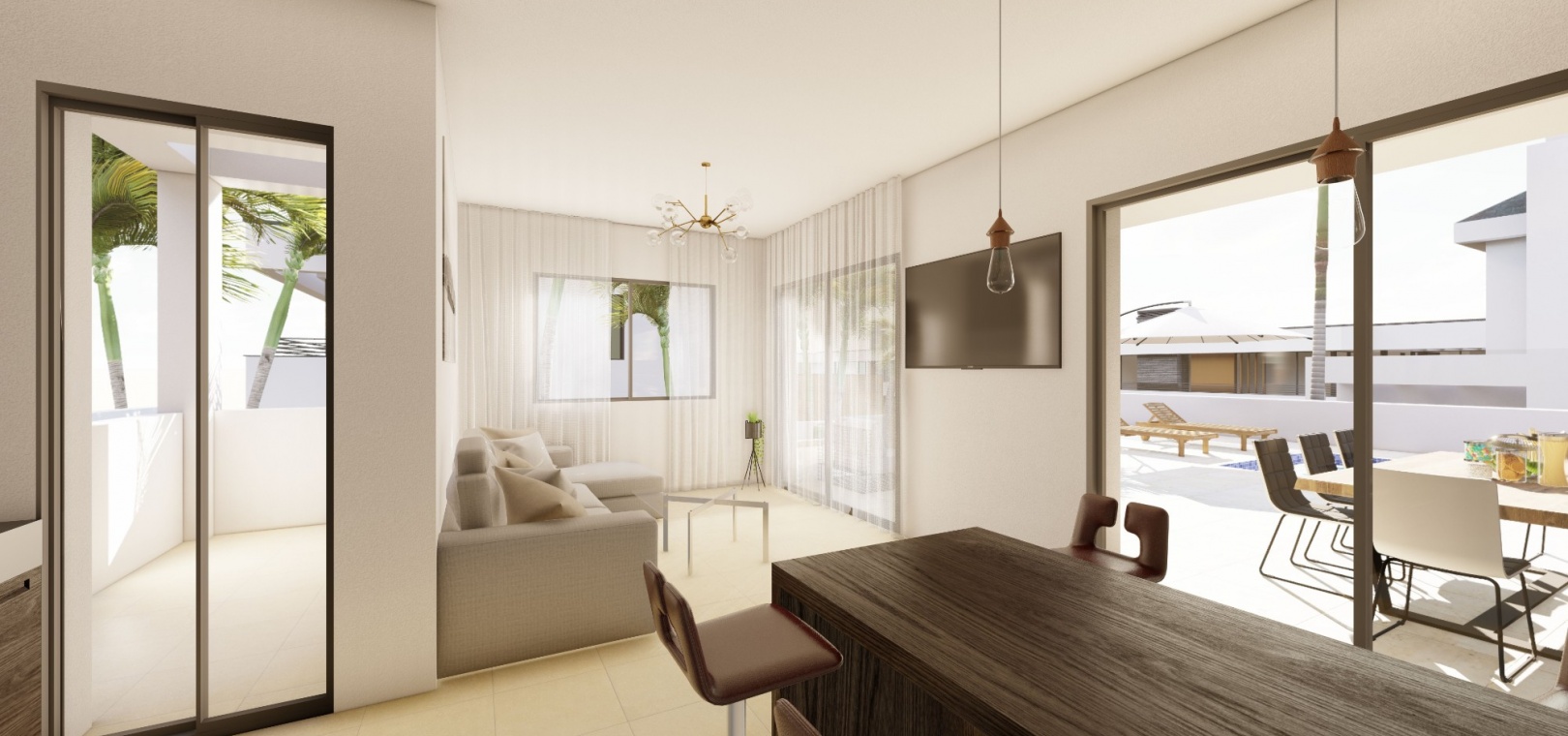 Deze luxe villa heeft een mooie open woonkamer met openslaande deuren naar de tuin met privézwembad van 10 x 3 meter, een moderne keuken voorzien van inbouwapparatuur zoals oven, kookplaat, afzuigkap, koelkast/vriezer, wasmachine, vaatwasser en magnetron . , eetkamer en gastenbadkamer op dit niveau.