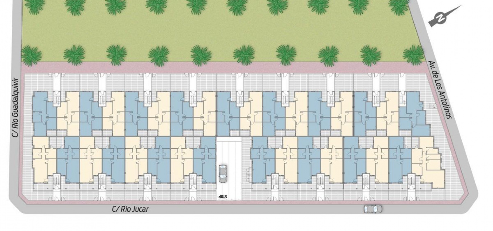 De begane grond bestaat uit 33 appartementen met 2 slaapkamers, een tuin en een patio. De eerste verdieping bestaat uit 33 appartementen verdeeld over twee verdiepingen, met grote en lichte terrassen.