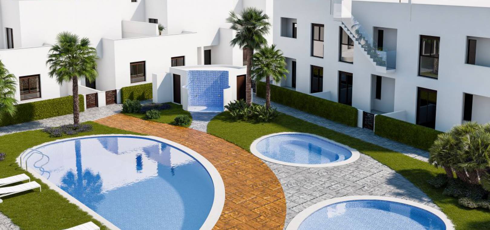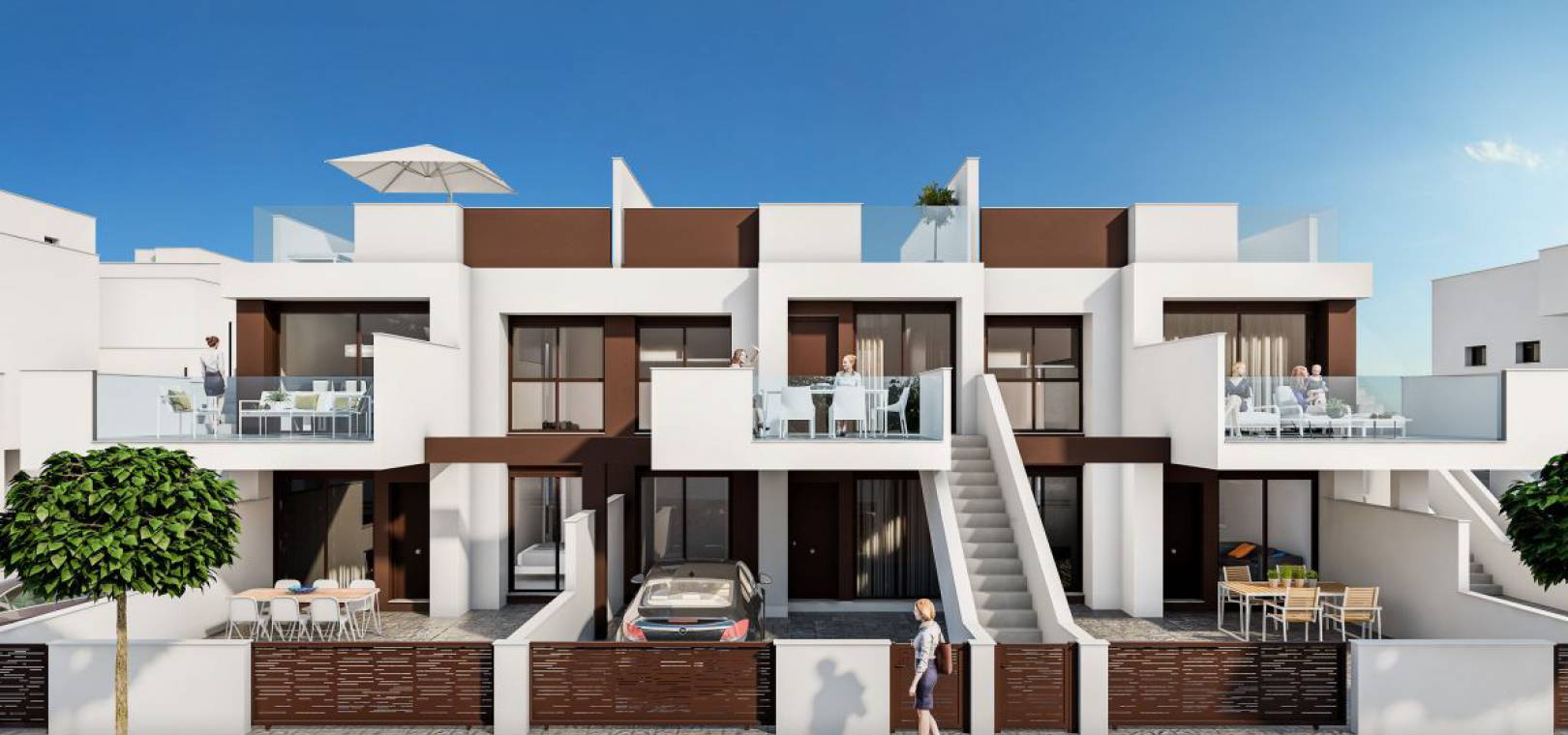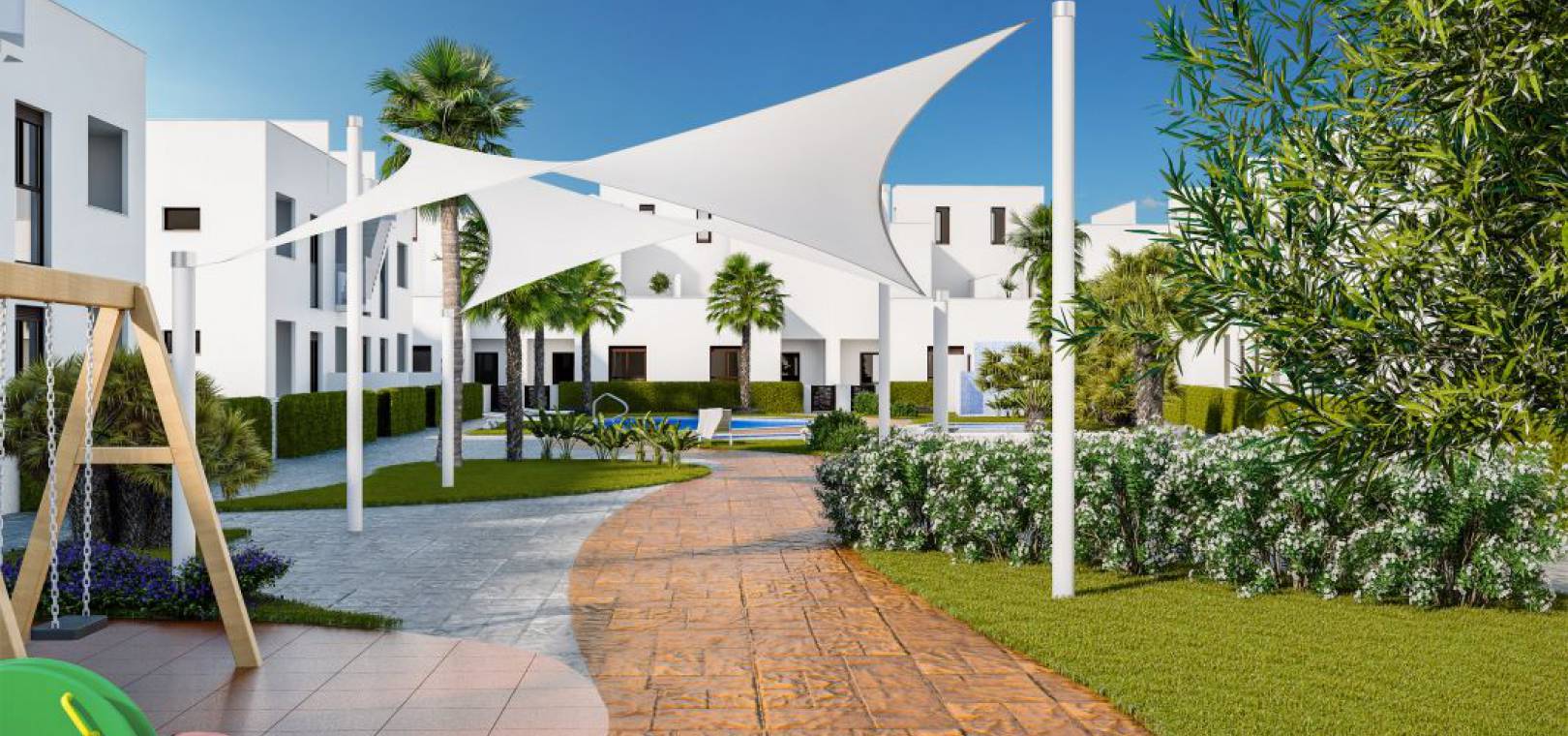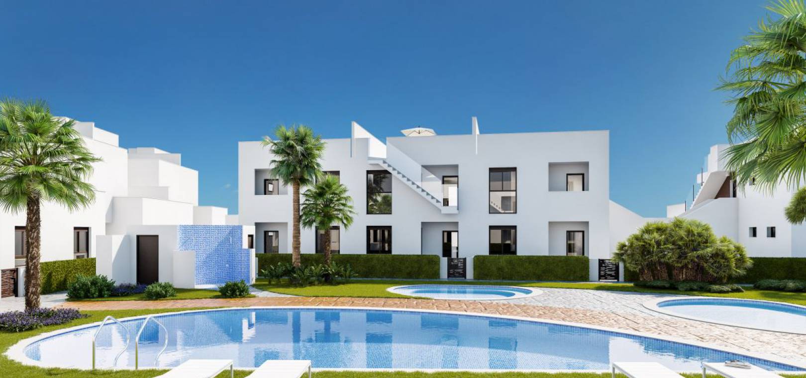 Deze fantastische ontwikkeling van nieuwbouwwoningen te koop in Torre de la Horadada biedt appartementen met 2 slaapkamers en herenhuizen met 3 slaapkamers in zeer moderne stijl en met grote terrassen. In het centrum van het complex bevindt zich een mooie gemeenschappelijke ruimte met groot zwembad.
