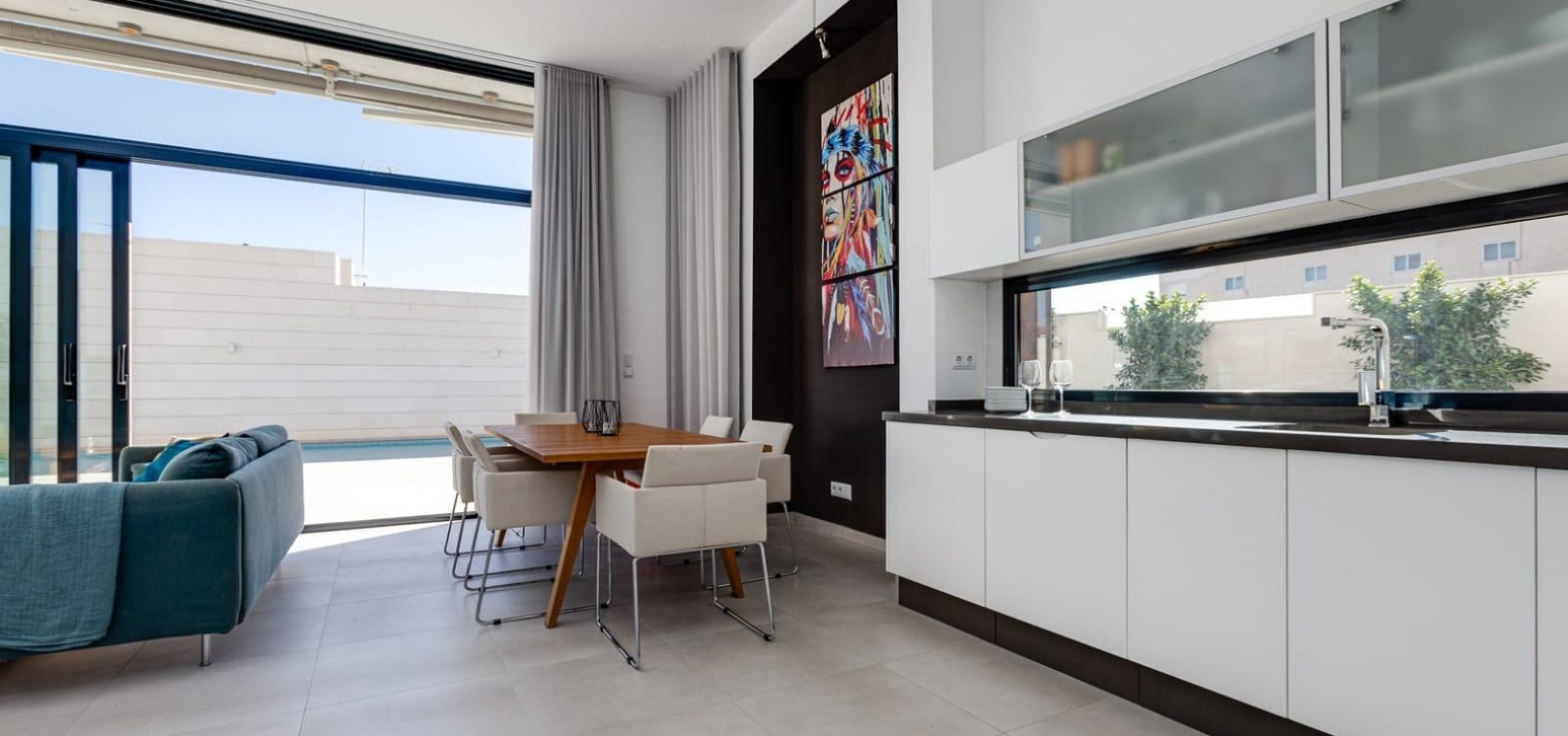 De dubbele hoogte van de woonkamer en het natuurlijke licht in de badkamers zijn enkele van de verrassingen die u in deze villa zult aantreffen.