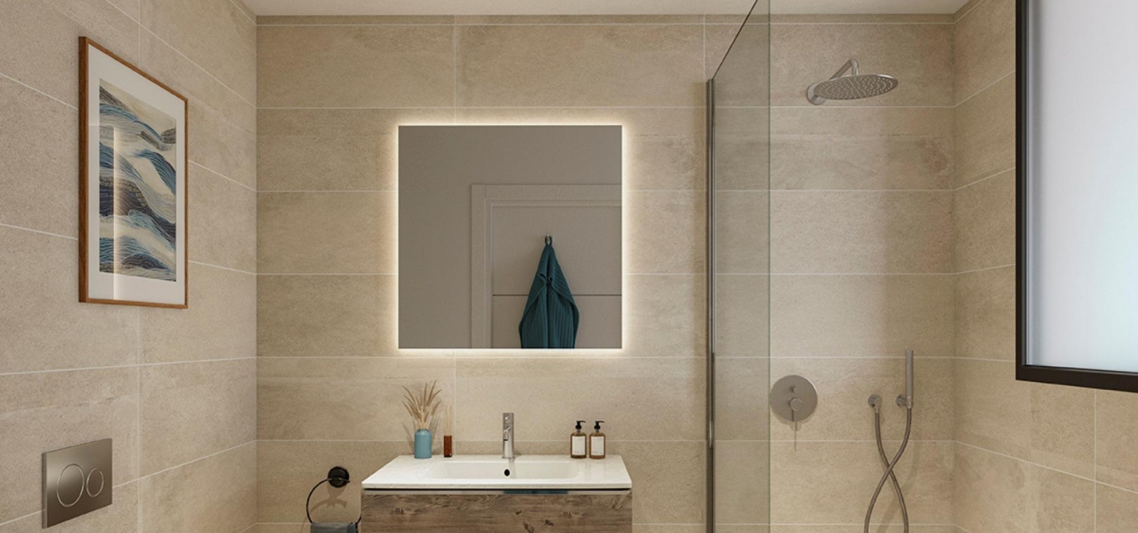 Badkamers met spiegels, doucheschermen en meubilair in de hoofdbadkamers.