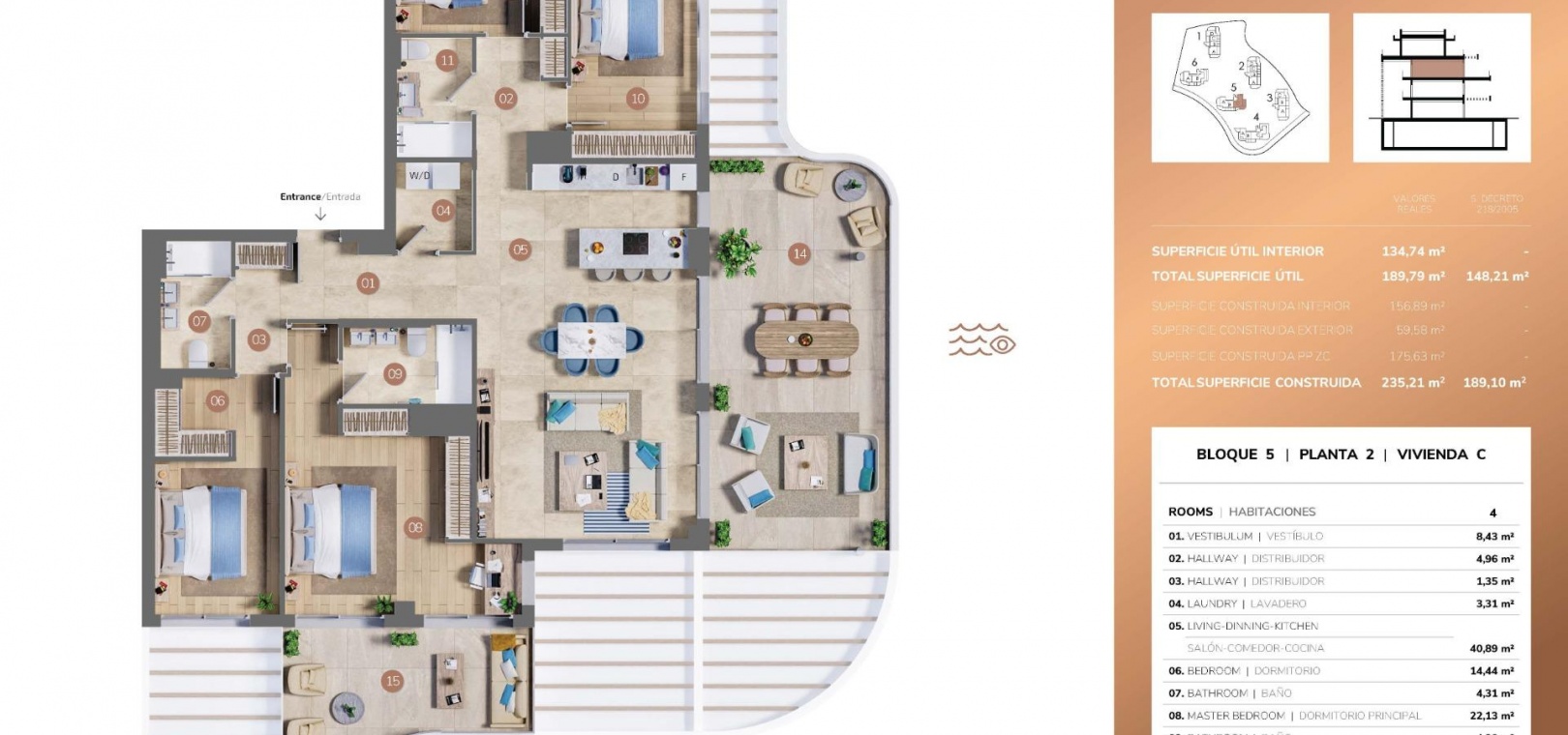 Het project bestaat uit 6 boetiekgebouwen met in totaal 71 premium appartementen, variërend van 1 tot 4 slaapkamers. Kies uit appartementen op de begane grond met een eigen tuin, appartementen op de middelste verdiepingen met grote terrassen of penthouses met ruime open terrassen. De interieurs worden overspoeld met natuurlijk licht door de kamerhoge ramen, terwijl de grote buitenruimtes een prachtig uitzicht op zee en de golfbaan bieden.