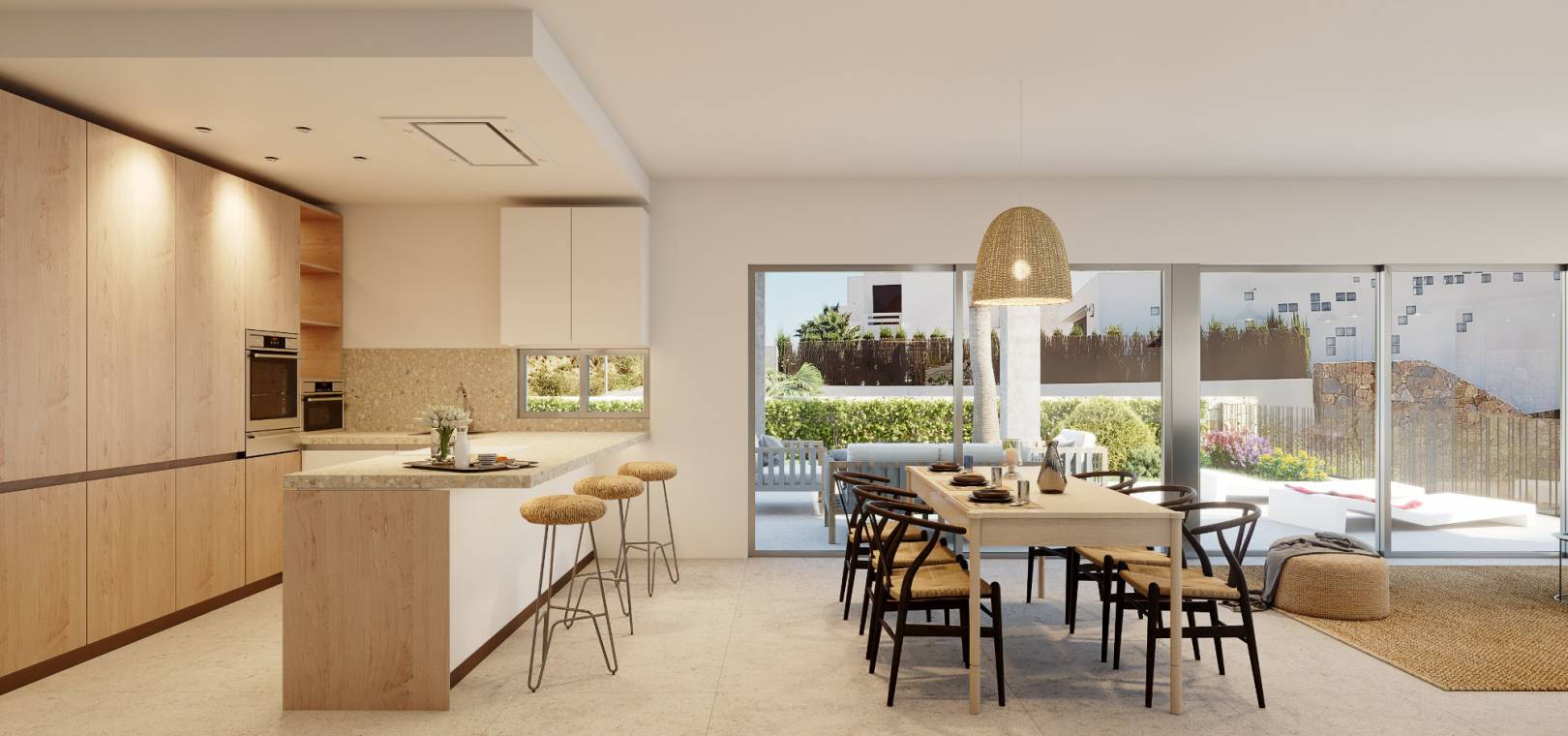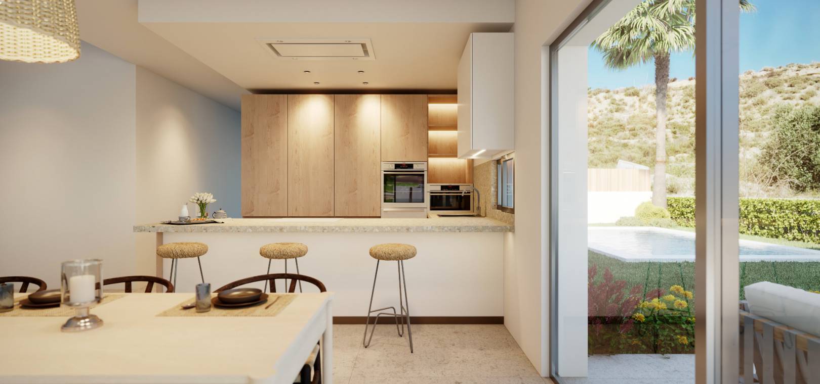 This stunning villa is built to the the highest standard and consists of a large open plan lounge with patio doors which lead out into the garden and terrace with a private swimming pool, an open plan modern kitchen with fitted appliances including oven, hob, extractor, dishwasher, fridge/freezer and microwave, dining area, a double bedroom with fitted wardrobes and a fully fitted bathroom on this level.