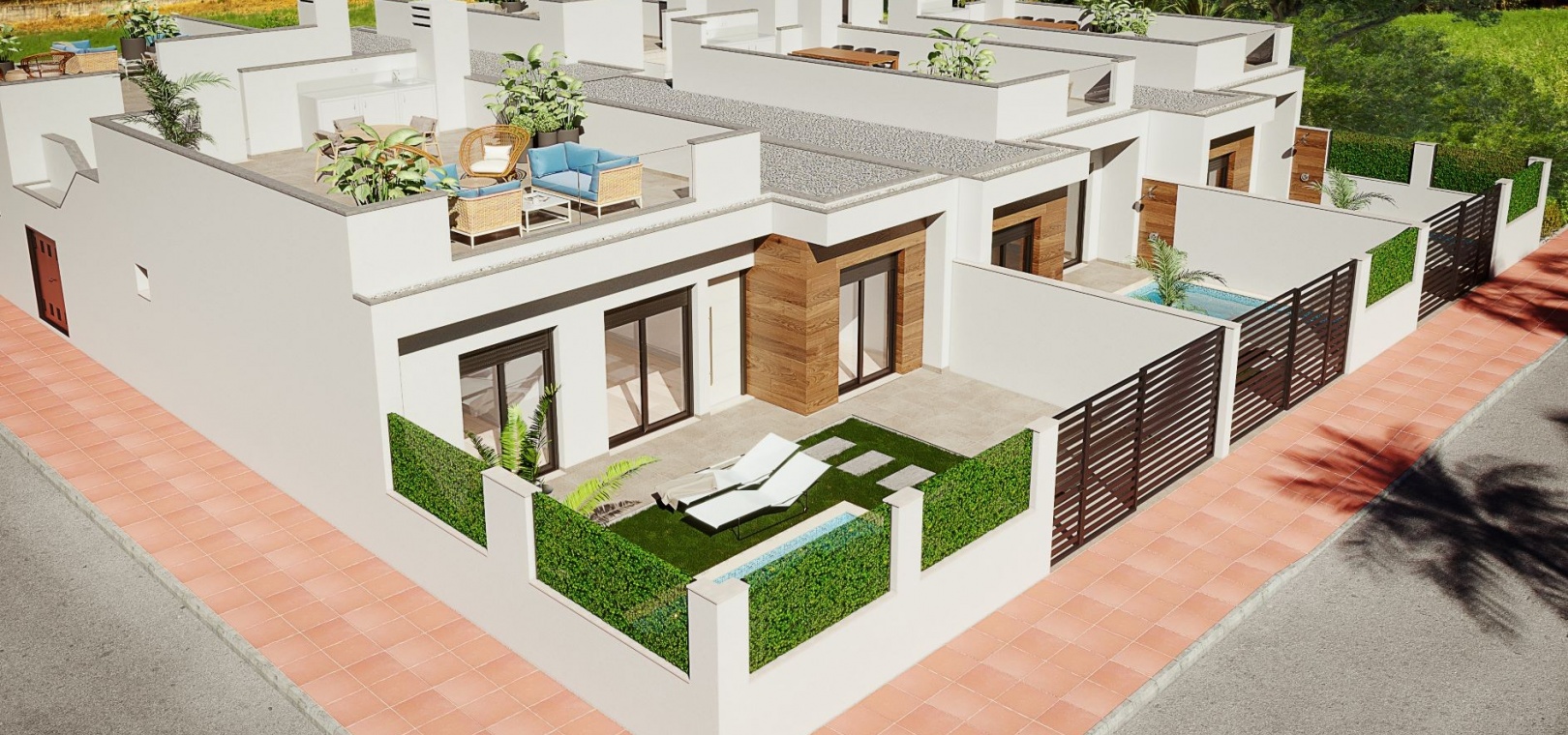 This luxury development has now been released for sale and consists of 28 villas with 2 or 3 bedrooms built all on one level situated on the outskirts of Los Alcazares in the lovely quiet Spanish village of Dolores de Pacheo. This lovely village has a host of local amenities including banks, supermarket, shops, bars and restaurants and the busting town of Los Alcazares and the Mar Menor beach with its stunning promenade are a short 5 minute drive away.