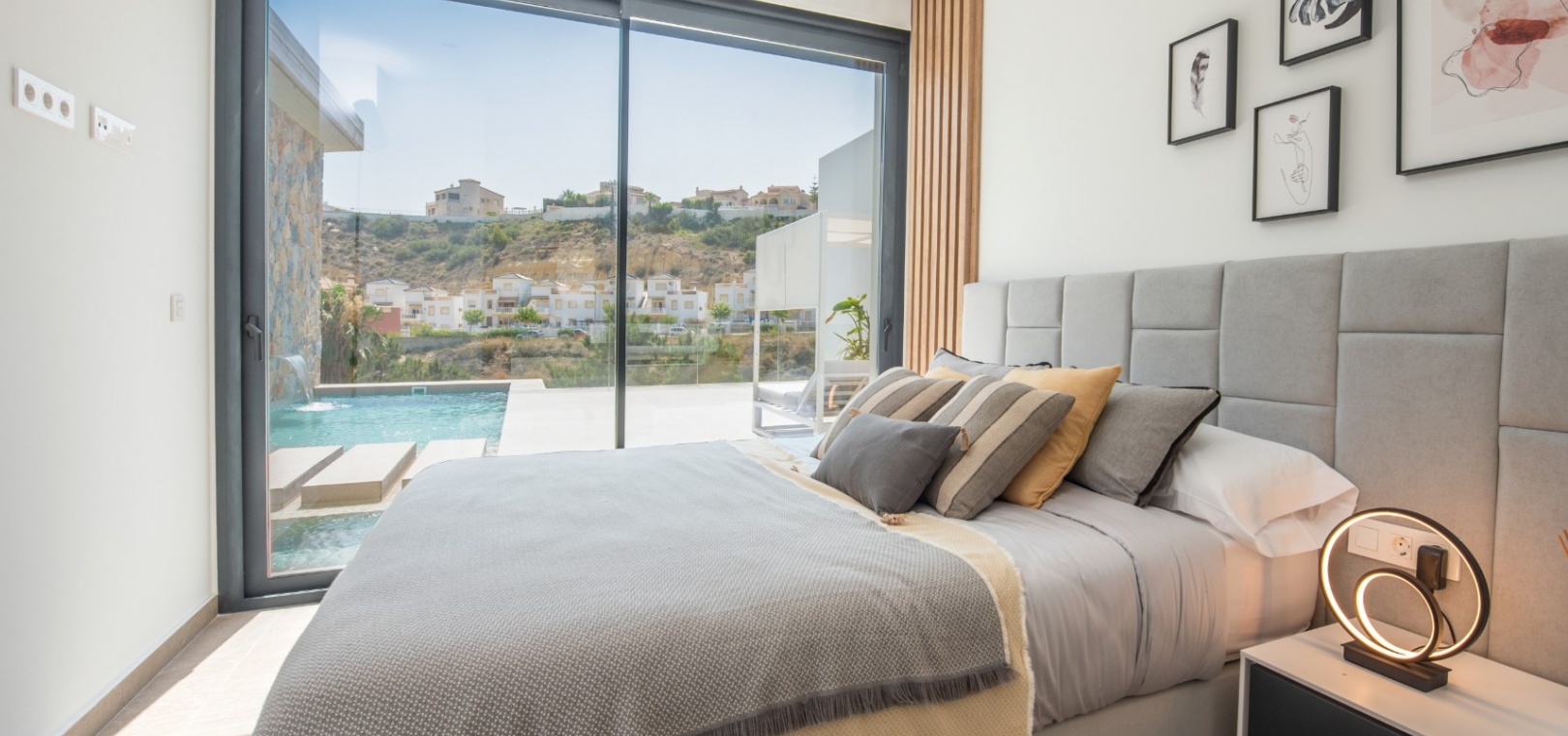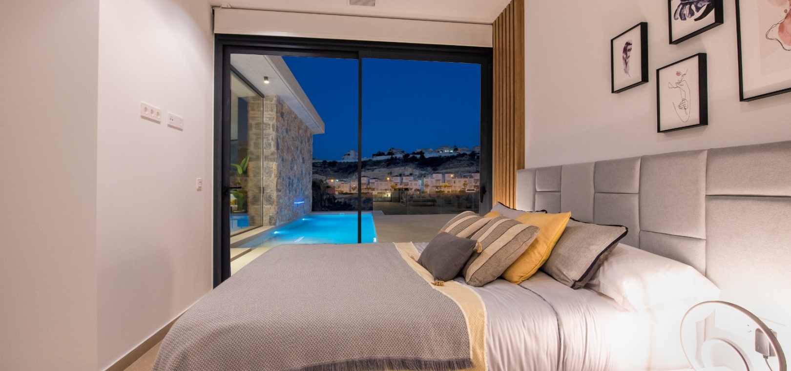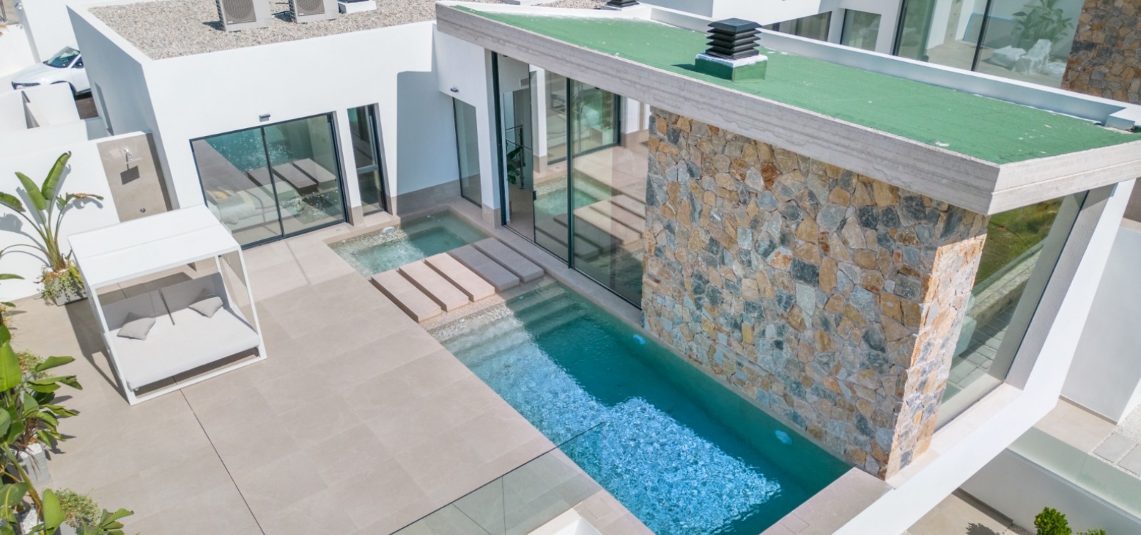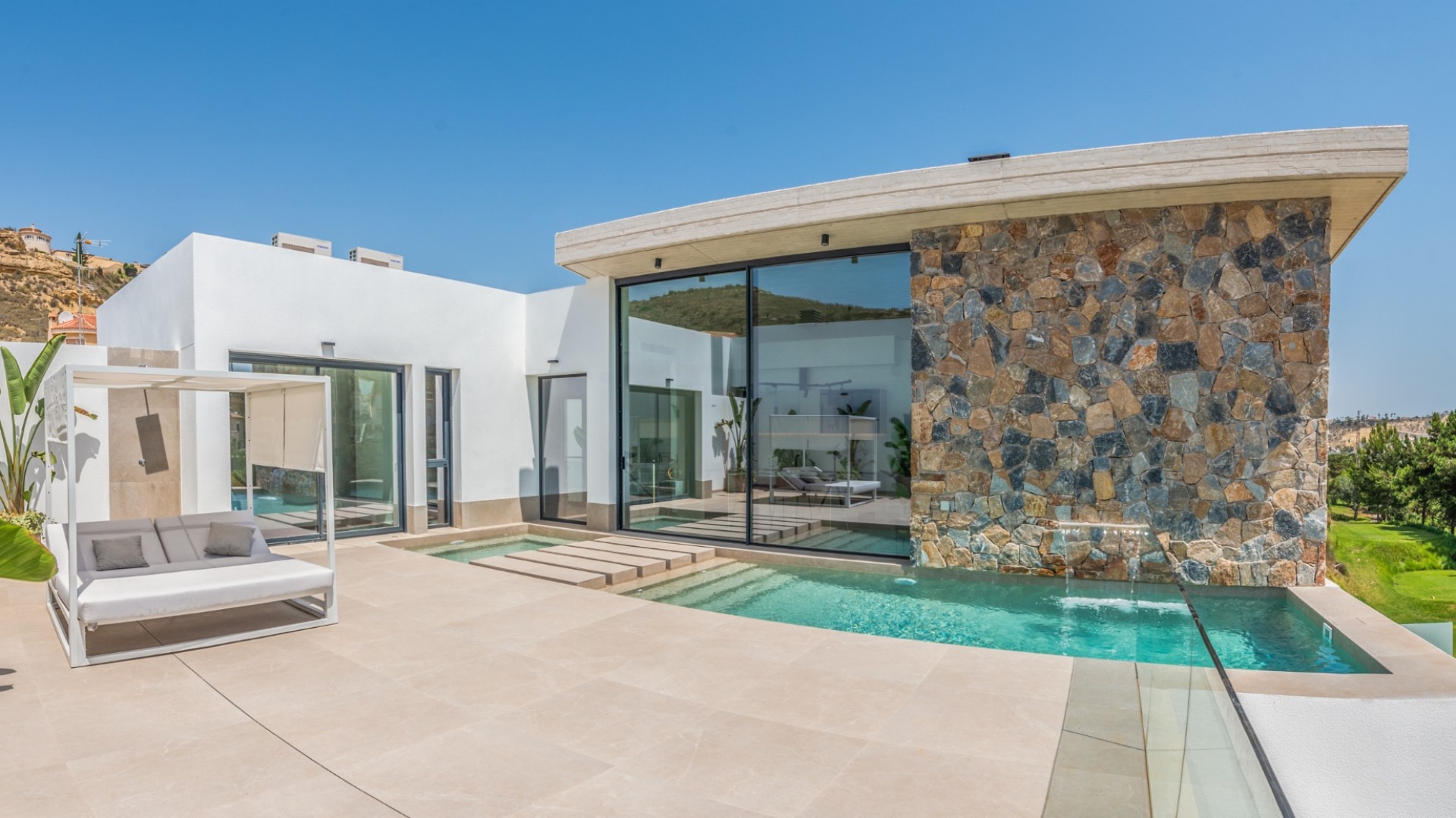 This luxurious villa has a lovely open plan lounge with patio doors which lead out into garden complete with private pool, a modern fitted kitchen with fitted appliances including oven, hob, extractor, fridge/freezer, washing machine, dishwasher and microwave, dining area, a master bedroom with walk in wardrobe and en-suite, two further double bedrooms with fitted wardrobes and a guest bathroom.