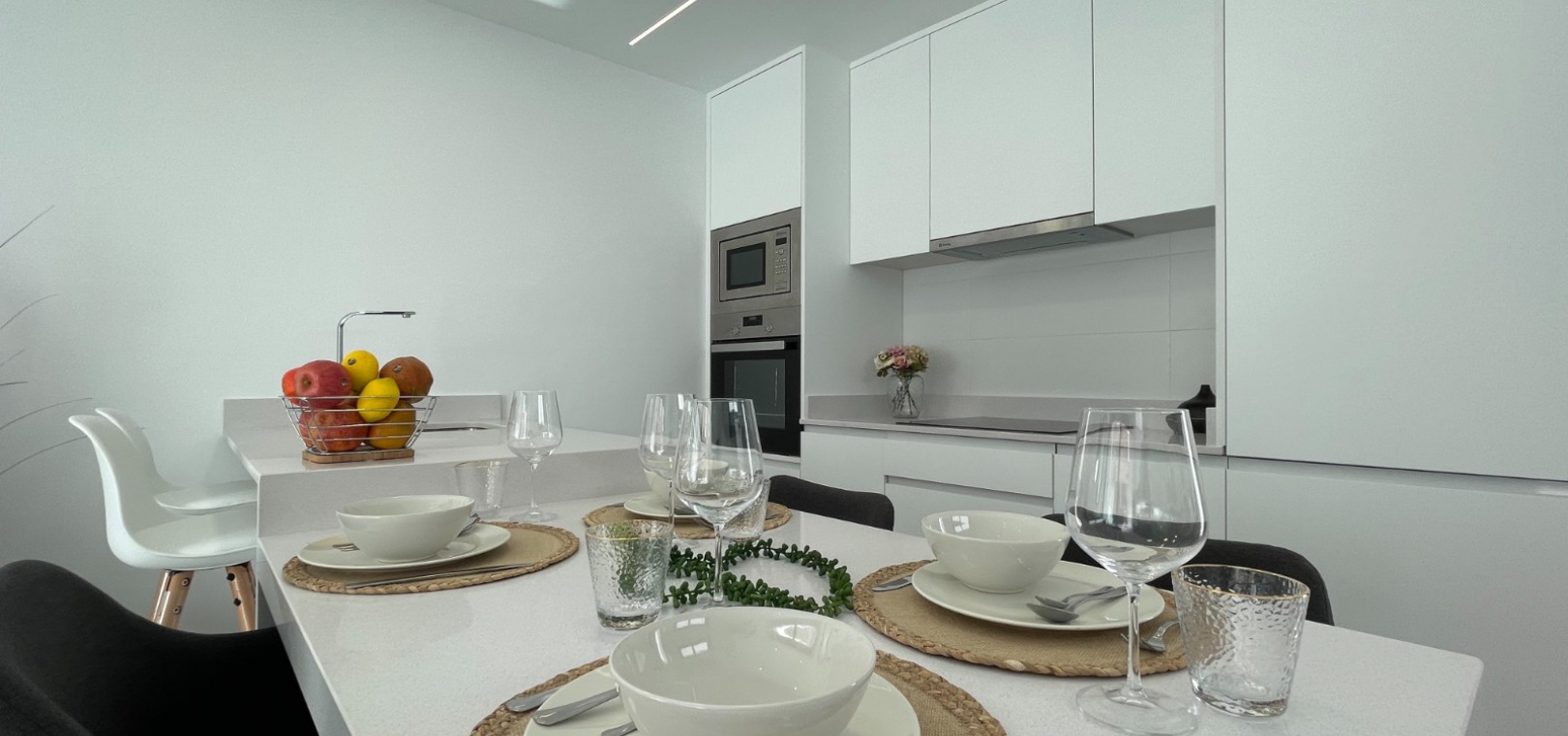 On the first floor there is the master bedroom with fitted wardrobes and private sun terrace, a further double bedroom with fitted wardrobes and a fully fitted bathroom. A staircase leads up to the rooftop solarium where you can enjoy all day sun.