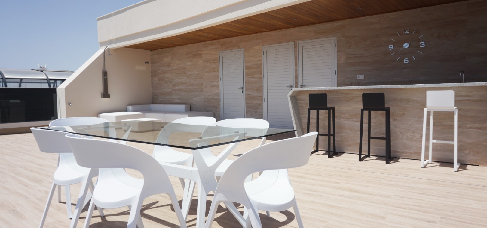 On the first floor there is the master suite complete with fitted wardrobes and a fully fitted bathroom, two further double bedrooms with fitted wardrobes, a large bathroom and an internal staircase which leads up to a private rooftop solarium complete with a bar, kitchen and a further bathroom.