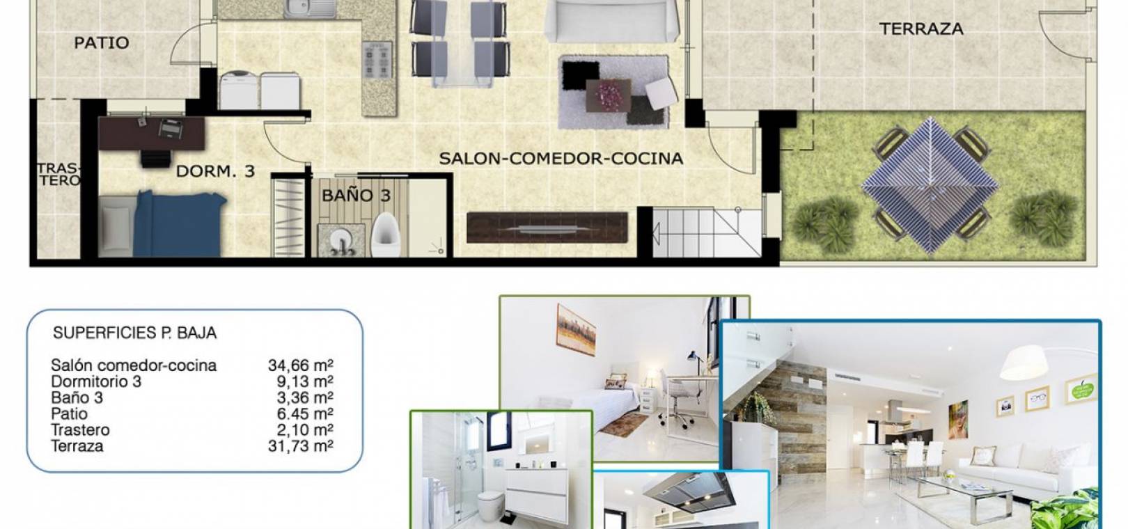Don Benito brand new townhouses are set in a great location situated only a few minutes walk from the Villamartin Plaza which has a great choice of restaurants, bars and shops. The beautiful Blue Flag beaches of Orihuela Costa are only a short drive away, as is the famous Zenia Boulevard shopping complex. The airports of Alicante and Murcia are just forty minute and 25 minutes respectively by car