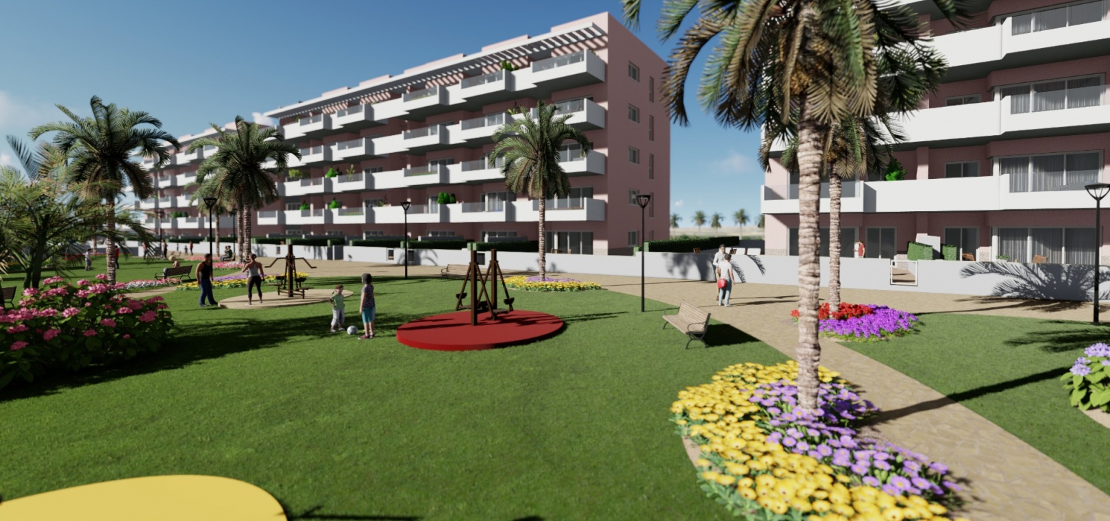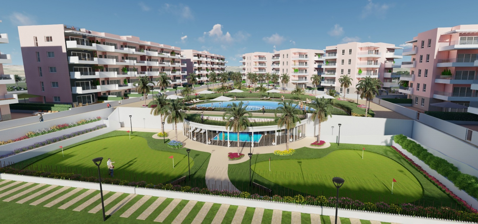 These stunning apartments are available in a ground floor with large terrace/garden, first floor with sun terrace or penthouse with rooftop solarium. The development includes lovely communal gardens with outdoor swimming pool, children's play area, jacuzzi, mini golf, petanque court, gym, heated pool and spa and secure underground parking is also included.