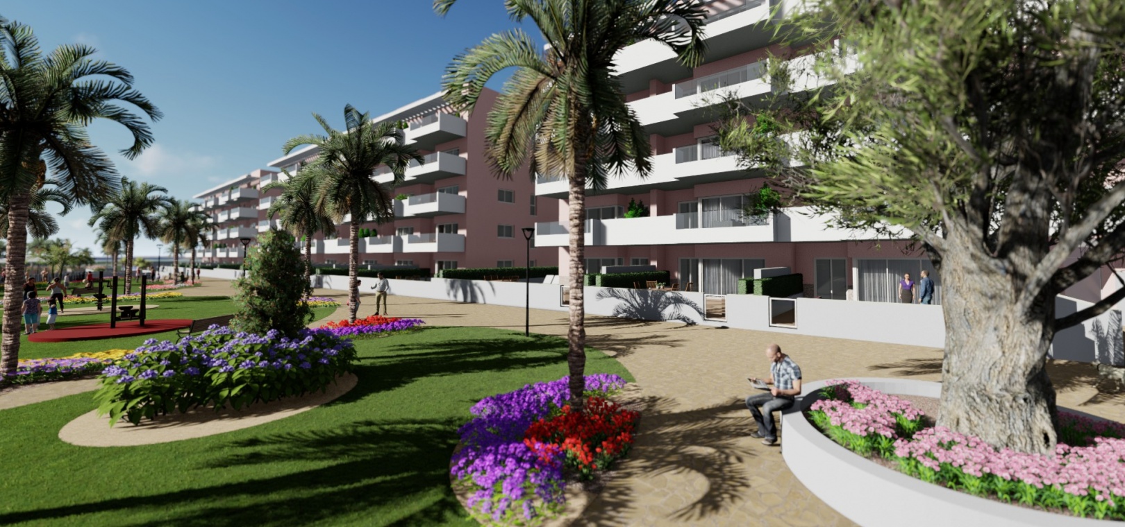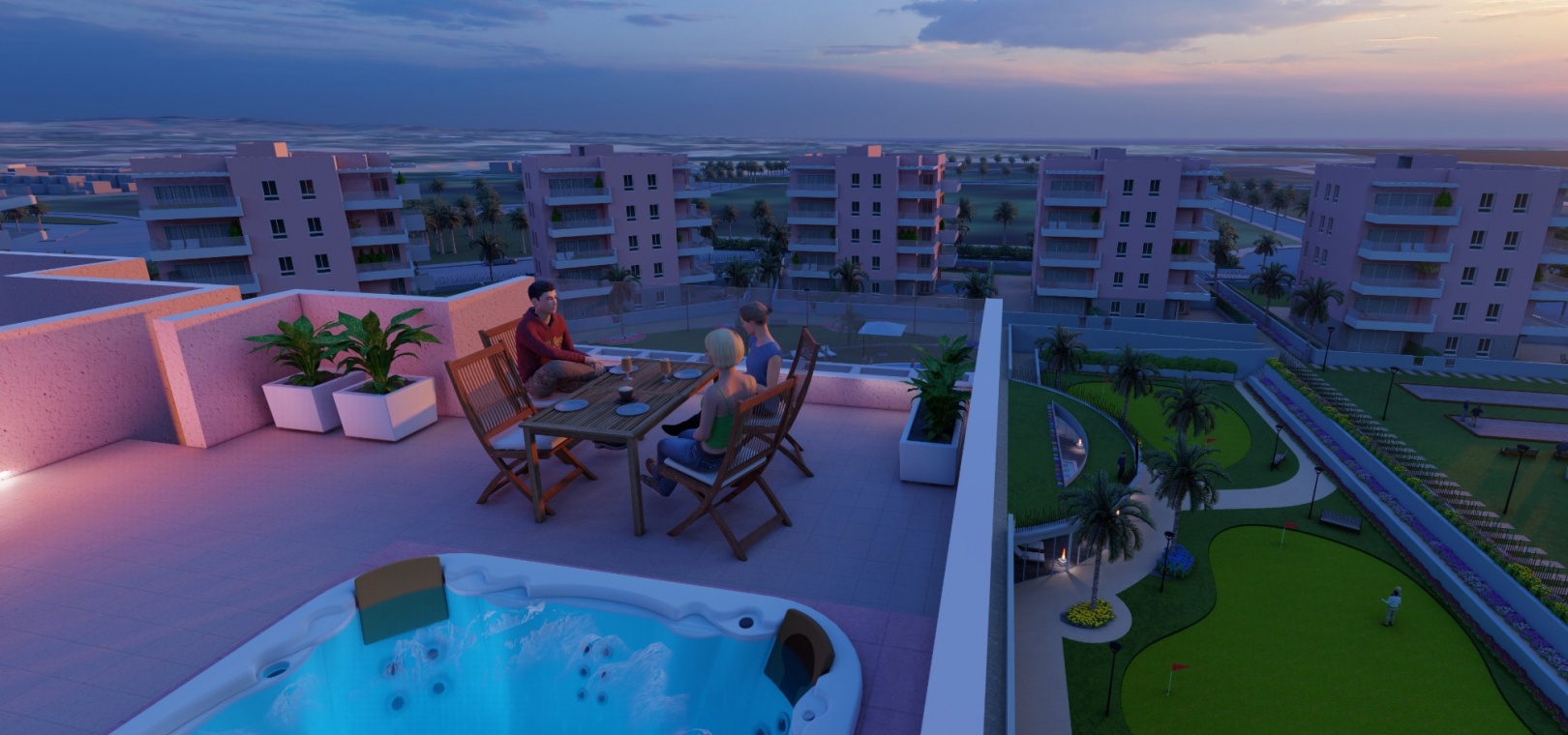 These stunning apartments are available in a ground floor with large terrace/garden, first floor with sun terrace or penthouse with rooftop solarium. The development includes lovely communal gardens with outdoor swimming pool, children's play area, jacuzzi, mini golf, petanque court, gym, heated pool and spa and secure underground parking is also included.