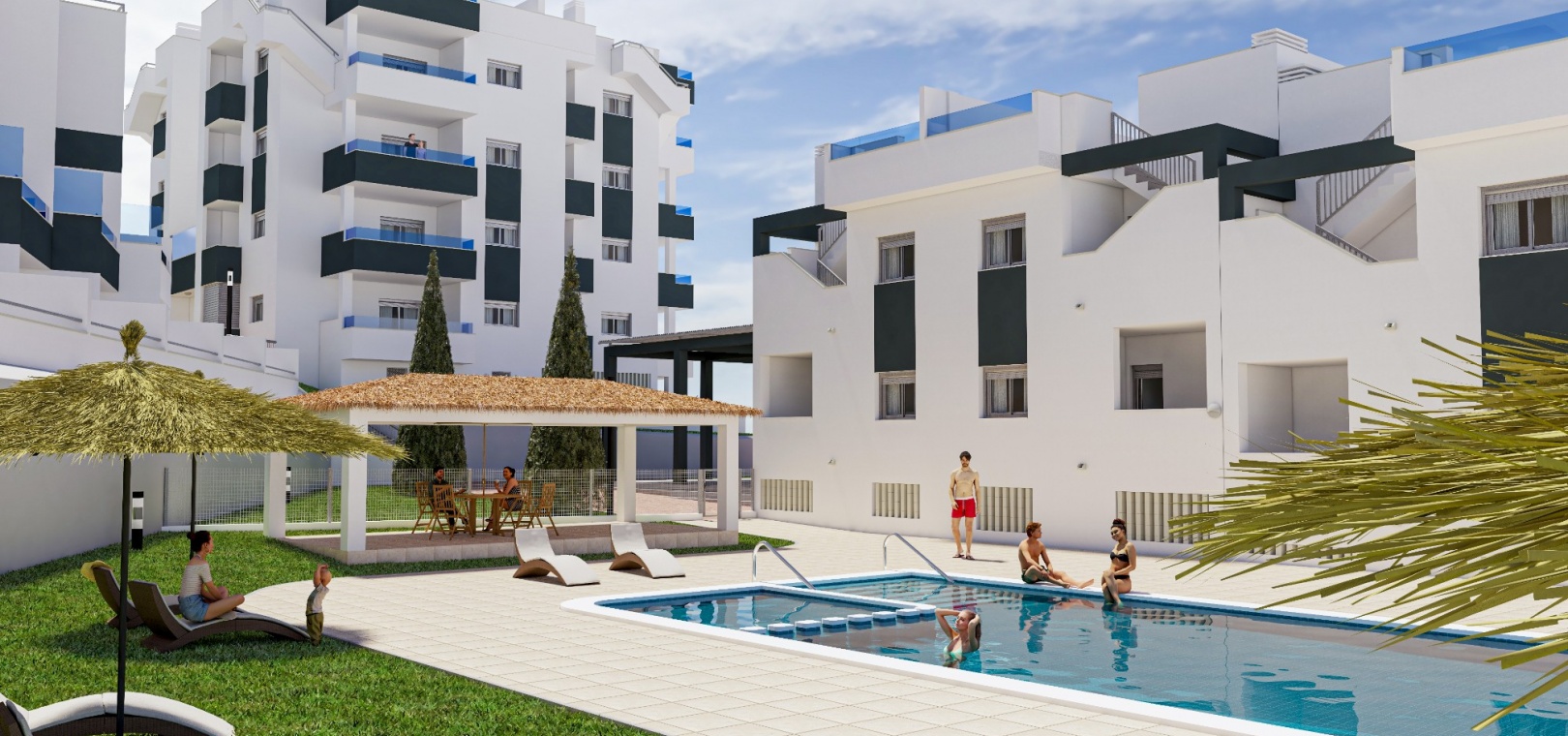 Sunset Hills residential is a project featuring brand new 2 bedroom, 2 bathroom apartments for sale located in Los Altos near the ever popular Villamartin. These homes are in a great location, situated only a few minutes walk from the Via Park 3 commercial centre which has a host of amenities including restaurants, pharmacy, bars and shops. The fantastic blue flag beaches and La Zenia boulevard shopping mall are less than a 10 minute drive away.