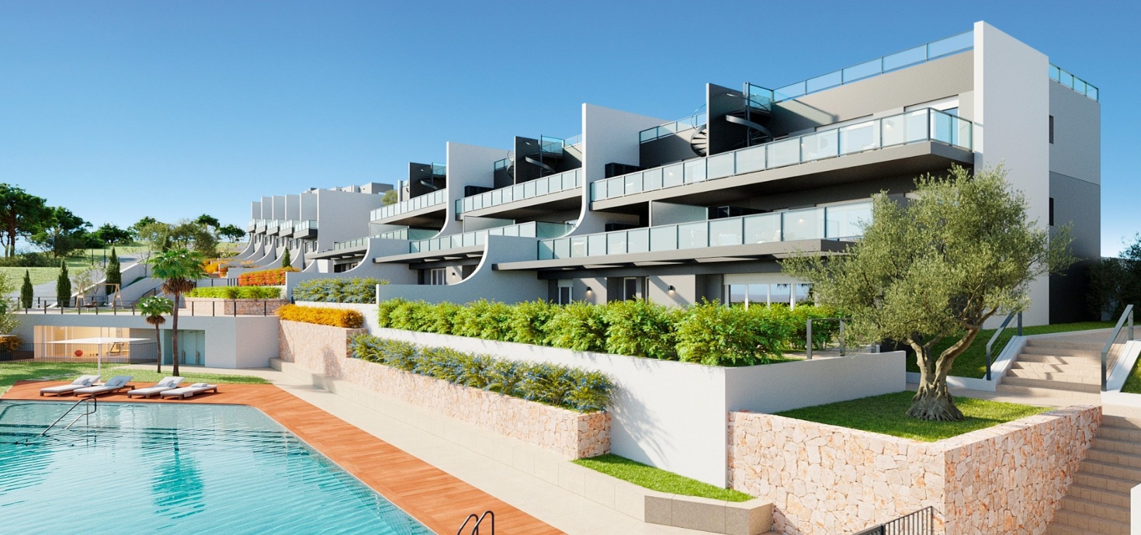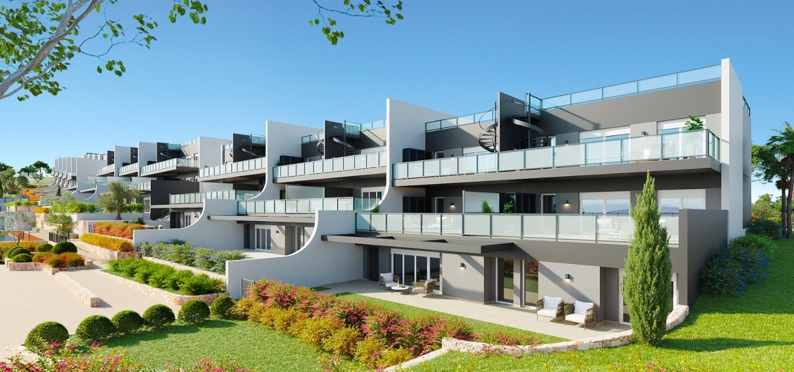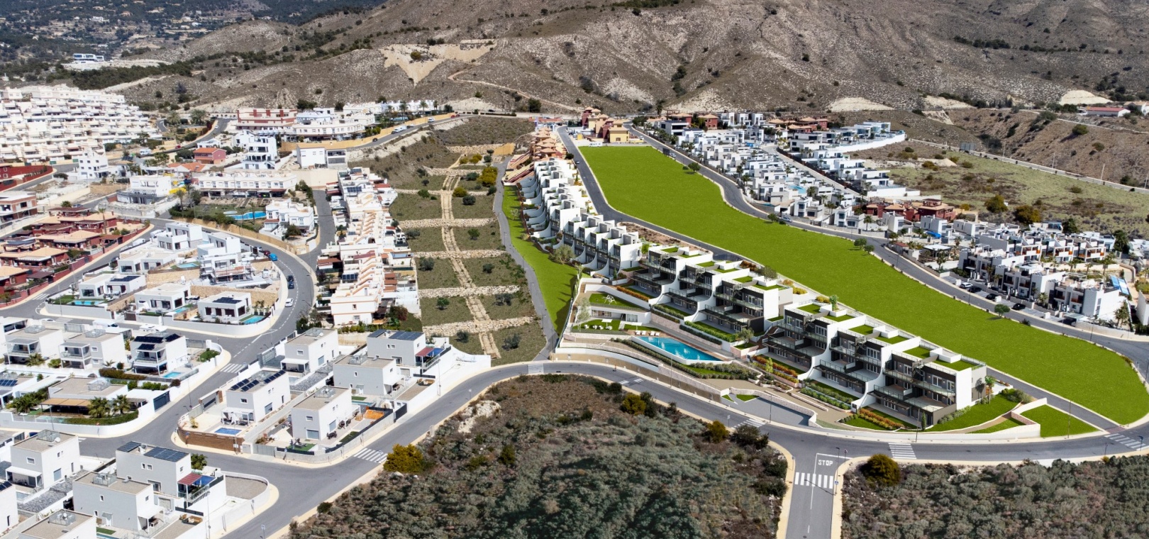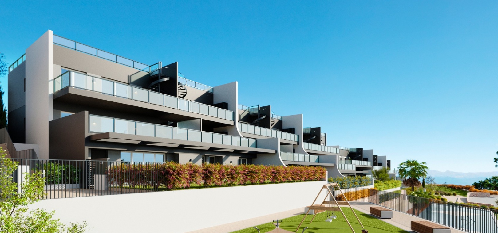 Residential Breeze resort is an luxury exclusive development, situated in Finestrat on the Sierra Cortina hills very close to the bustling town of Benidorm. The resort enjoys panoramic views of the sea, is a 5 minute drive to a shopping mall and a host of amenities and a short 10 minute drive from the stunning beaches of Benidorm. There is the famous Terra Mitica theme park, a water park, a go karting track and 2 golf courses a few minutes away from the property.