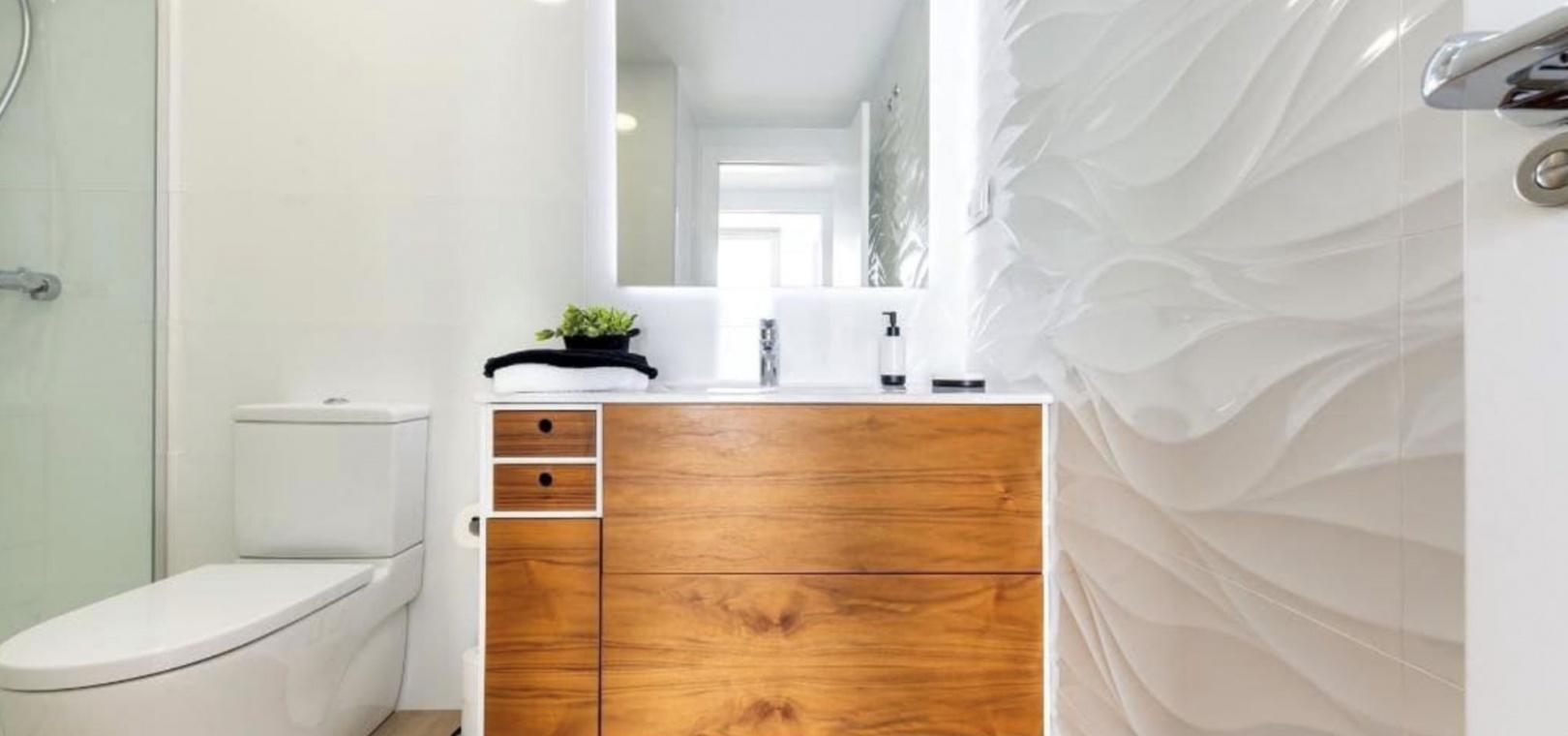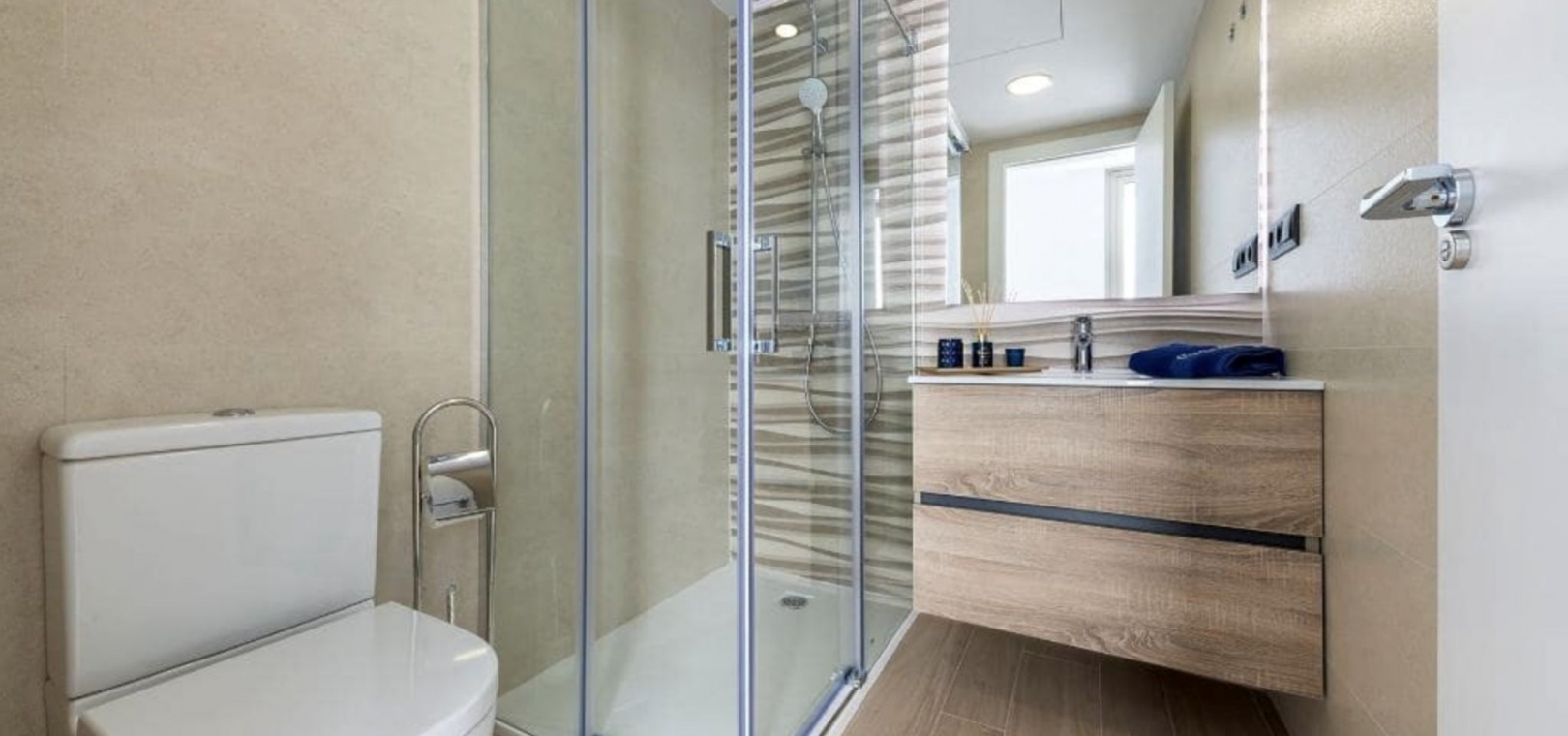 On the upper level you will find the master bedroom with fitted wardrobes and en-suite, a further double bedroom with fitted wardrobes and a fully fitted guest bathroom. An external staircase leads up to the private rooftop solarium where you can enjoy all day sun and lovely sea views.