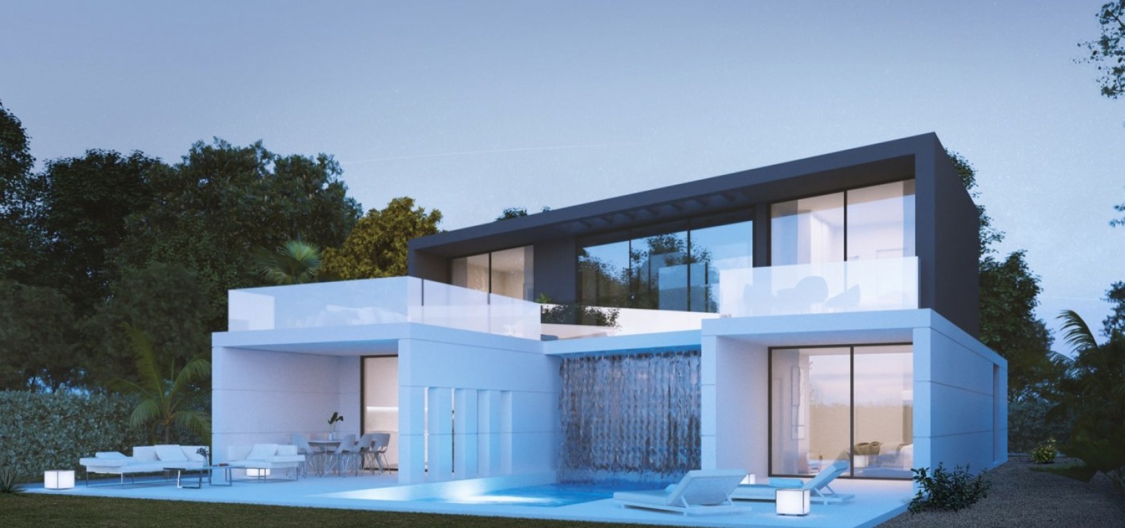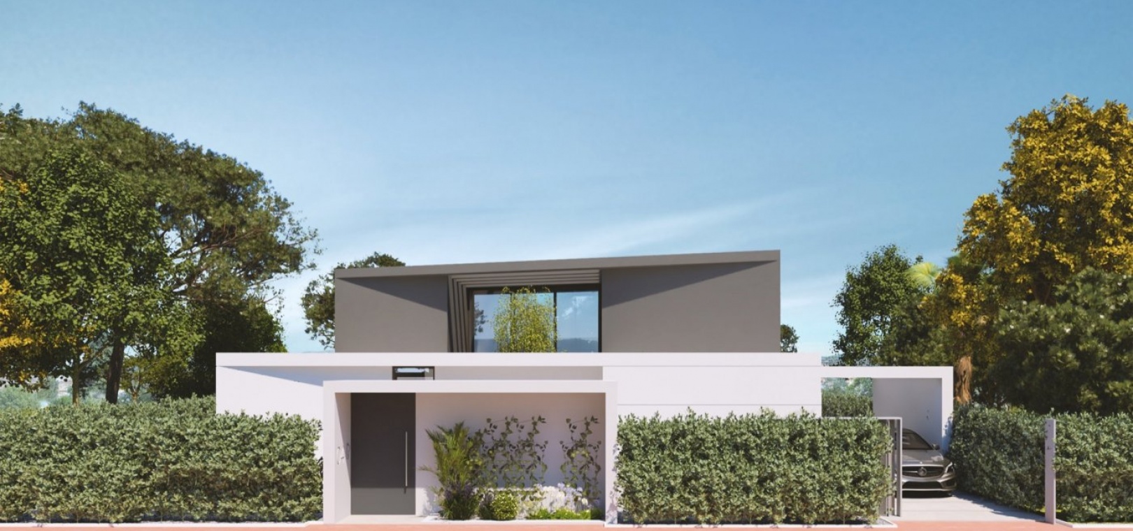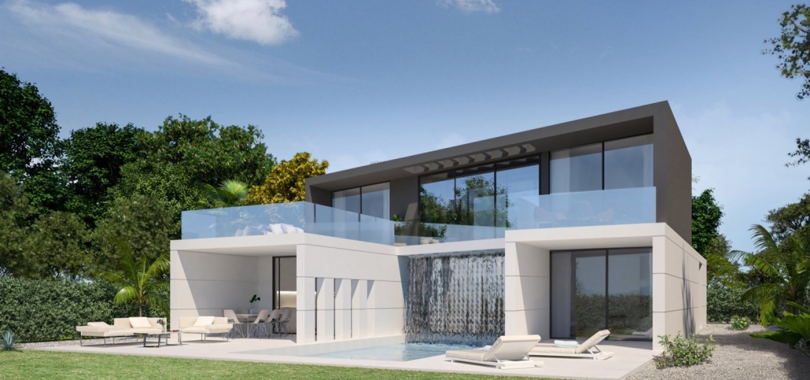 New Build Modern villa distributed over 2 floors, with 4 bedrooms, 4 bathroom with built in wardrobes and terraces, open plan kitchen with living room with large windows and direct access to the garden with pool and parking space.