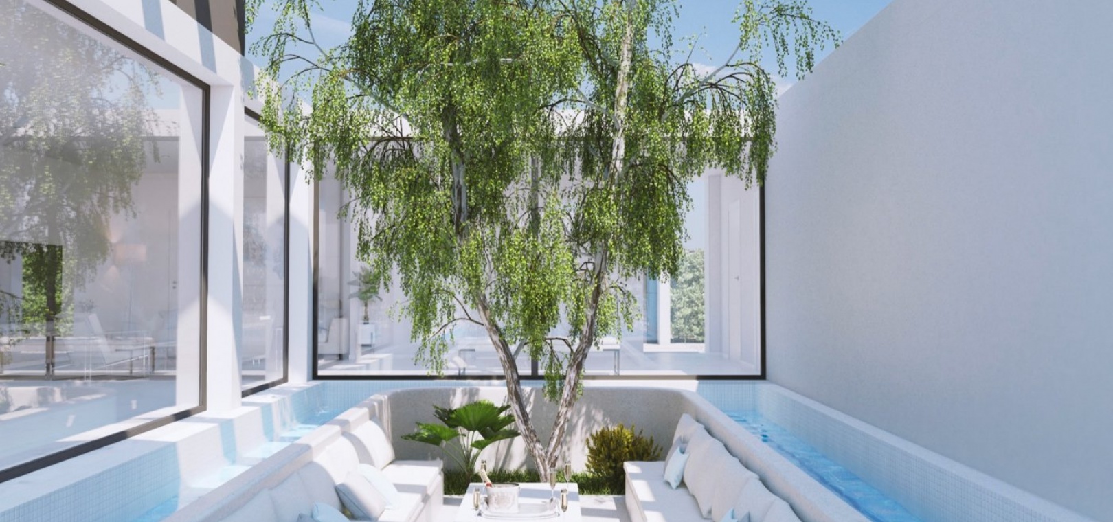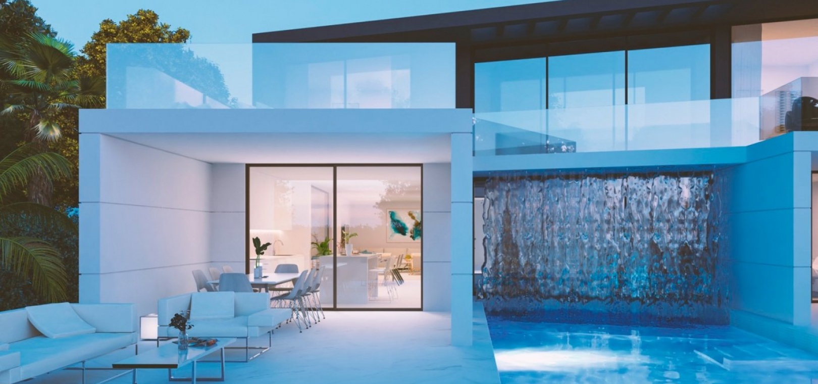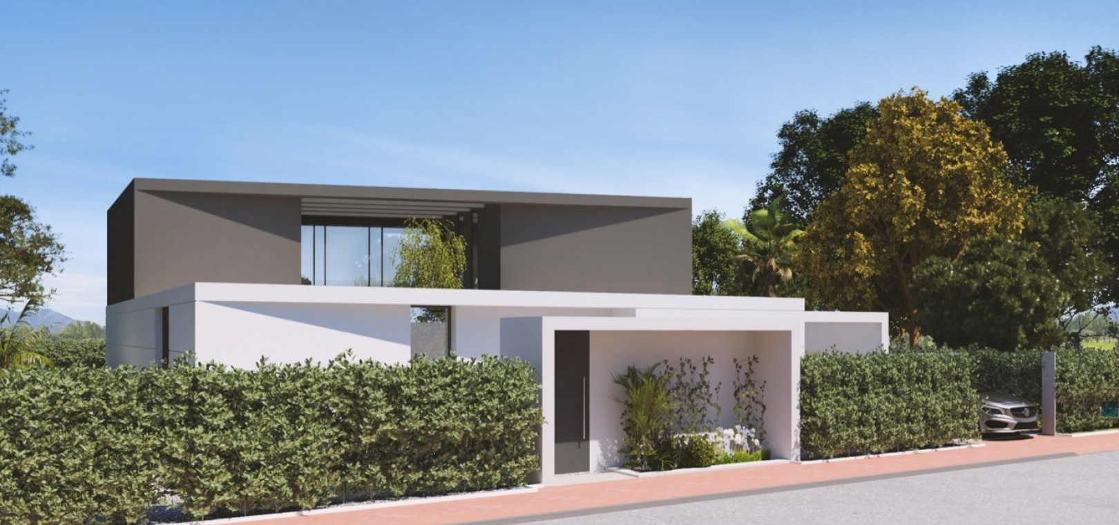 New Build Modern villa distributed over 2 floors, with 4 bedrooms, 4 bathroom with built in wardrobes and terraces, open plan kitchen with living room with large windows and direct access to the garden with pool and parking space.