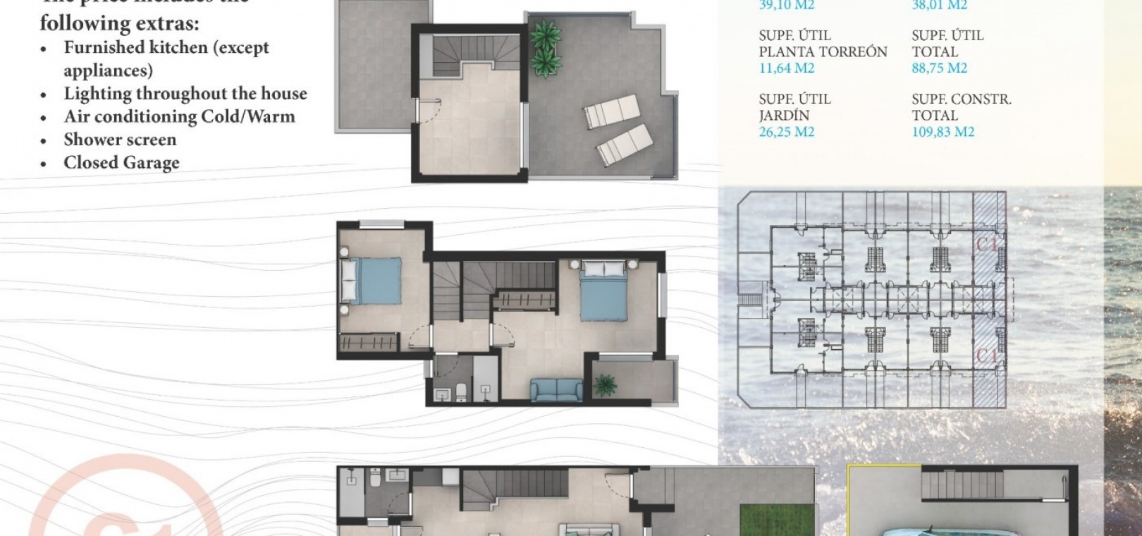 Mediterranean Sea. Unbeatable for its situation, just 800 meters from the port of Tomás Maestre, where we will find a select leisure area with bars, cafes, restaurants, shops, supermarkets, pharmacies, banks, etc. This project have 28 magnificent duplexes with 2 and 3 bedrooms. In Residencial the homes have been designed, to take advantage of every corner of the house, as well