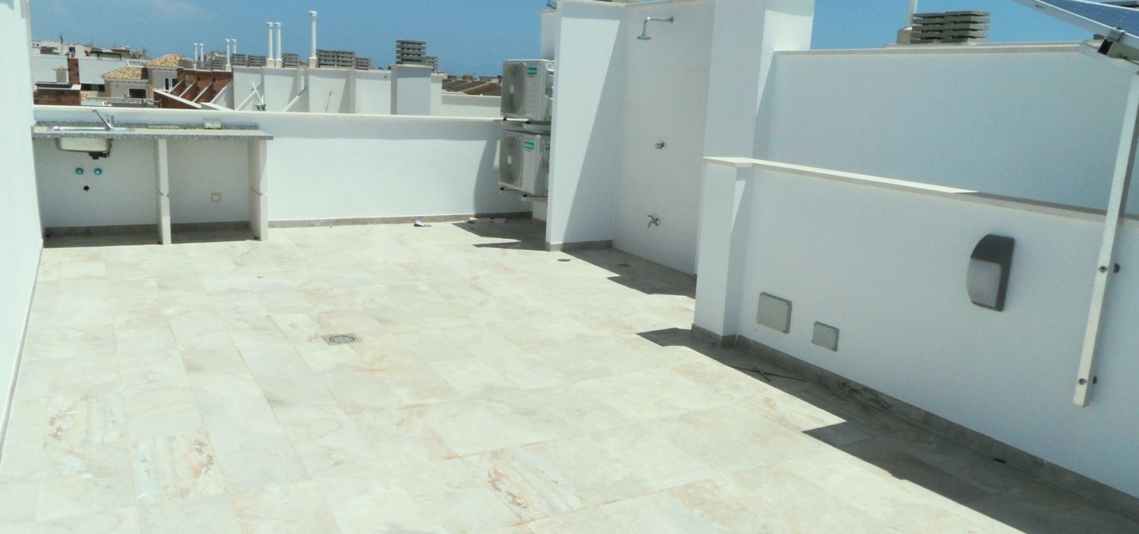 On the first floor, the master bedroom offers a private retreat with fitted wardrobes and a private terrace, perfect for enjoying the surrounding views. Another bedroom with fitted wardrobes and a fully fitted bathroom completes the living accommodation on this level. Additionally, a staircase leads up to a generous 41 m² private rooftop solarium, offering panoramic views and all-day sun exposure.