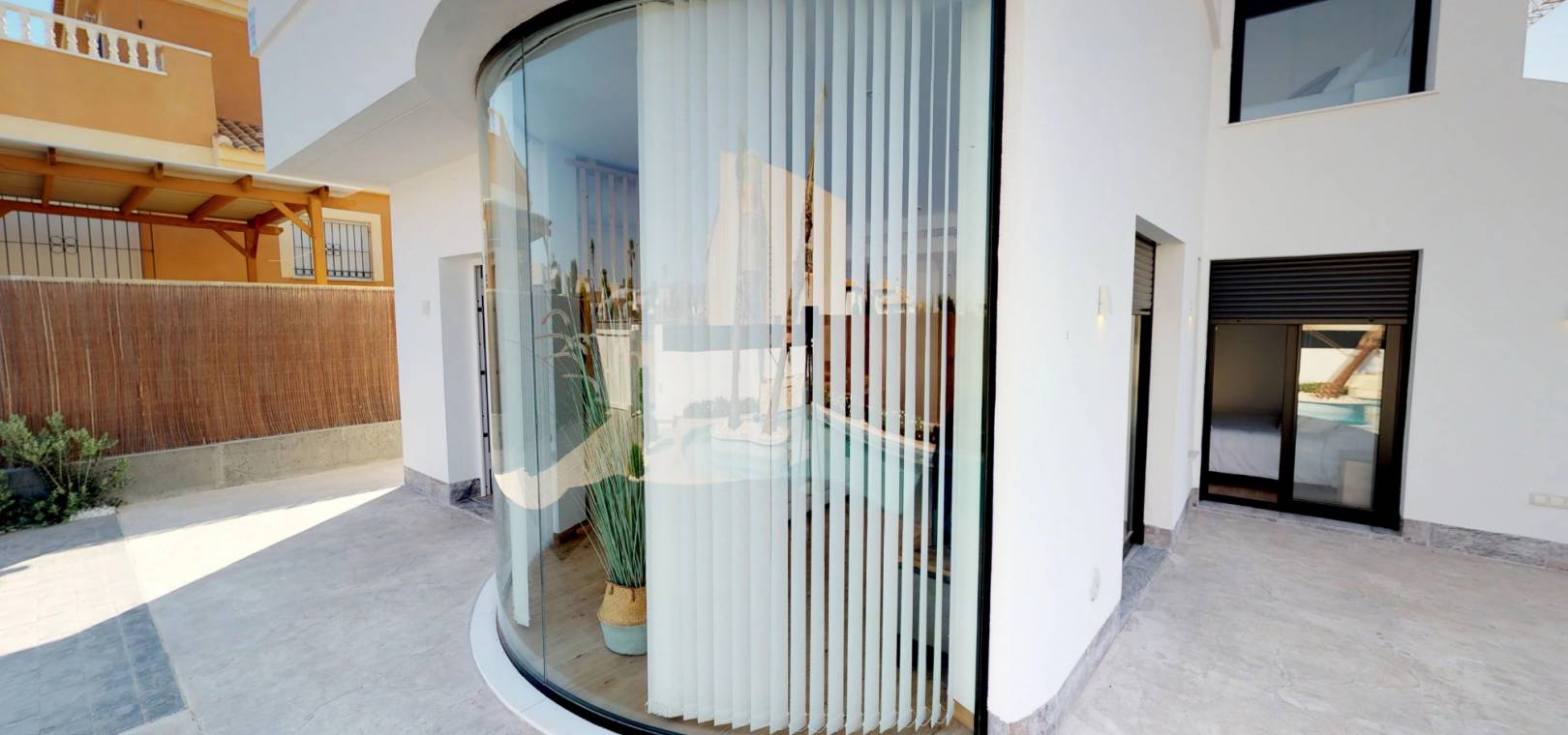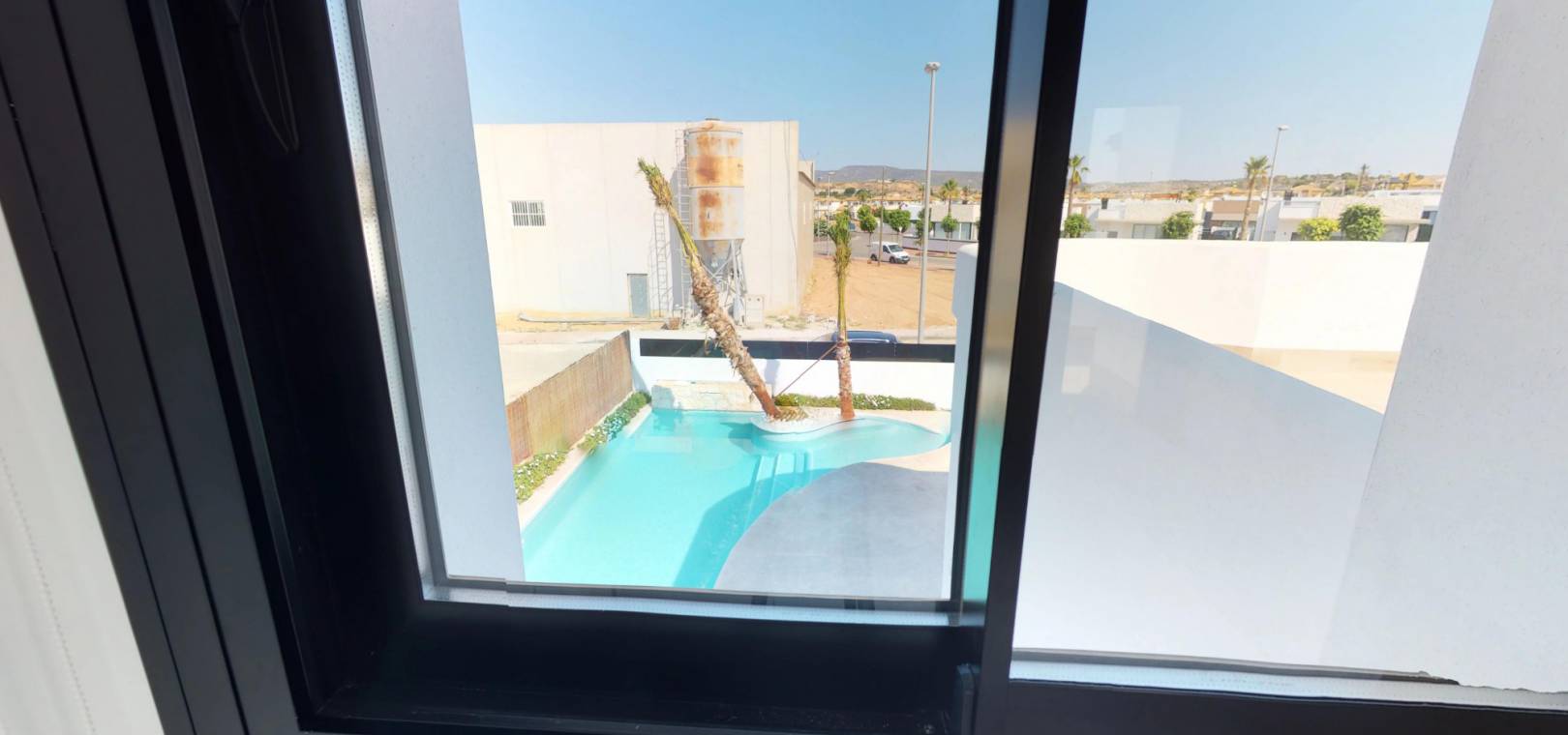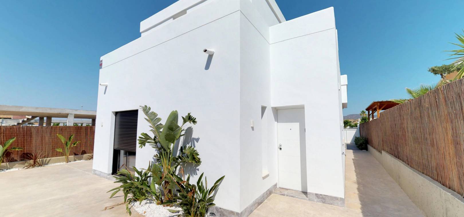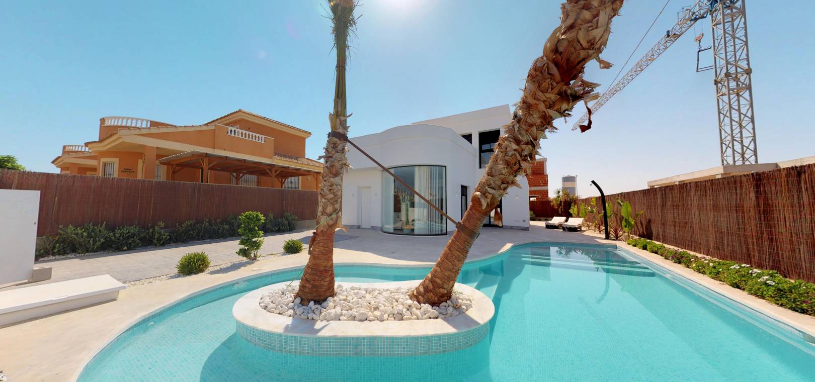 These stunning properties are cleverly designed with clean lines and lovely curves incorporated in the facade. The living area is open plan with the kitchen to the side with a back door and at the front is a feature curved bay window. The showhouse has an optional breakfast bar doubling as a dining table. There are 2 double bedrooms on the ground floor with built in wardrobes and patio door leading outside and a good sized shared bathroom. On the first floor, we have a larger master en-suite and access to a very large wrap around terrace/solarium. We have options to fully personalise the interior finishes with our choice of floor and bathroom tiles/cabinets. Externally the good sized plot is laid to concrete unless otherwise requested, to leave more room for planting etc, with a large lagoon style pool that has a jacuzzi feature. Off street parking to the front and the showhouse features an option outside kitchen and BBQ behind a motorised shutter.