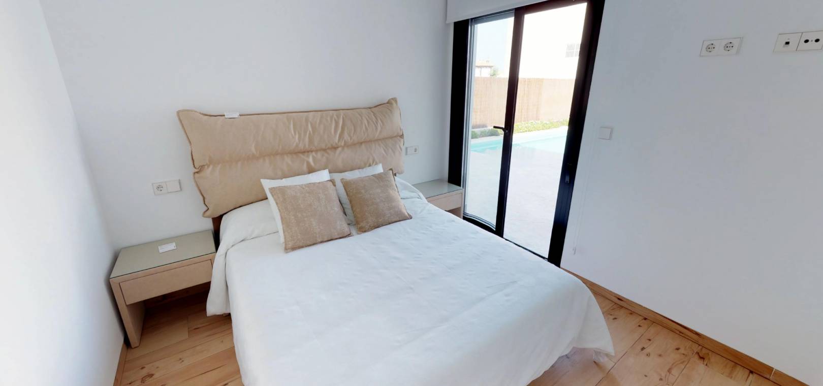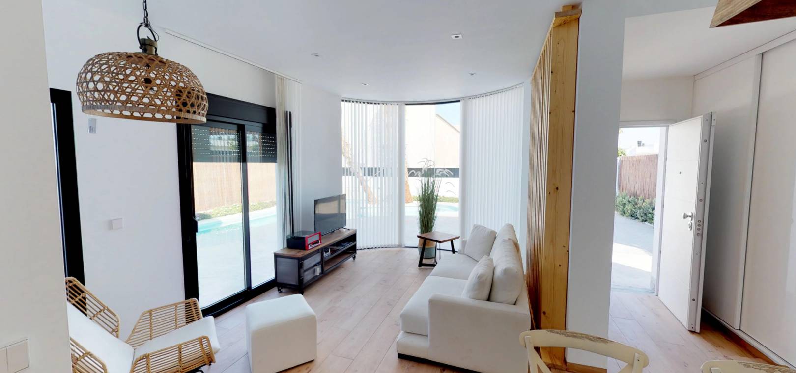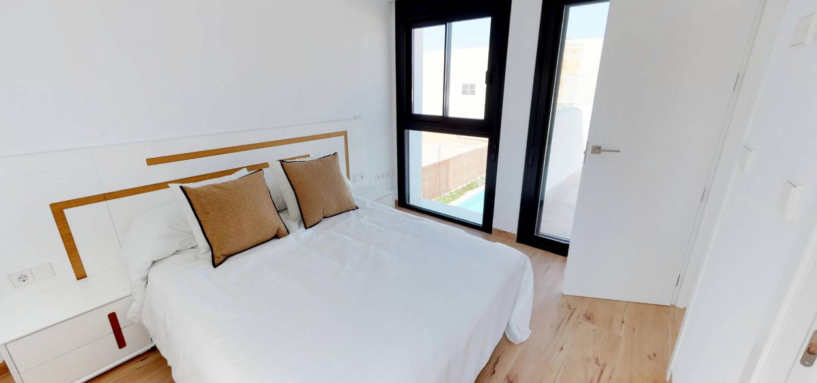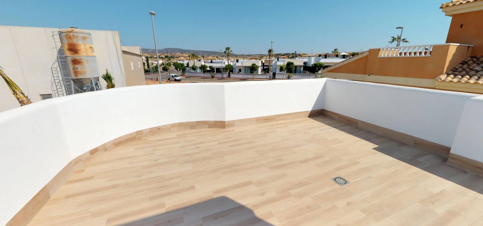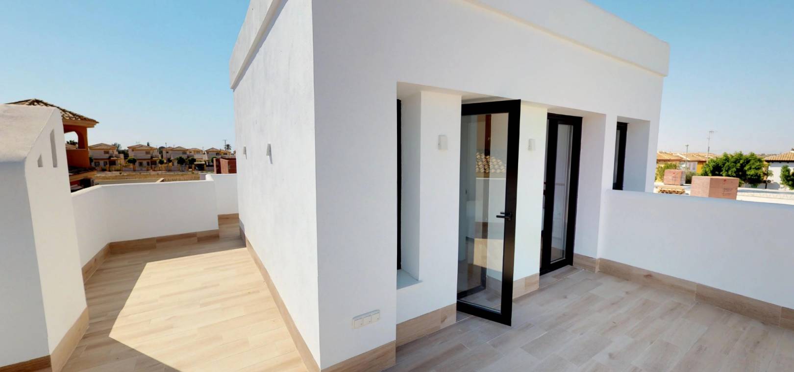 These stunning properties are cleverly designed with clean lines and lovely curves incorporated in the facade. The living area is open plan with the kitchen to the side with a back door and at the front is a feature curved bay window. The showhouse has an optional breakfast bar doubling as a dining table. There are 2 double bedrooms on the ground floor with built in wardrobes and patio door leading outside and a good sized shared bathroom. On the first floor, we have a larger master en-suite and access to a very large wrap around terrace/solarium. We have options to fully personalise the interior finishes with our choice of floor and bathroom tiles/cabinets. Externally the good sized plot is laid to concrete unless otherwise requested, to leave more room for planting etc, with a large lagoon style pool that has a jacuzzi feature. Off street parking to the front and the showhouse features an option outside kitchen and BBQ behind a motorised shutter.