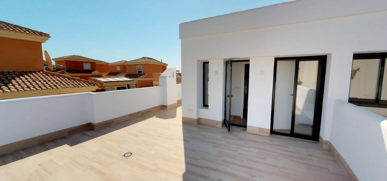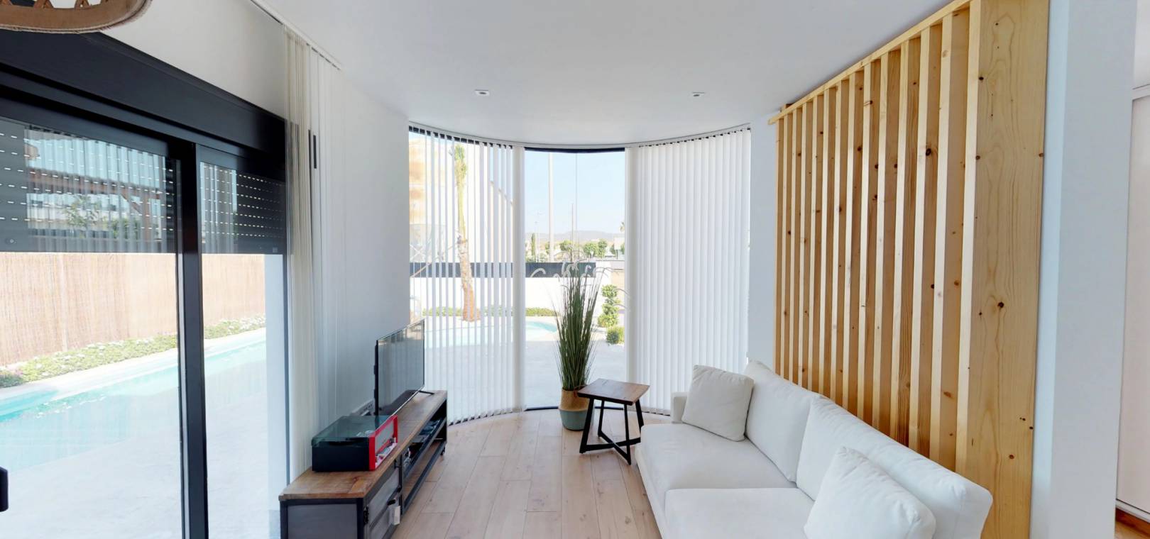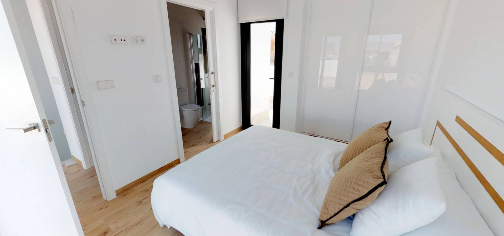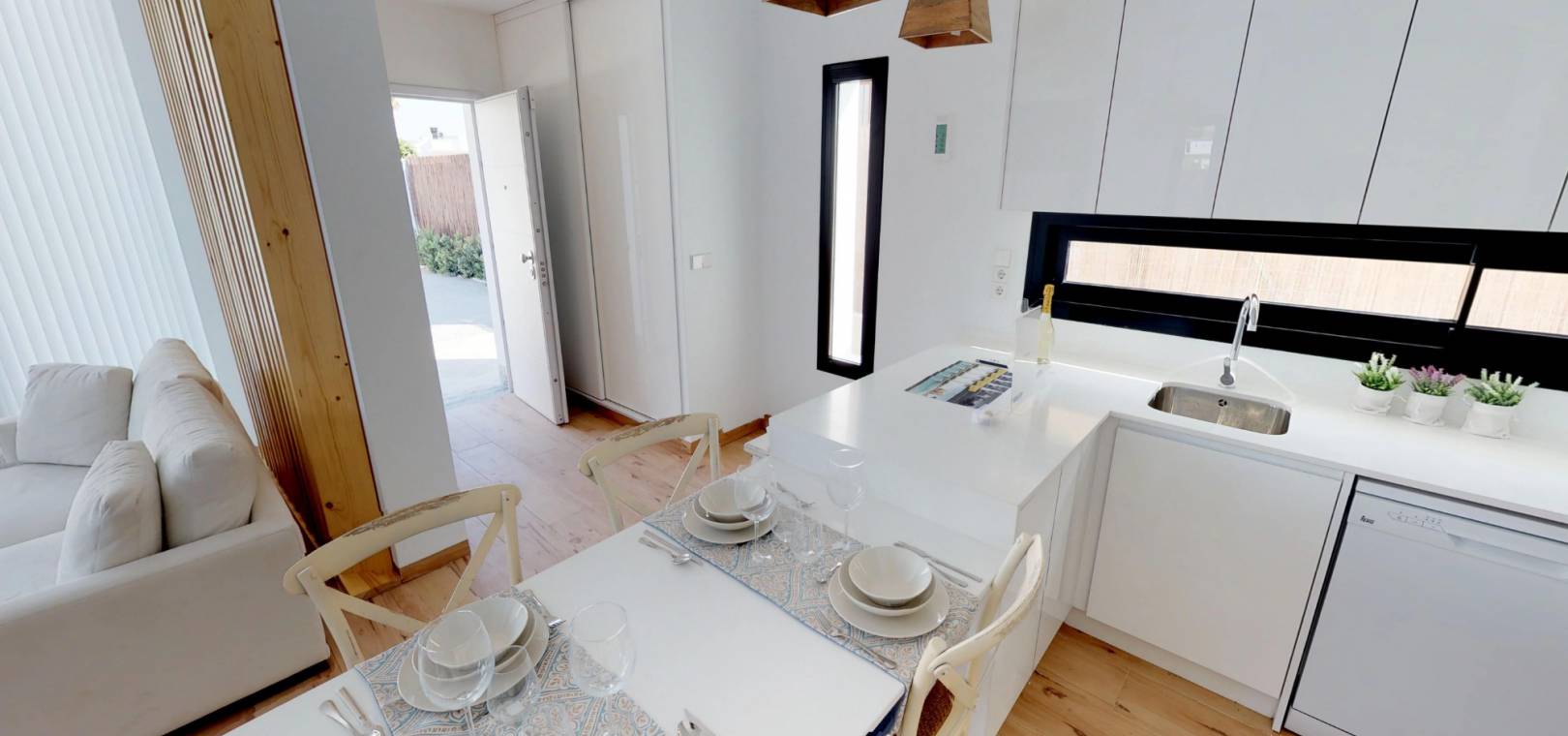 These stunning properties are cleverly designed with clean lines and lovely curves incorporated in the facade. The living area is open plan with the kitchen to the side with a back door and at the front is a feature curved bay window. The showhouse has an optional breakfast bar doubling as a dining table. There are 2 double bedrooms on the ground floor with built in wardrobes and patio door leading outside and a good sized shared bathroom. On the first floor, we have a larger master en-suite and access to a very large wrap around terrace/solarium. We have options to fully personalise the interior finishes with our choice of floor and bathroom tiles/cabinets. Externally the good sized plot is laid to concrete unless otherwise requested, to leave more room for planting etc, with a large lagoon style pool that has a jacuzzi feature. Off street parking to the front and the showhouse features an option outside kitchen and BBQ behind a motorised shutter.