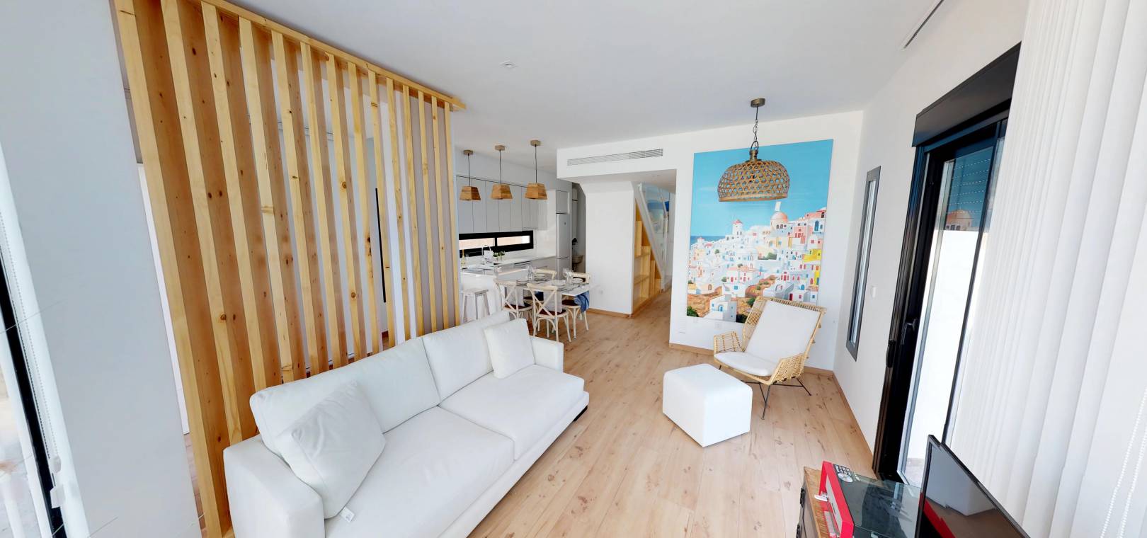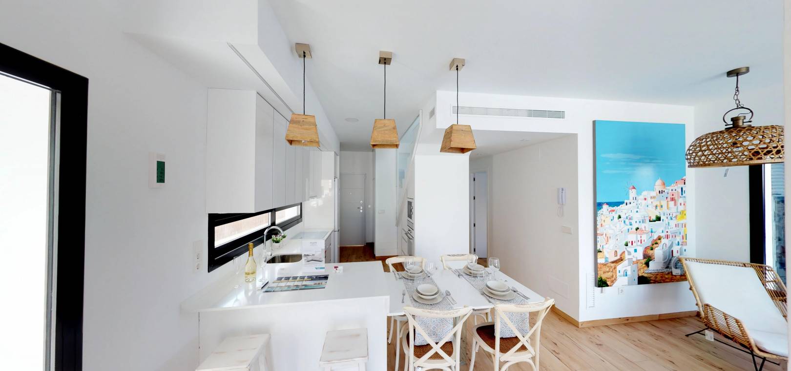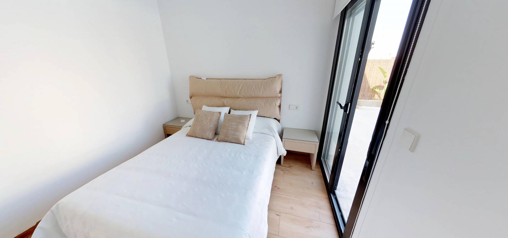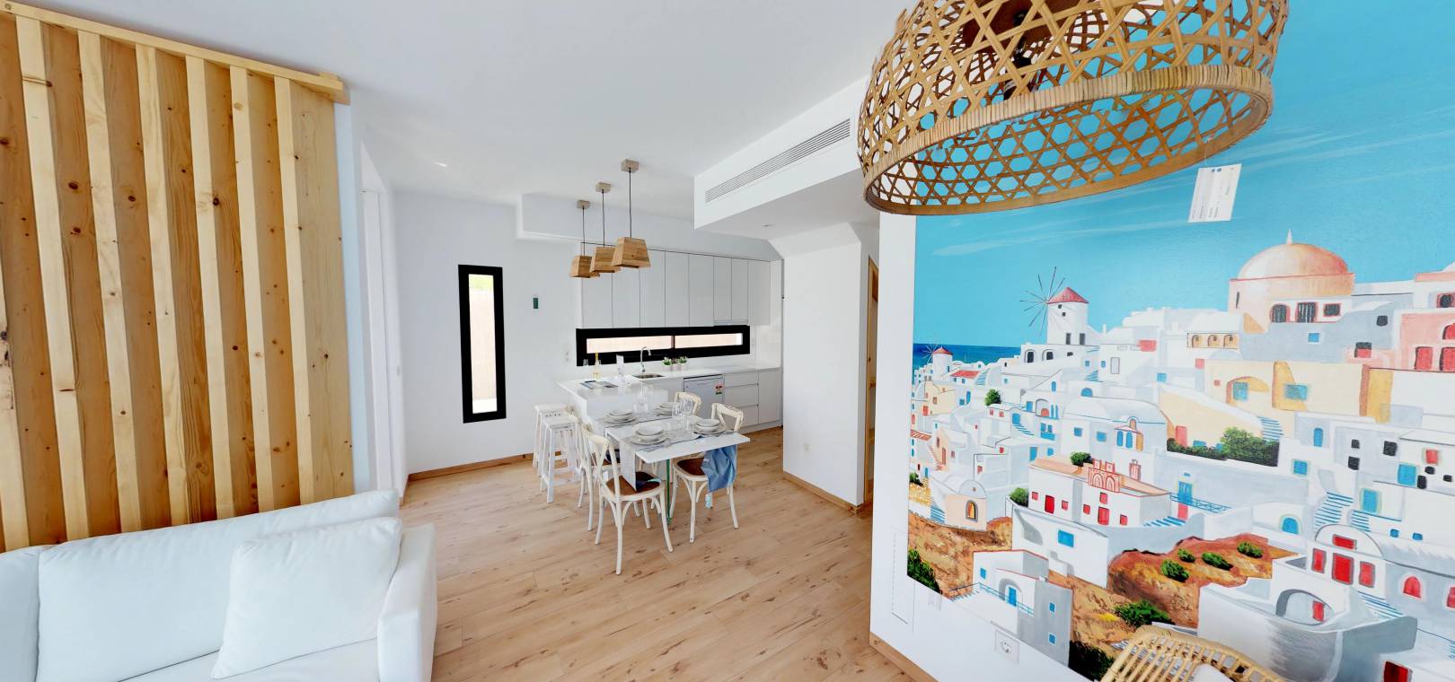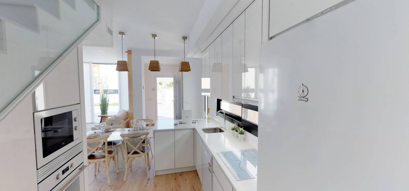 These stunning properties are cleverly designed with clean lines and lovely curves incorporated in the facade. The living area is open plan with the kitchen to the side with a back door and at the front is a feature curved bay window. The showhouse has an optional breakfast bar doubling as a dining table. There are 2 double bedrooms on the ground floor with built in wardrobes and patio door leading outside and a good sized shared bathroom. On the first floor, we have a larger master en-suite and access to a very large wrap around terrace/solarium. We have options to fully personalise the interior finishes with our choice of floor and bathroom tiles/cabinets. Externally the good sized plot is laid to concrete unless otherwise requested, to leave more room for planting etc, with a large lagoon style pool that has a jacuzzi feature. Off street parking to the front and the showhouse features an option outside kitchen and BBQ behind a motorised shutter.