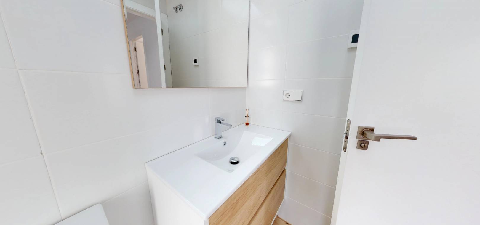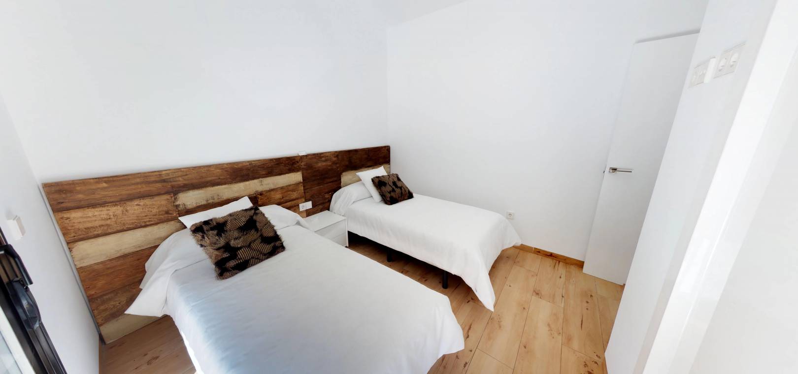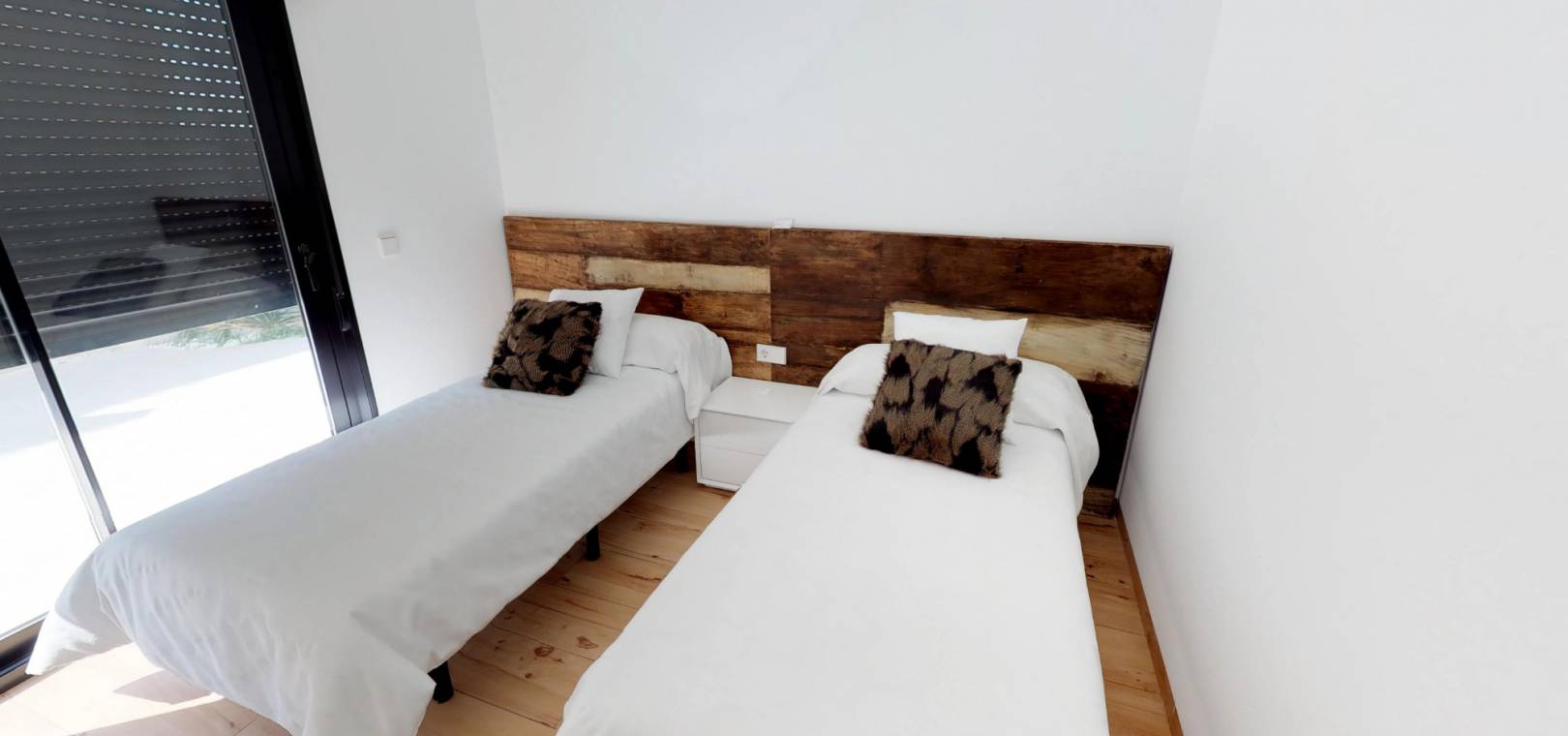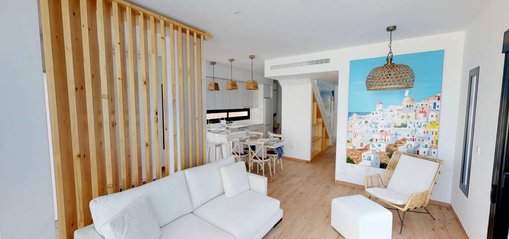 These stunning properties are cleverly designed with clean lines and lovely curves incorporated in the facade. The living area is open plan with the kitchen to the side with a back door and at the front is a feature curved bay window. The showhouse has an optional breakfast bar doubling as a dining table. There are 2 double bedrooms on the ground floor with built in wardrobes and patio door leading outside and a good sized shared bathroom. On the first floor, we have a larger master en-suite and access to a very large wrap around terrace/solarium. We have options to fully personalise the interior finishes with our choice of floor and bathroom tiles/cabinets. Externally the good sized plot is laid to concrete unless otherwise requested, to leave more room for planting etc, with a large lagoon style pool that has a jacuzzi feature. Off street parking to the front and the showhouse features an option outside kitchen and BBQ behind a motorised shutter.
