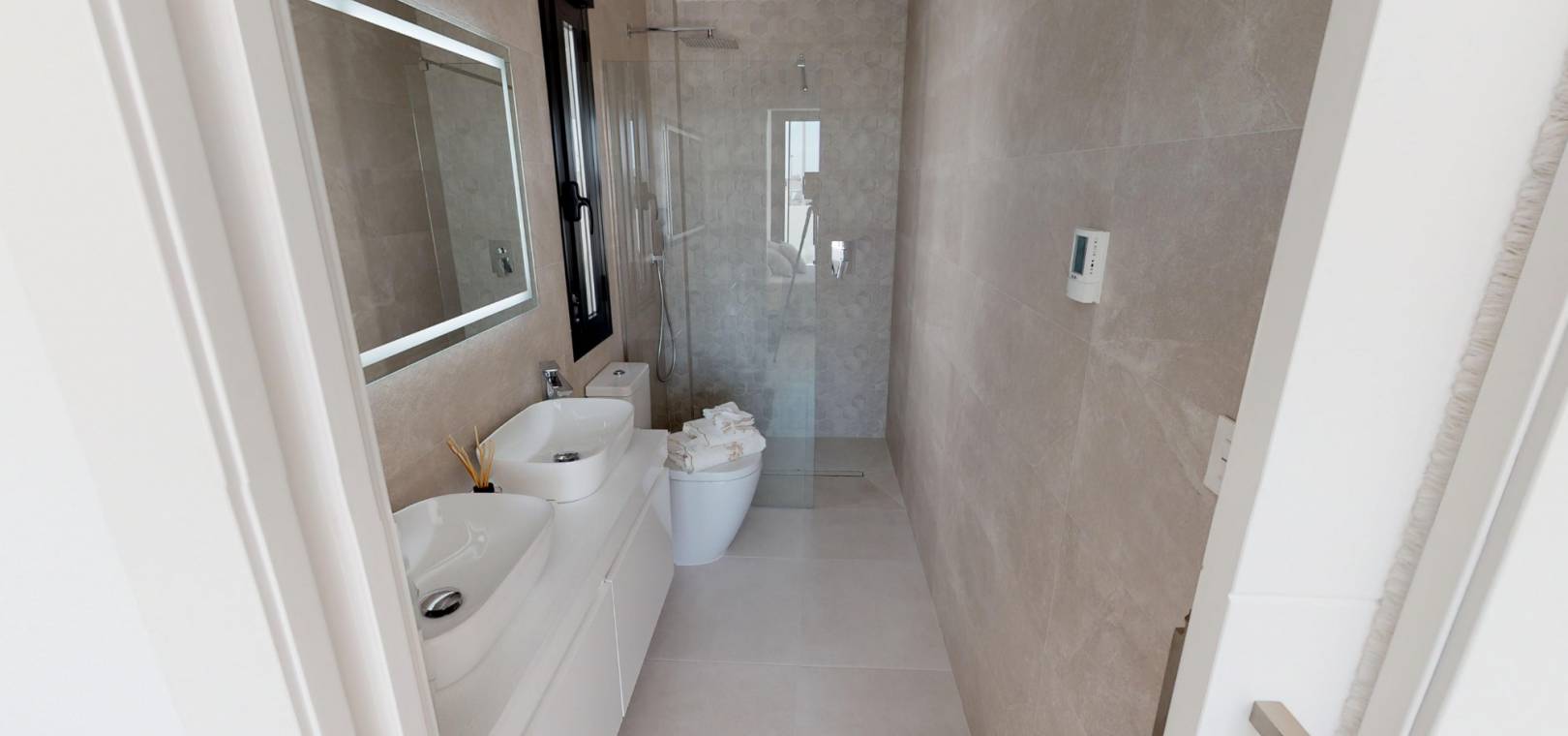 These modern 3-bedroom 3 bathroom properties are being constructed on a spacious c.200m2 plot with a fully landscaped low maintenance garden and plenty of space around the pool. The front door brings you into the living space with kitchen to the rear with a breakfast bar and access to the rear courtyard and the garage. The living room features large floor to ceiling patio doors leading to the front terrace and pool area. There is one bedroom and shared bathroom on the ground floor and a further 2 en-suites on the first floor, both suites have patio doors leading to the spacious terrace on the first floor.