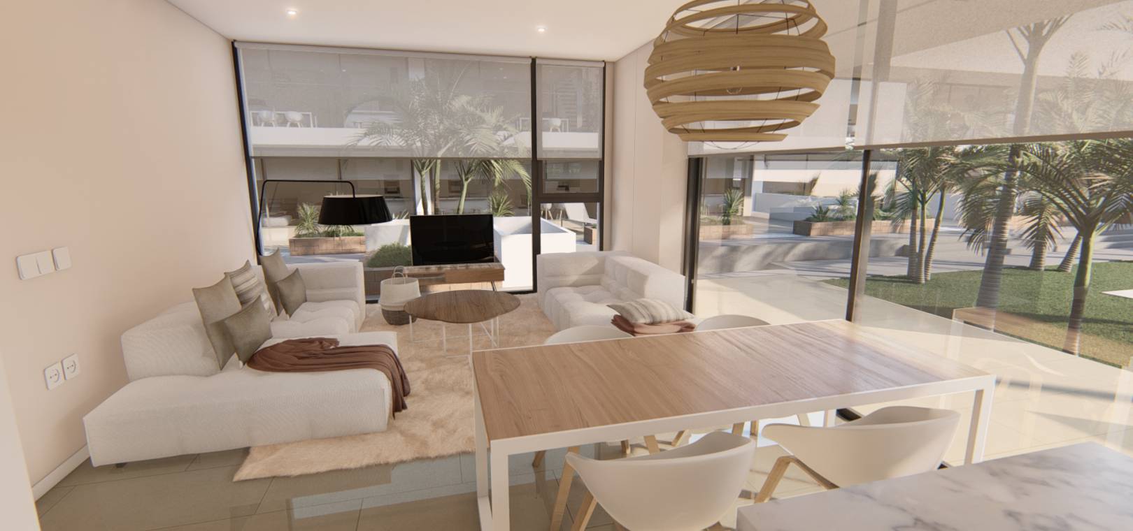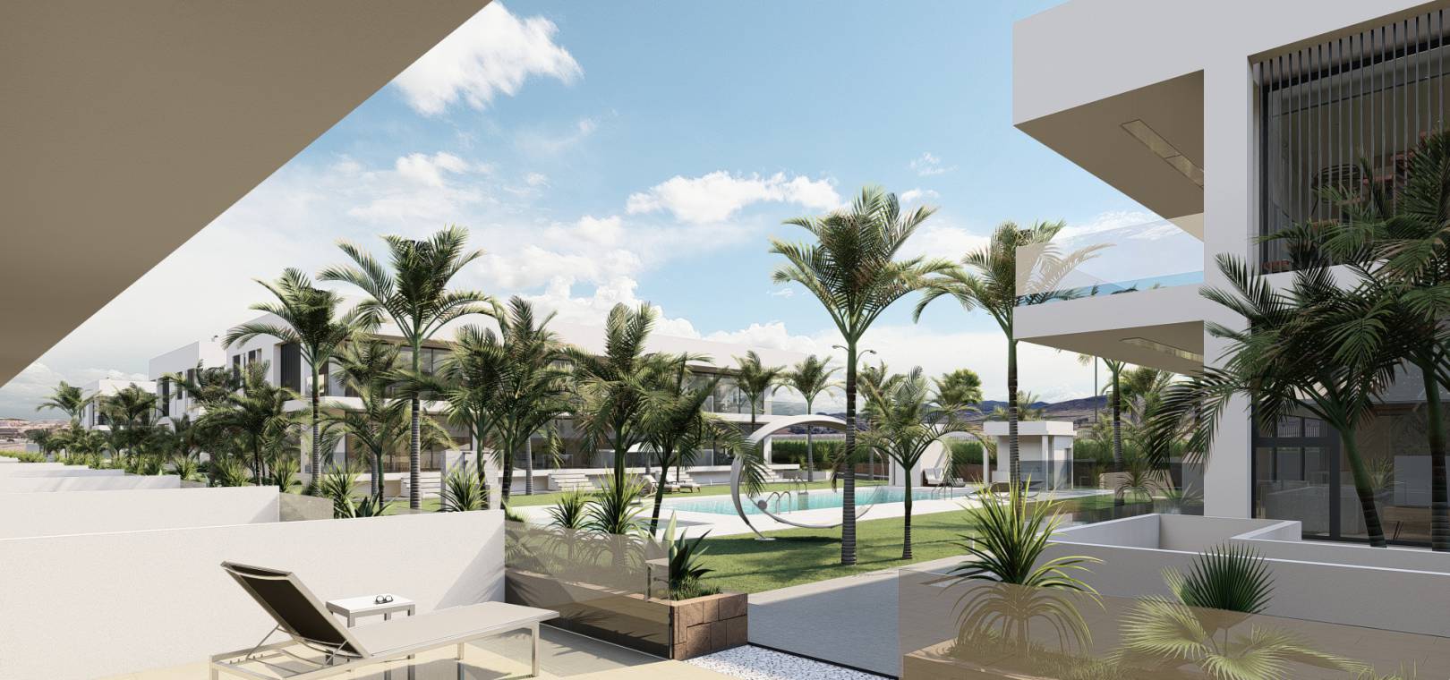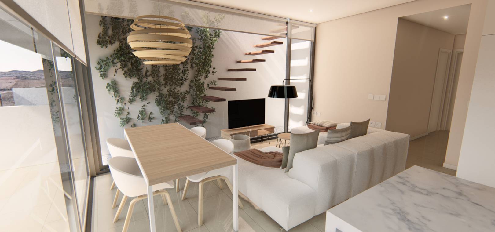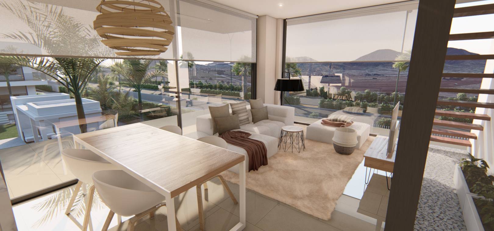 There are a total of 32 premium bungalow style apartments. 16 ground floor properties of 2 and 3 bedrooms with large patios and direct access to the pool area. 16 penthouses on the first floor with a large terrace and a large private solarium offering great views of the countryside and towards the sea. The developer is creating these spacious apartments with a premium feel, both in terms of the modern design and the quality of finishes, fixtures and fittings. Both the 2 and 3 bedroom models have a wide front aspect with large, full-width patio doors allowing lots of light into the properties, an open plan kitchen with an island, dining and living room leading directly to the large terrace. The spacious master ensuite bedrooms each enjoy a good sized walk-in wardrobe and spacious bathrooms. With a further shared bathroom and 1 or 2 guests rooms, a separate utility room, making up the rest of the accommodation.