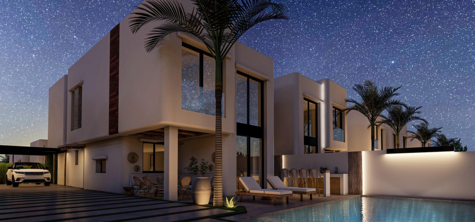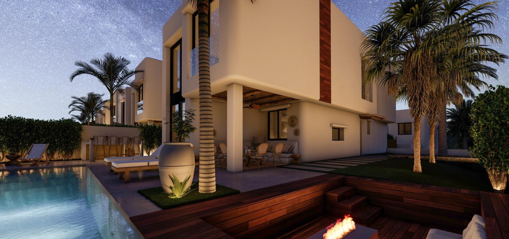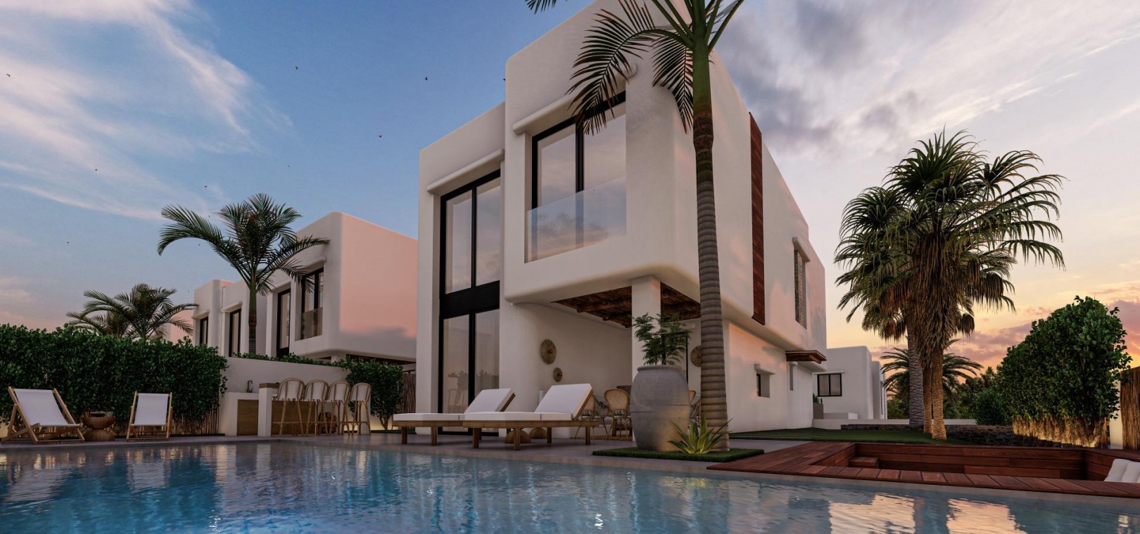 These 17 villas have been thoughtfully designed to combine contemporary comfort with the timeless elegance of Ibizan architecture. White facades, natural woods such as pine and sabina, and stone elements capture the bright Mediterranean light. Each home comes with a private plot, landscaped garden, and a private swimming pool with an integrated jacuzzi. Spacious terraces, a barbecue area, and an outdoor bar create the ideal environment for enjoying the Mediterranean lifestyle year-round.