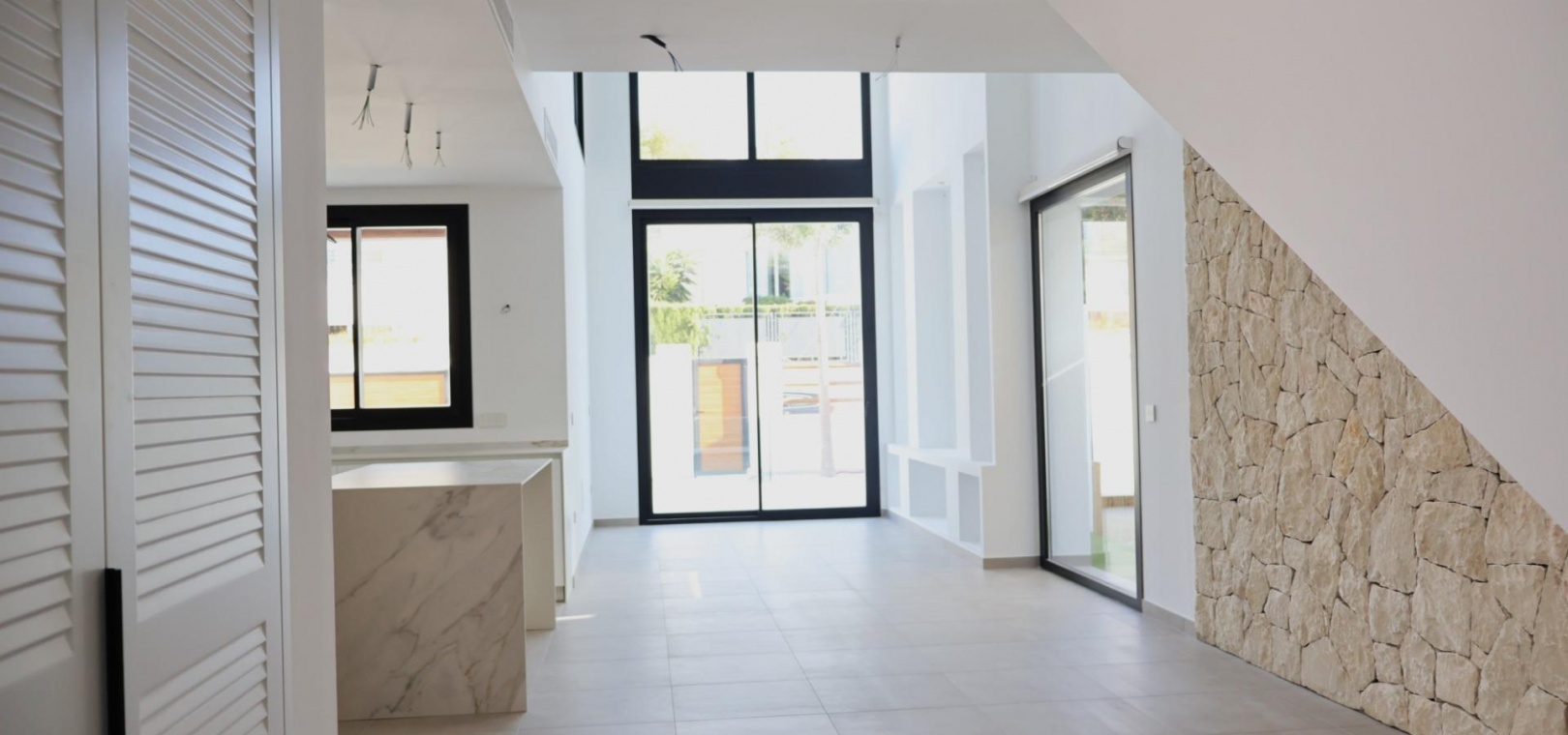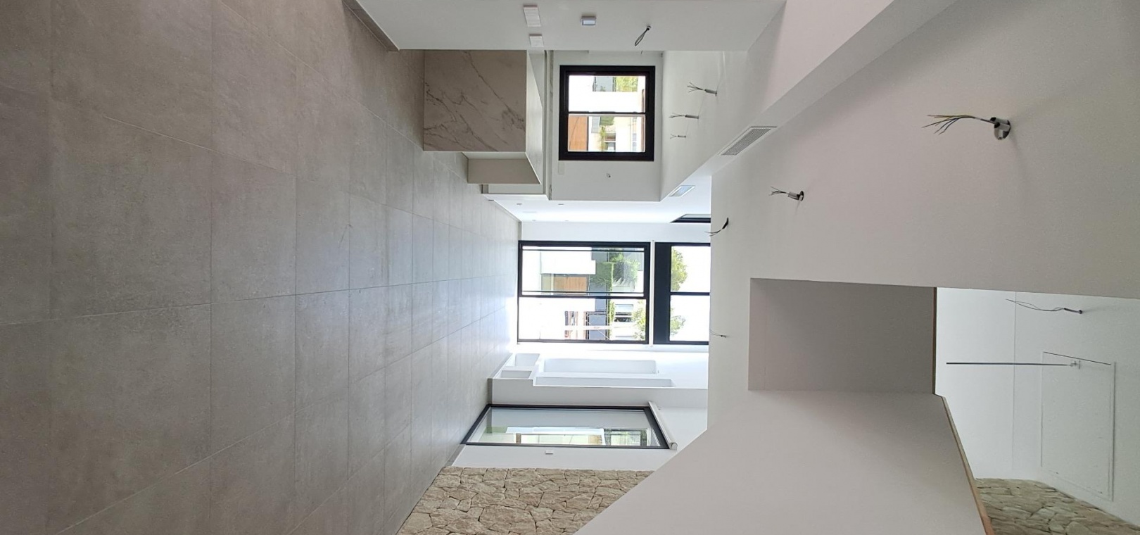 The villas offer four generous bedrooms, three bathrooms, and a guest toilet distributed across two floors. The open-plan living and dining area features double-height ceilings that enhance natural light and create an airy, inviting atmosphere. Additional highlights include an interior garden with a skylight, a wine cellar, and a floating staircase that adds a touch of architectural elegance. Kitchens come fully furnished with upper and lower cabinets and high-quality appliances, while electric roller blinds in the bedrooms provide both comfort and convenience.